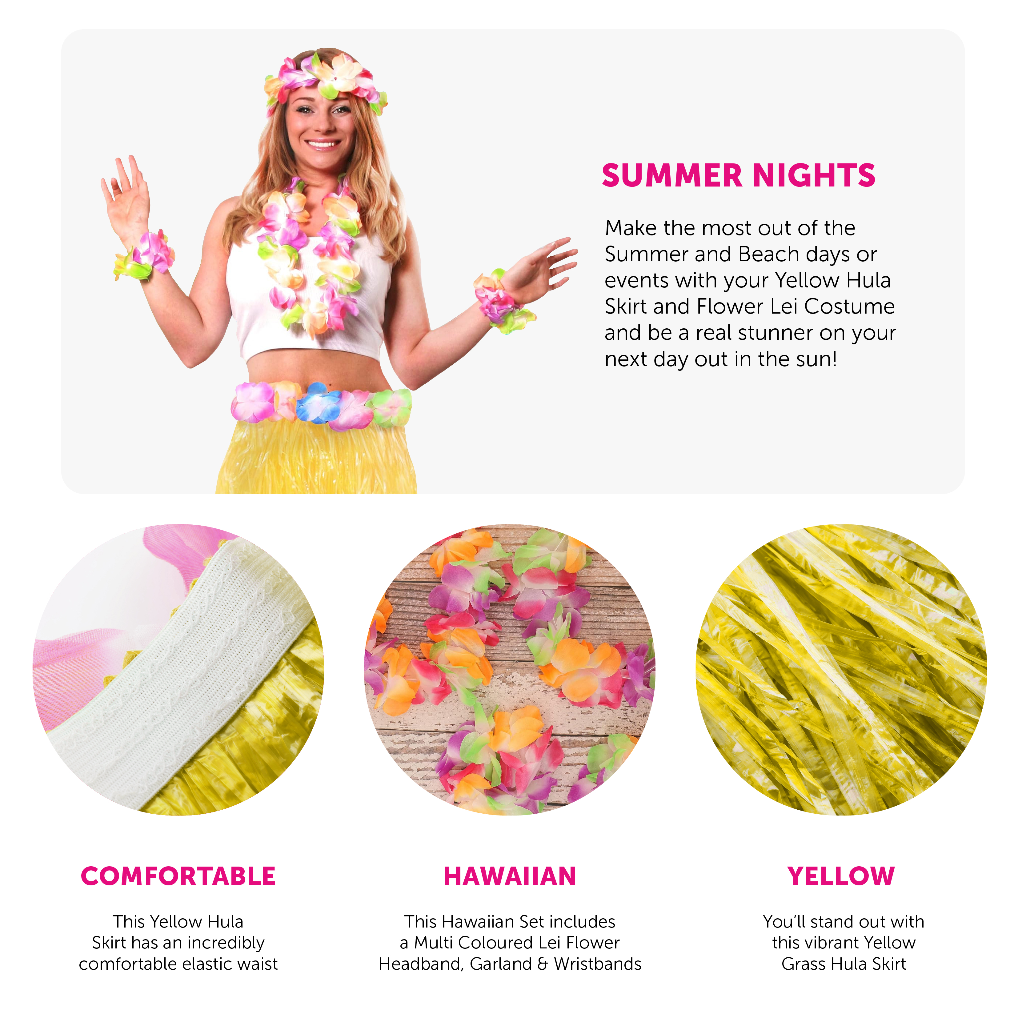 COSTUME DETAILS: Your Costume includes a short grass-like Yellow Hula Skirt with an elasticated waistband, with multi coloured decorative Hawaiian Lei Flowers around the waist, and a 4 Piece Multi coloured Hawaiian Lei Flower Necklace, Headband and Wristband Set, all tropical and ready for the beach!