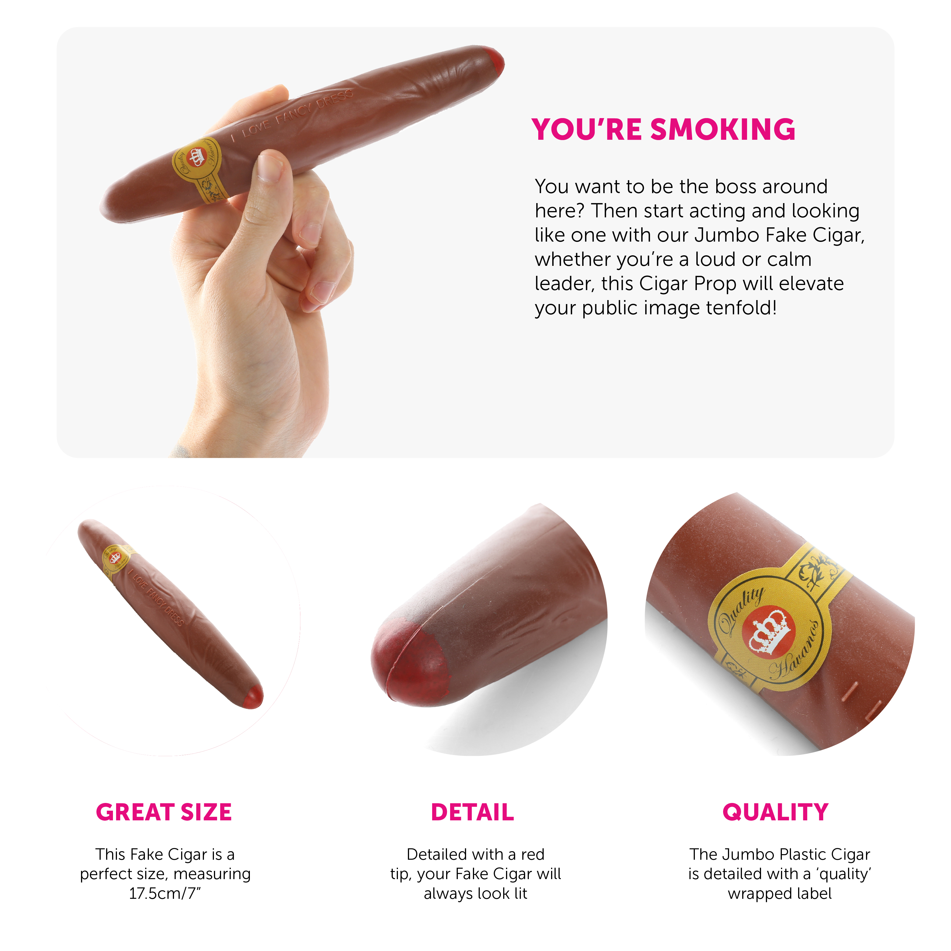 JUMBO PROP CIGAR: You want to be the boss around here? Then start acting and looking like one with our Jumbo Fake Cigar, whether you’re a loud or calm leader, this Cigar Prop will elevate your public image tenfold!