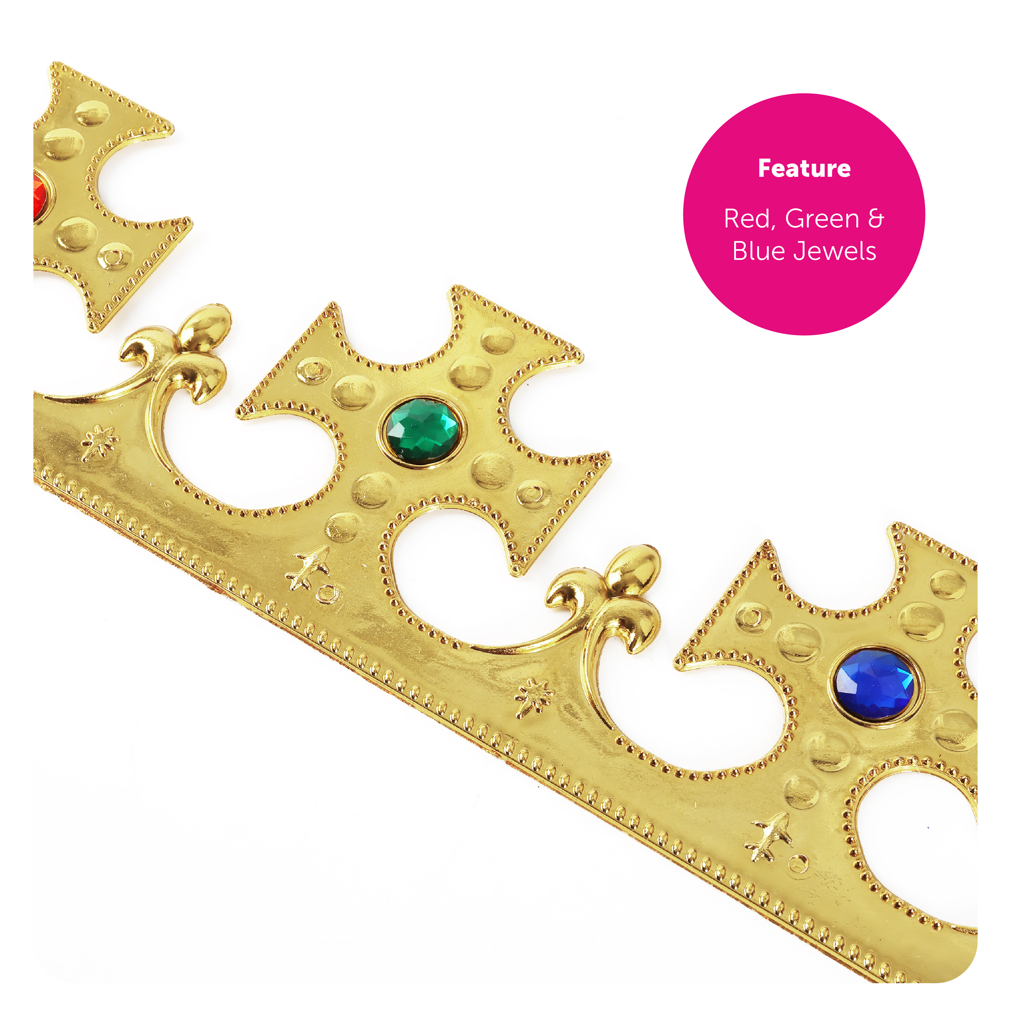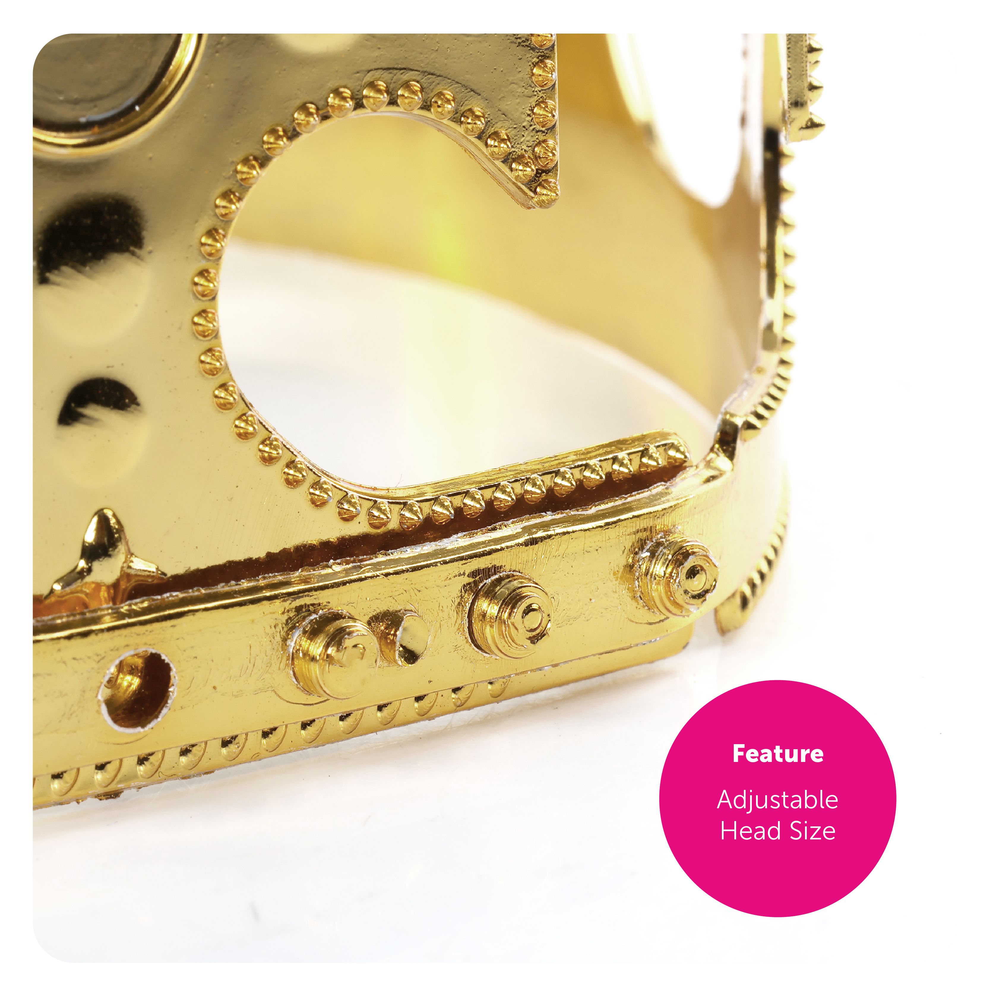 CROWN DETAILS: Your King's Crown is an adjustable Gold Plastic Crown with Blue, Green and Red Jewels attached to add some flair to any event or occasion!