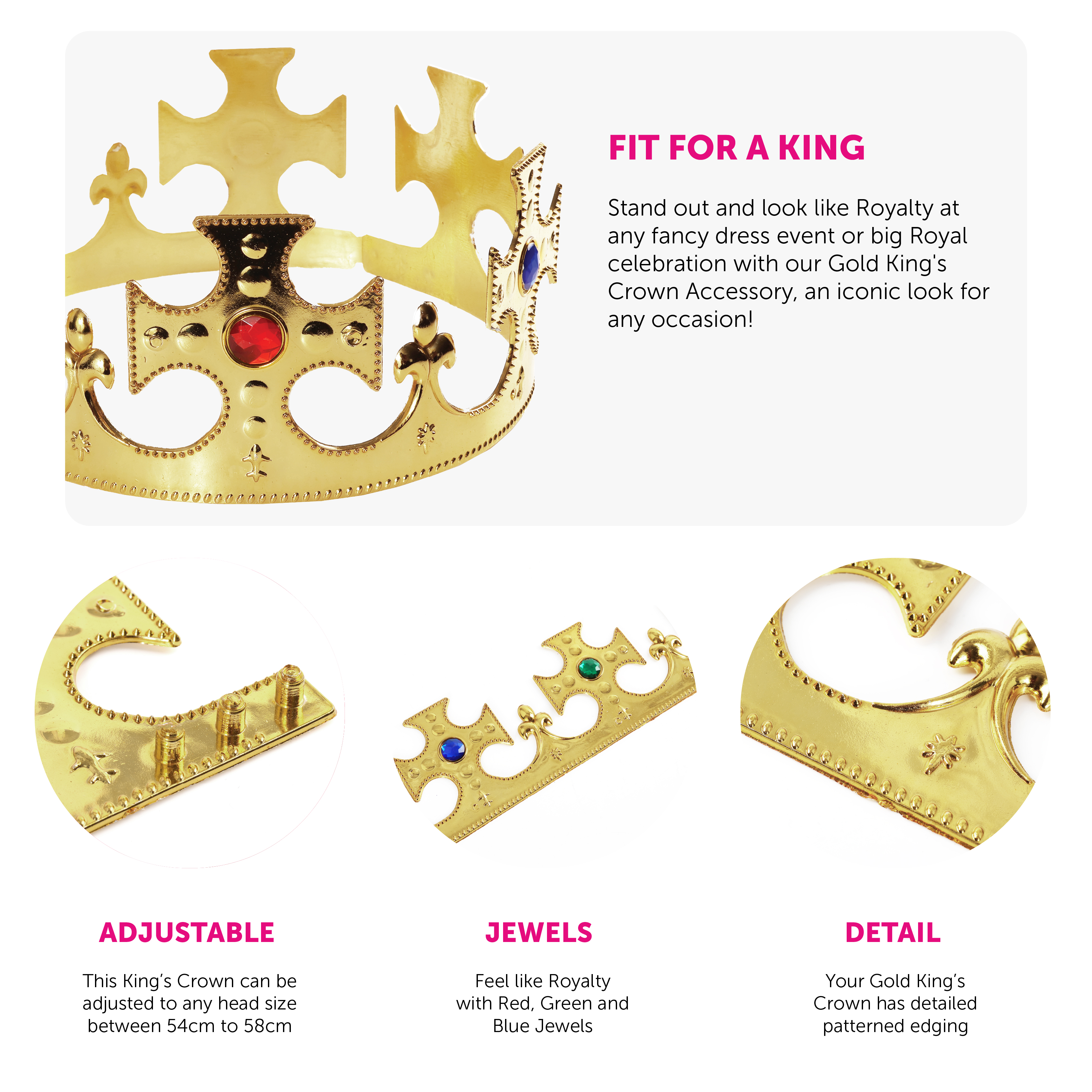 GOLD KING'S CROWN: Stand out and look like Royalty at any fancy dress event or big Royal celebration with our Gold King's Crown Accessory, an iconic look for any occasion!