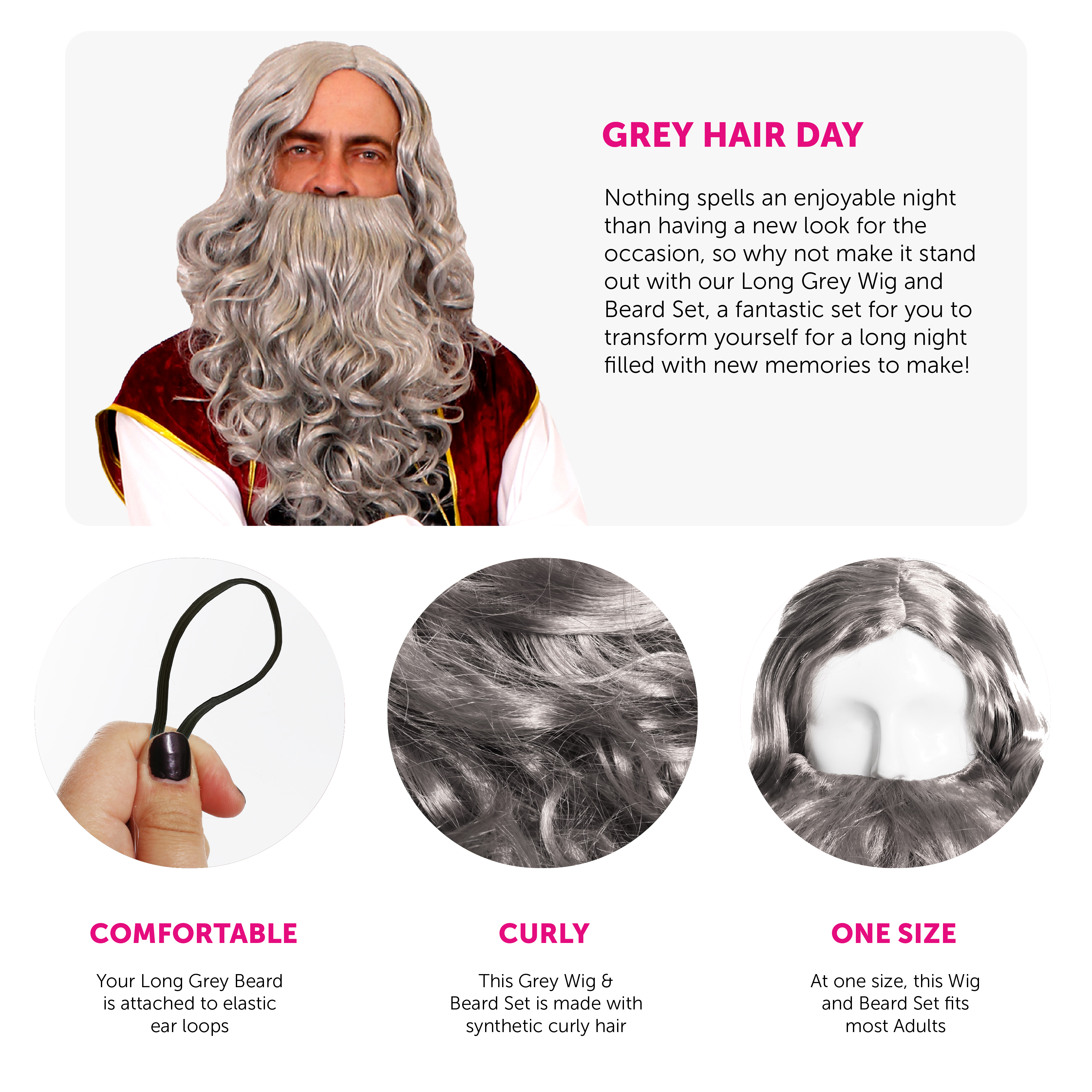 SET DETAILS: This Set includes a Long Haired Grey Curly Wig and a matching Grey Beard with elasticated ear loops for you to wear comfortably!