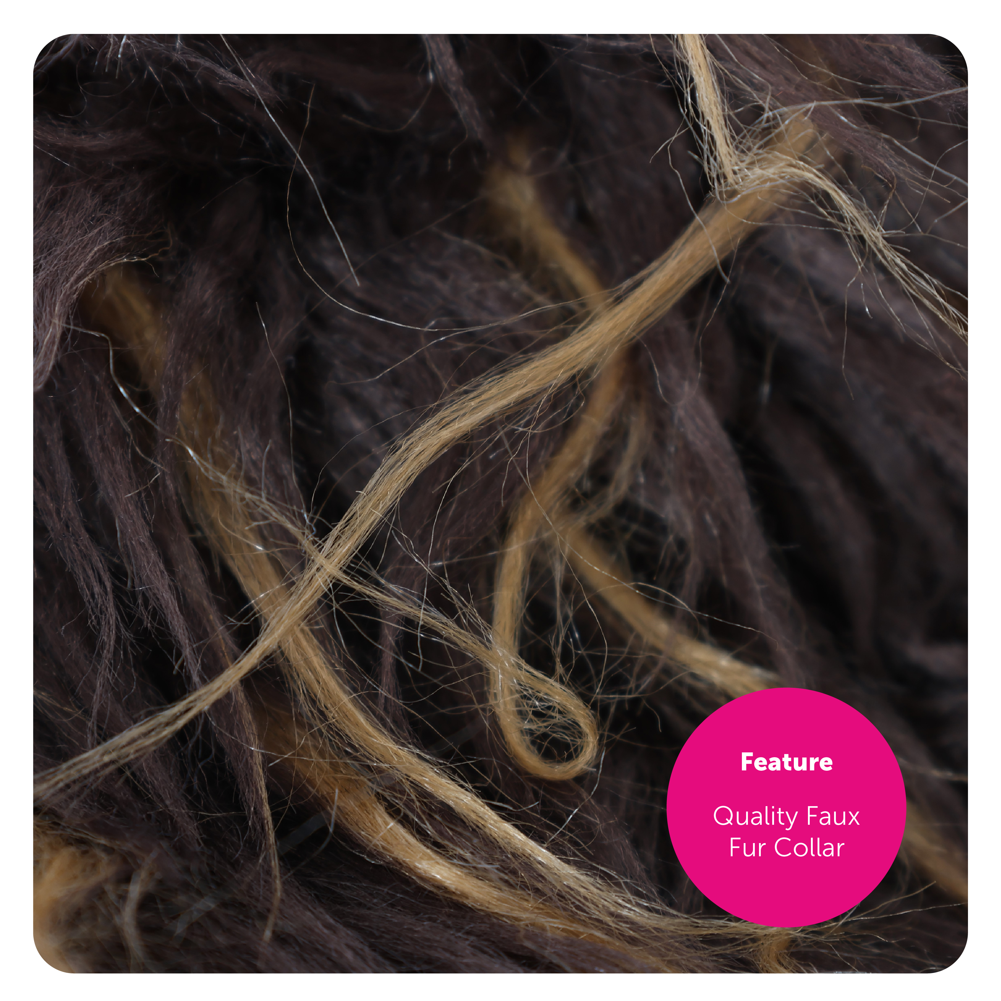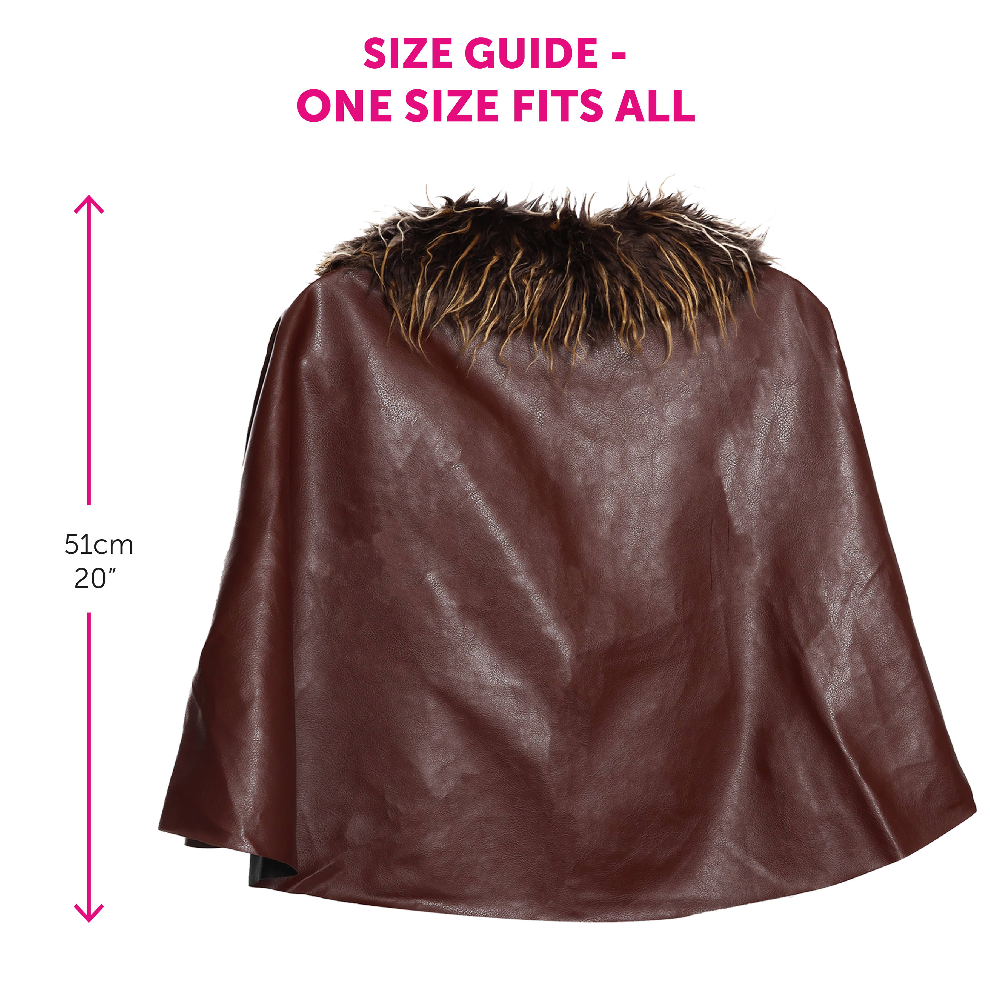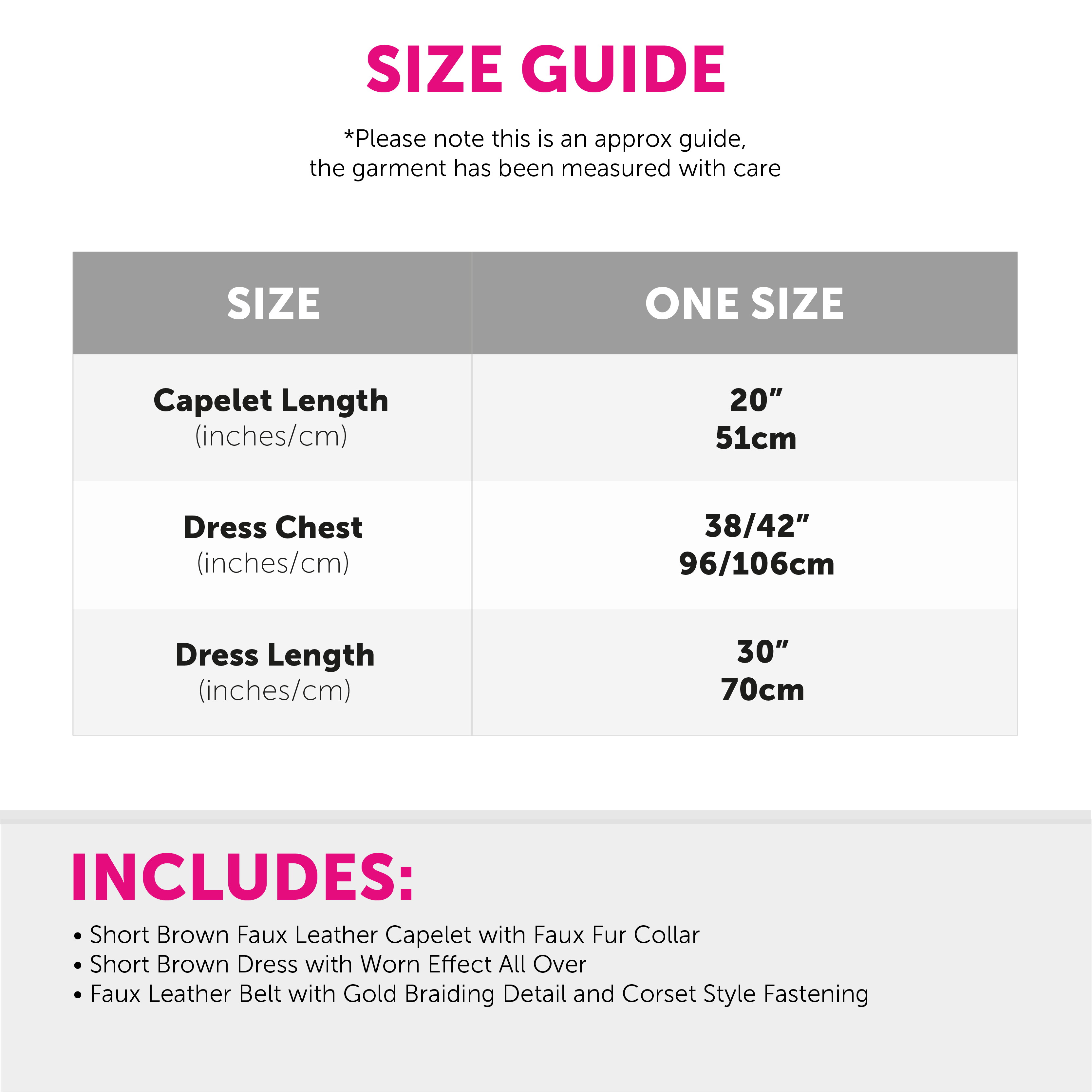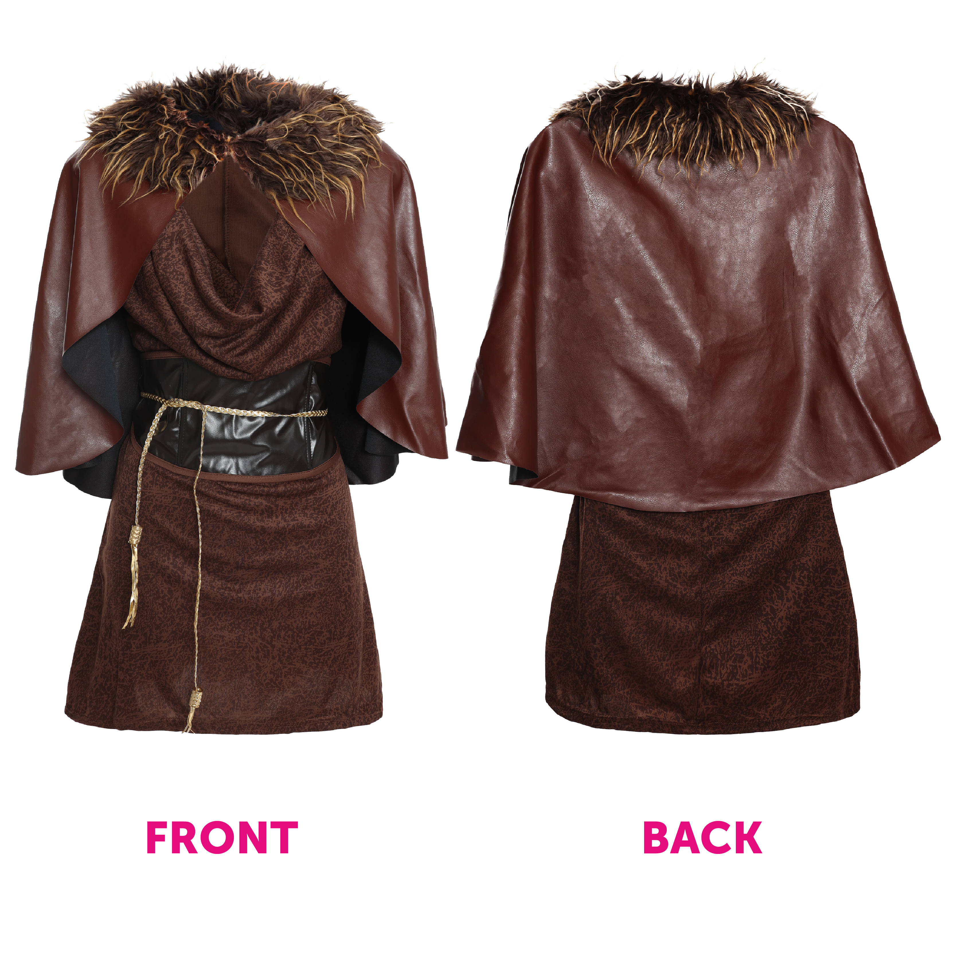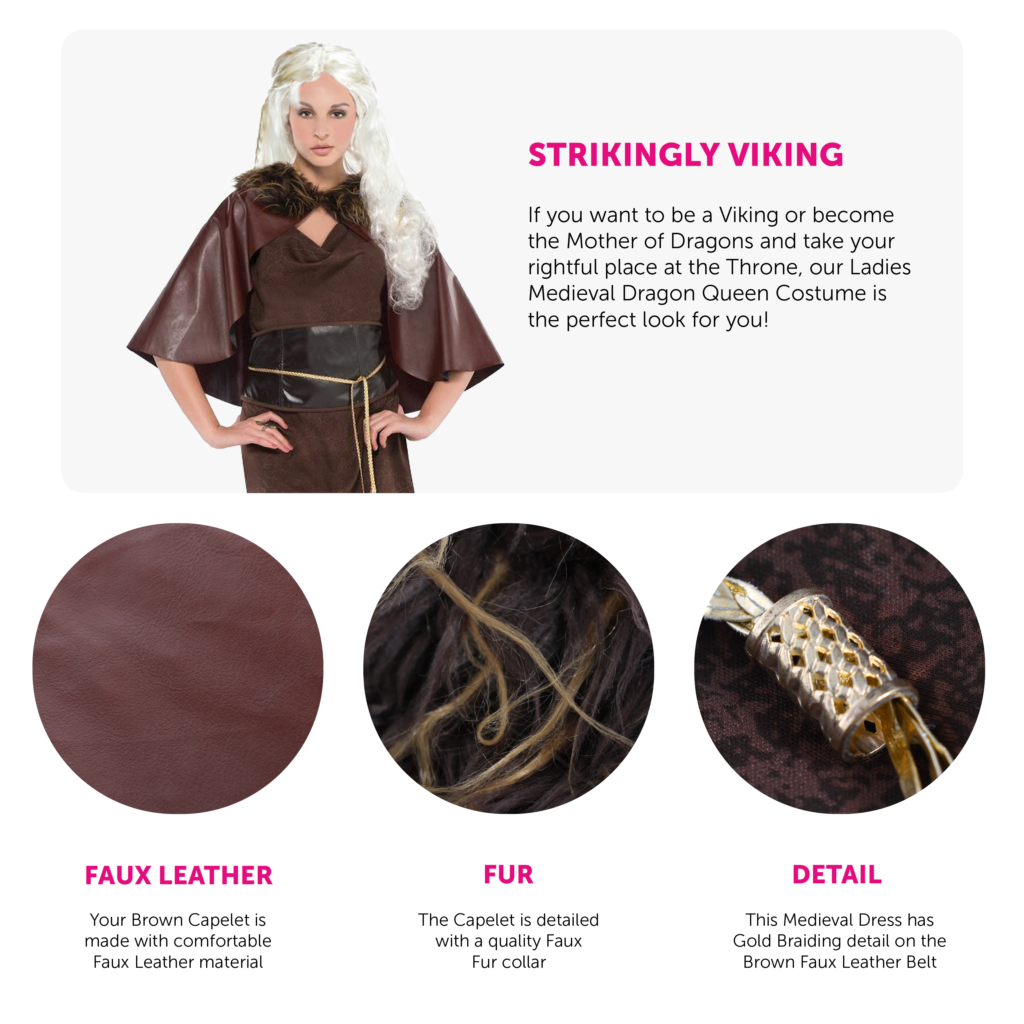 COSTUME DETAILS: Your Ladies Medieval Dragon Queen Costume includes a loose fitting, short Brown Dress with a rough, worn effect all over, a Faux Leather Belt with Corset style fastening and Gold Braiding detail, and a miniature Brown, Faux Leather Cape with a Faux Fur Collar!