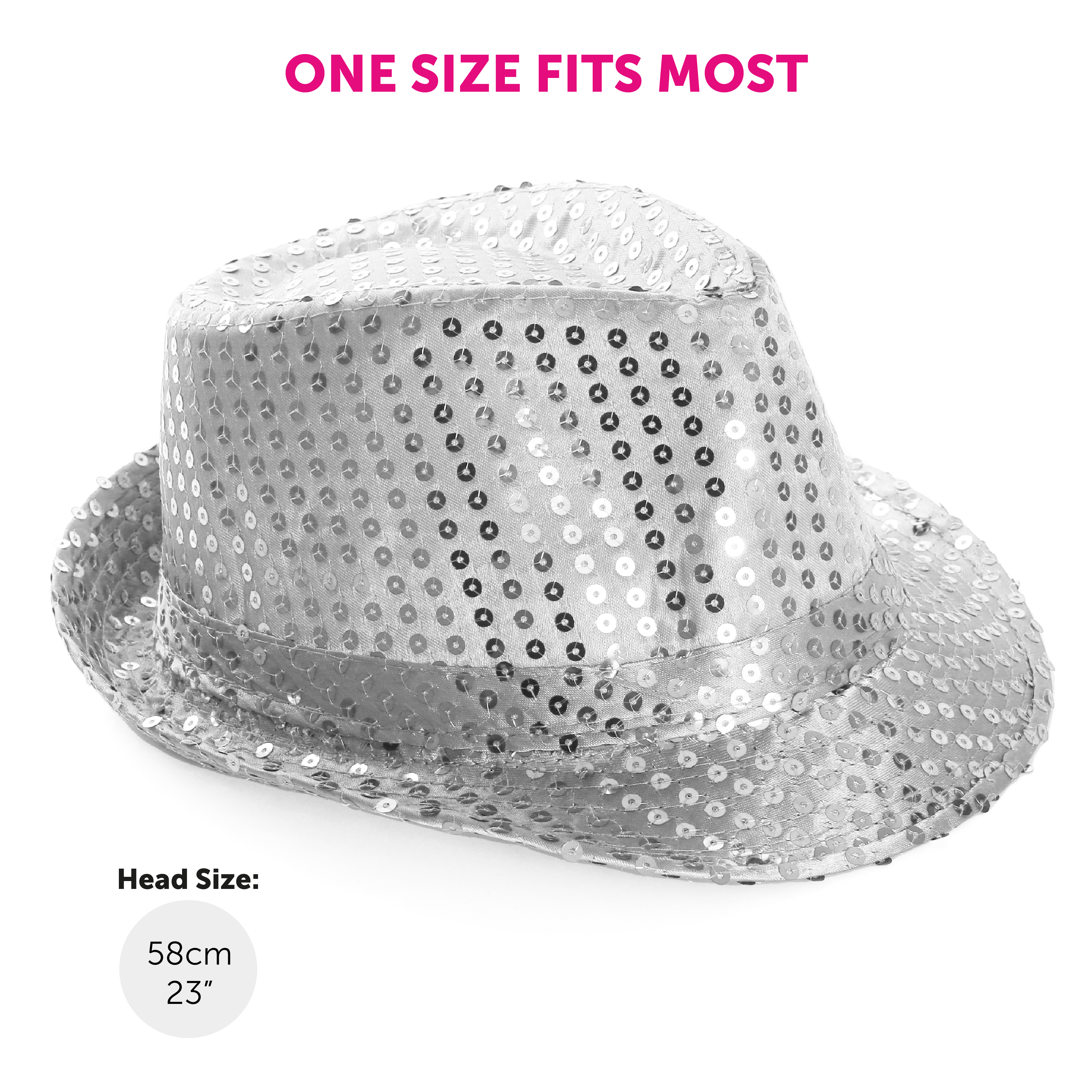 ONE SIZE FITS MOST: Your Silver Sequin Trilby Hat is designed as a comfortable one size fits most, with the head size measuring 58cm (23"), incredibly comfortable for most!