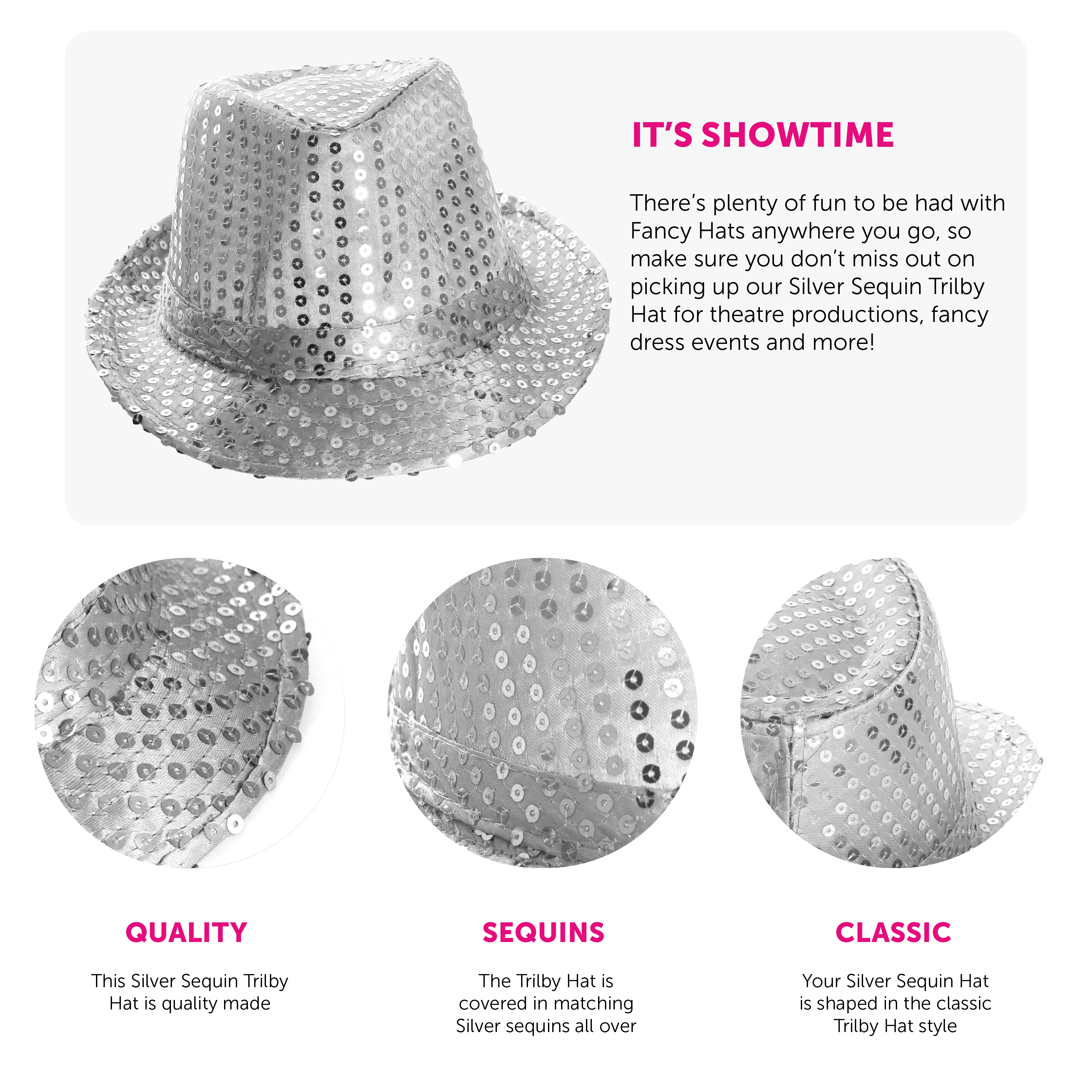 SILVER SEQUIN TRILBY HAT: There’s plenty of fun to be had with Fancy Hats anywhere you go, so make sure you don’t miss out on picking up our Silver Sequin Trilby Hat for theatre productions, fancy dress events and more!