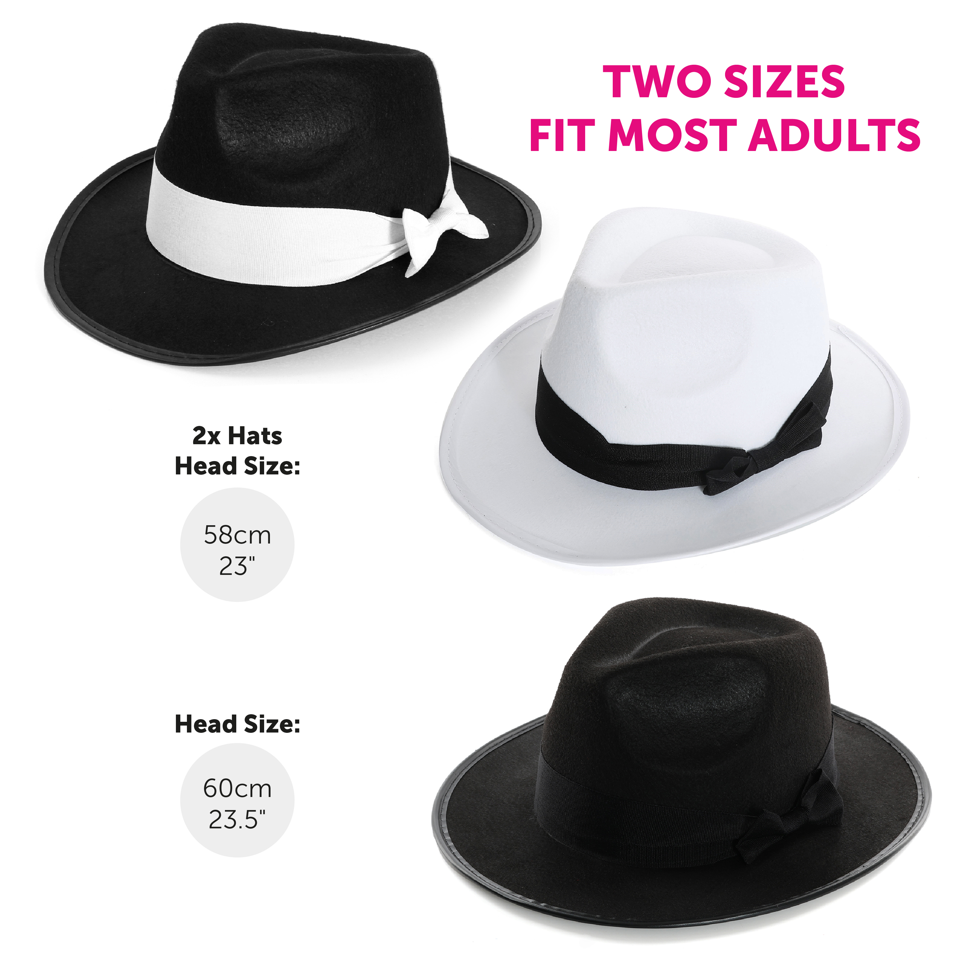 FITS MOST ADULTS: The Black Gangster Hat with a White Band is suitable for Adults with a head size up to 58cm (23"), the White Gangster Hat and Black Gangster Hat with a Black Band are suitable for Adults with a head size up to 60cm (23.5")