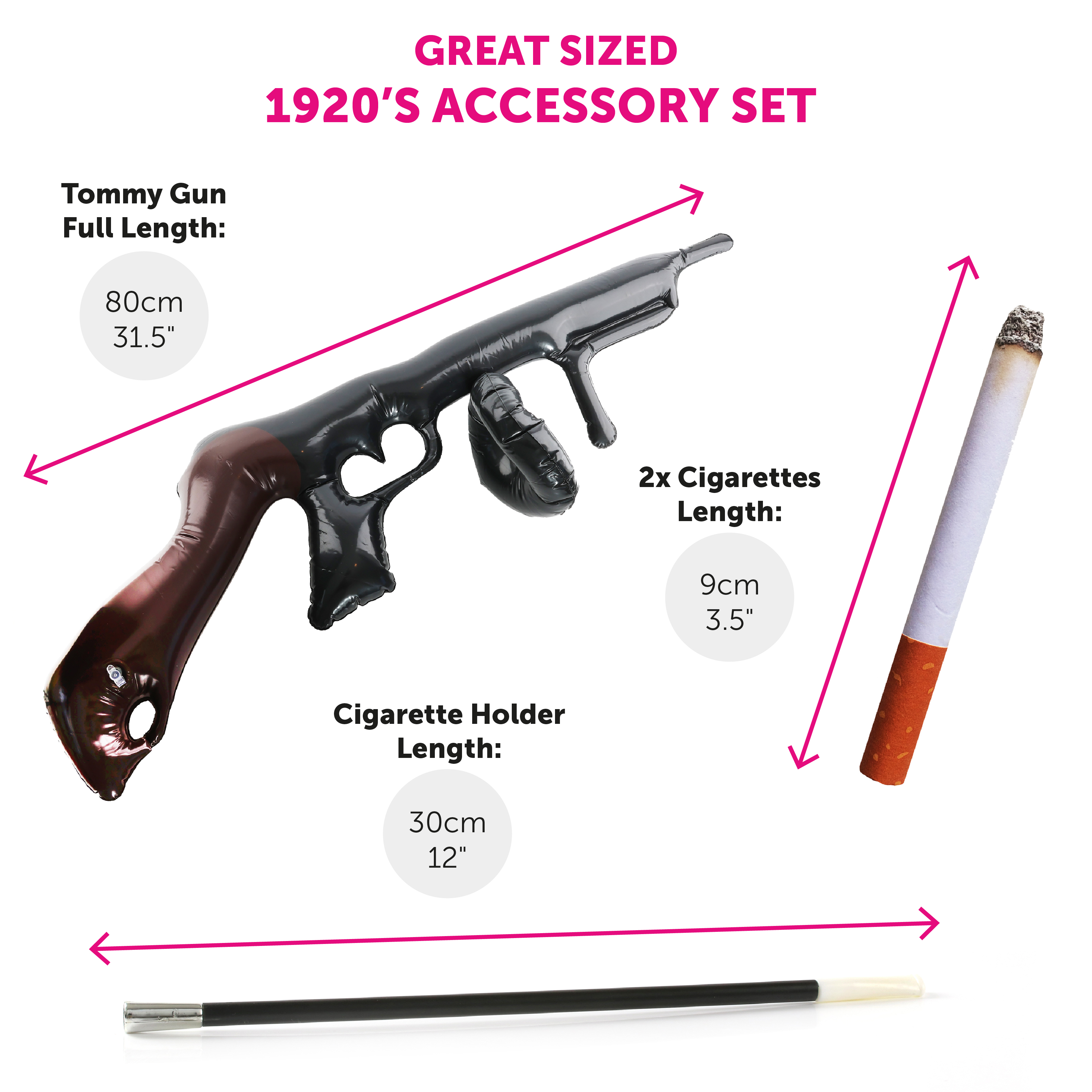 GREAT SIZED ACCESSORIES: The accessories included in this Photo Booth Party Pack are all a great size; the Inflatable Tommy Gun measures a full length of 80cm (31.5"), the Fake Cigarette props both measure 9cm (3.5"), and the Cigarette Holders measure a full length of 30cm (12")
