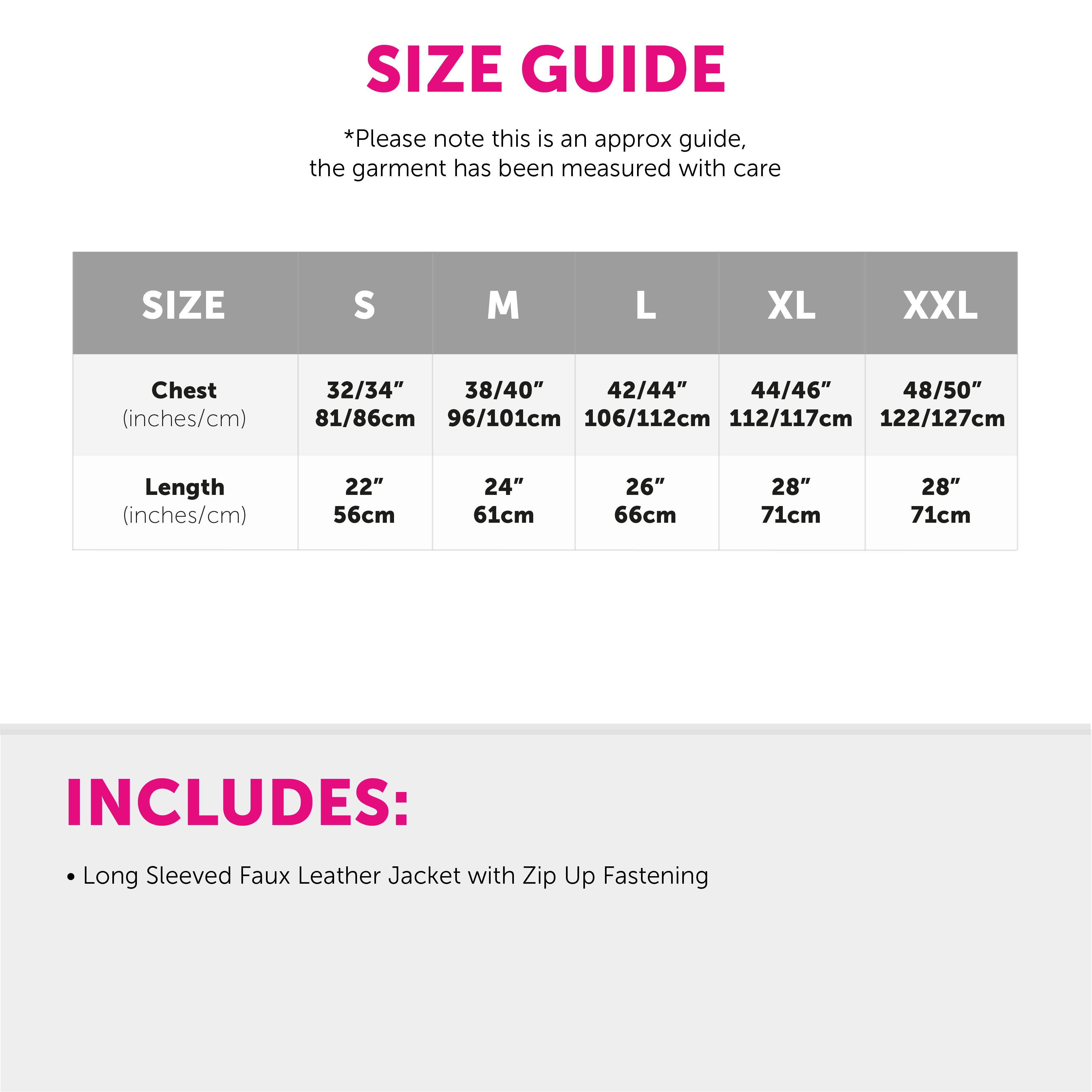 AVAILABLE IN MULTIPLE SIZES: Your Adults Leather Jacket is available in sizes Small to XX-Large: Small - Chest 32/34" (81/86cm), Length 22" (56cm) | Medium - Chest 38/40" (96/101cm), Length 24" (61cm) | Large - Chest 42/44" (106/112cm), Length 26" (66cm) | X-Large - Chest 44/46" (112/117cm), Length 28" (71cm) | XX-Large - Chest 48/50" (122/127cm), Length 28" (71cm)