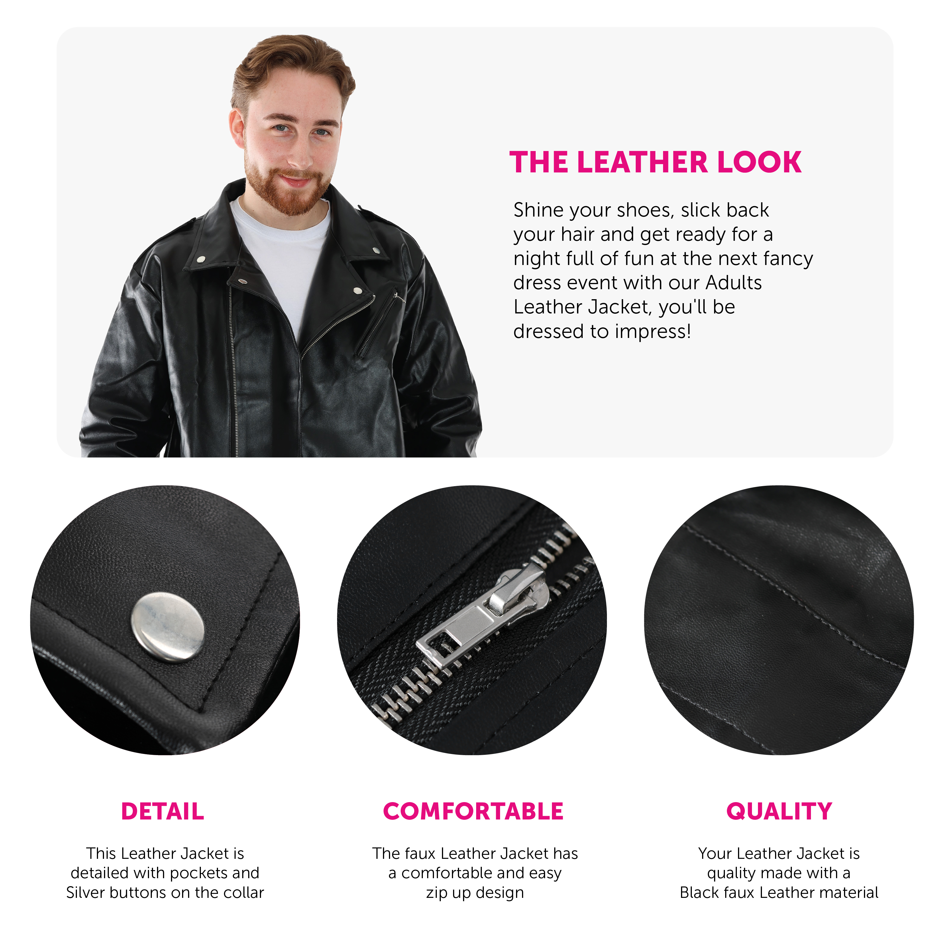 ADULTS LEATHER JACKET: Shine your shoes, slick back your hair and get ready for a night full of fun at the next fancy dress event with our Adults Leather Jacket, you'll be dressed to impress!