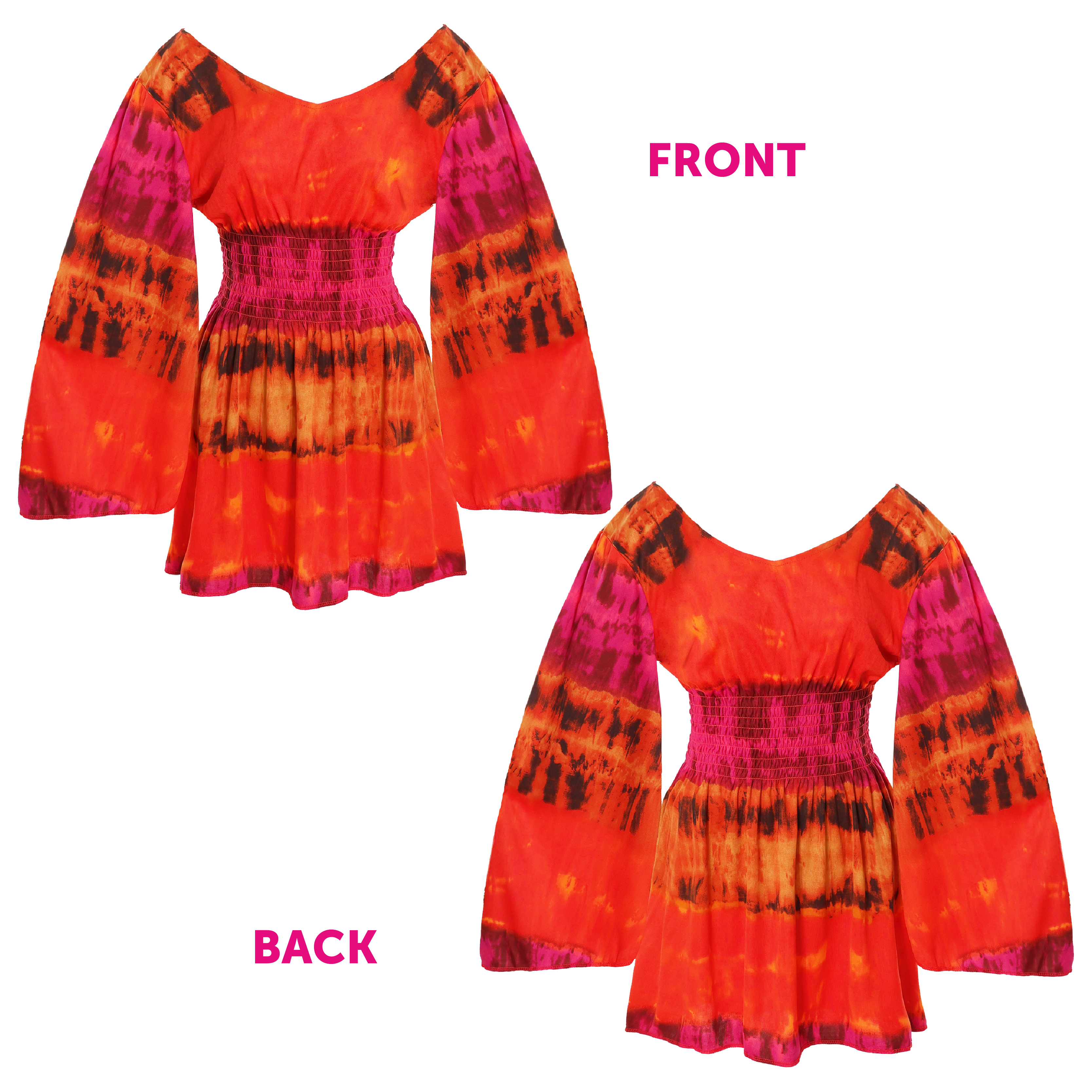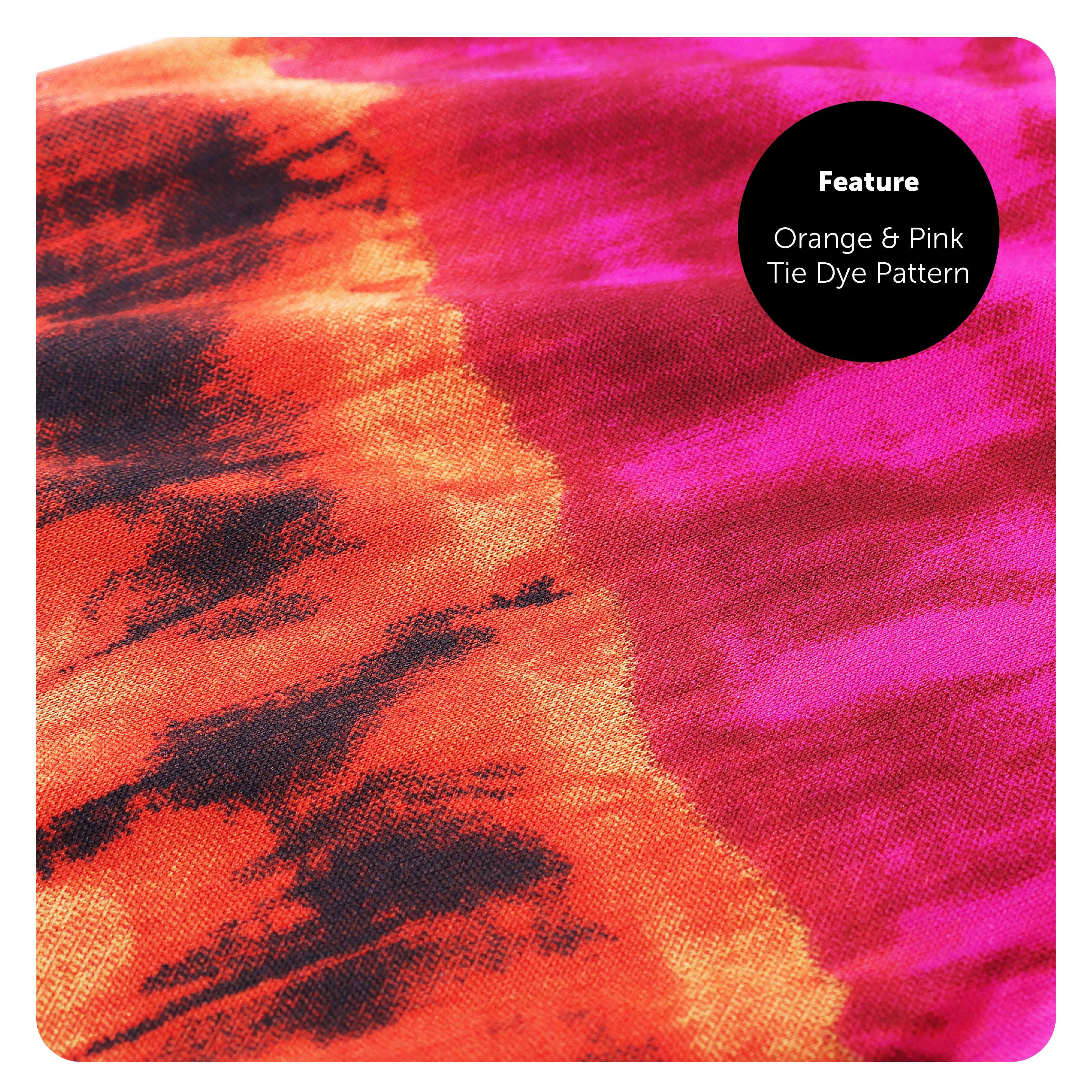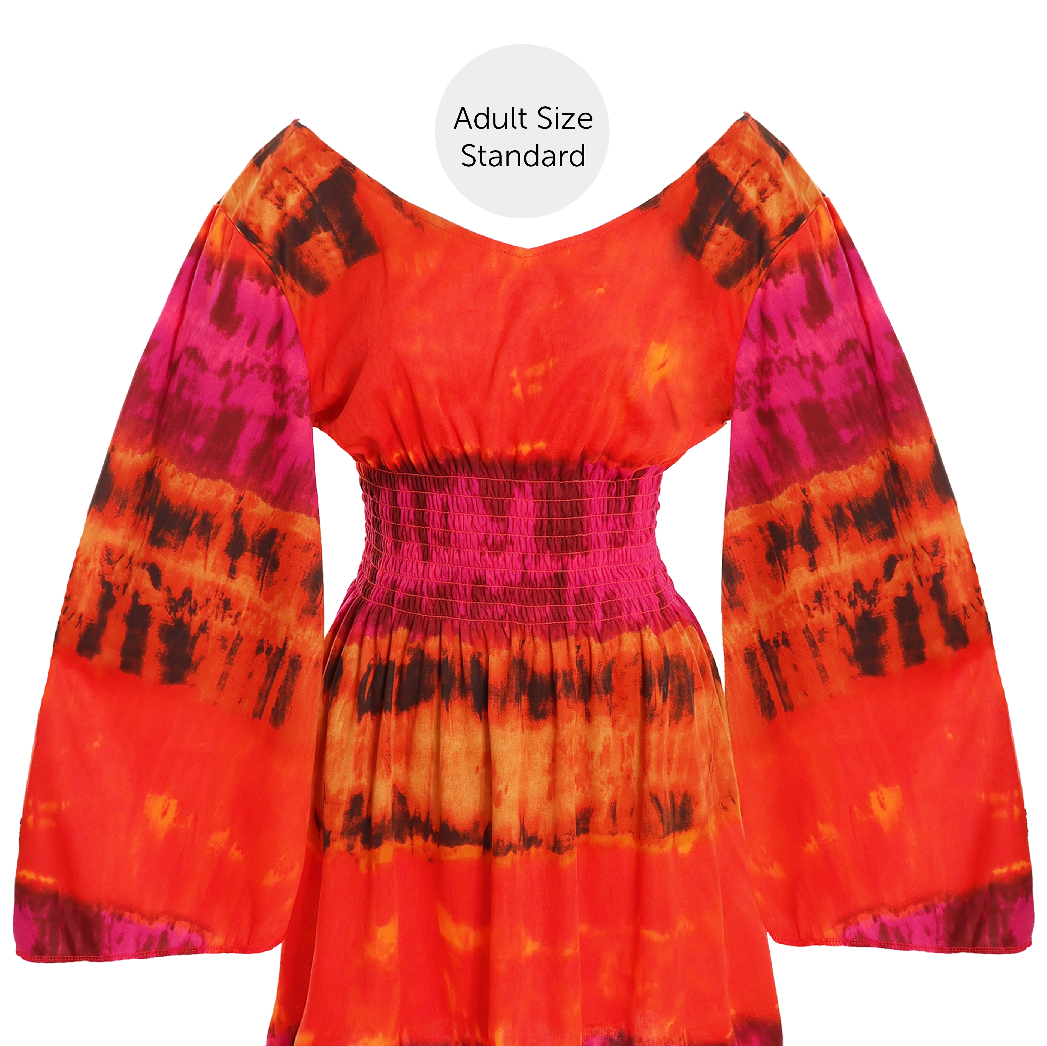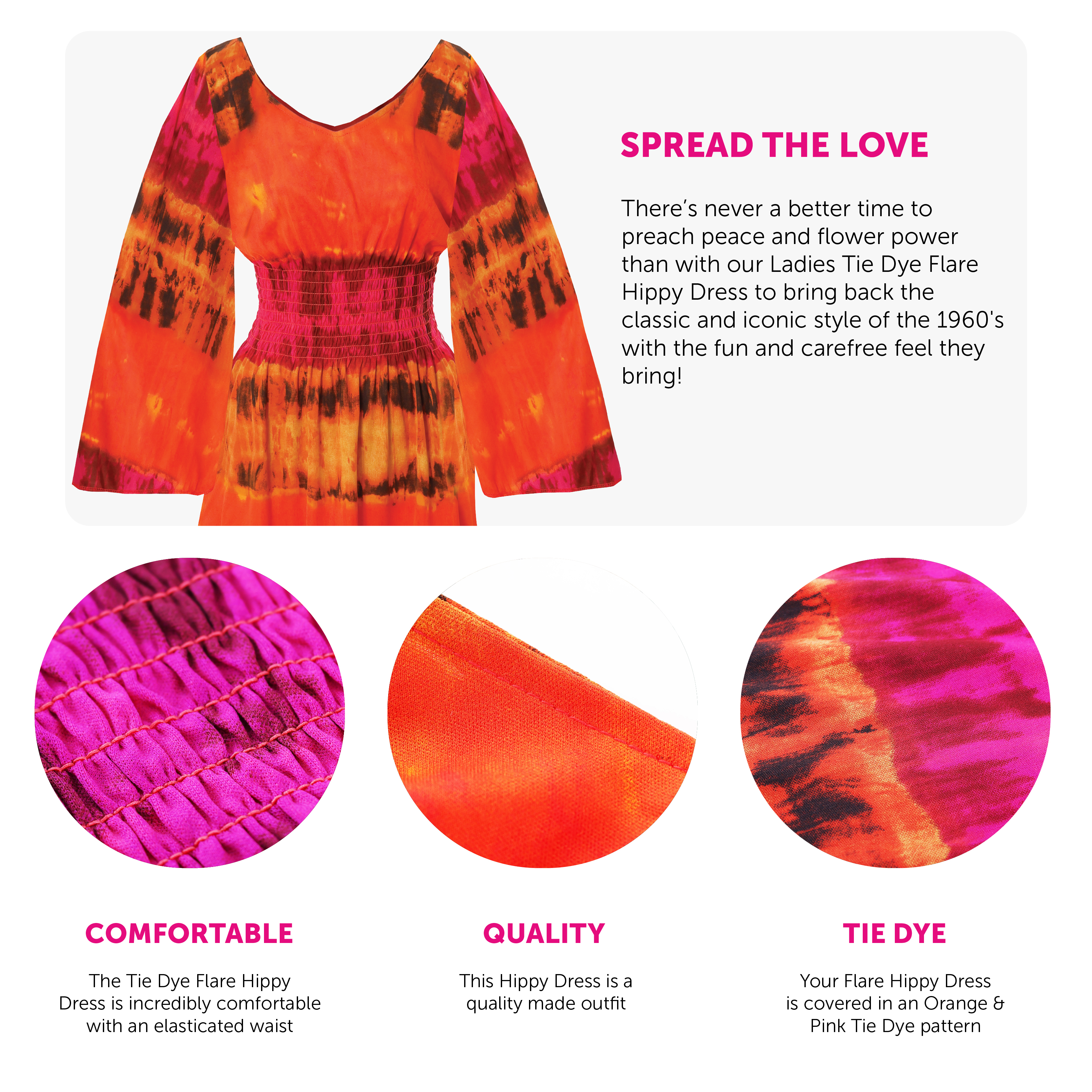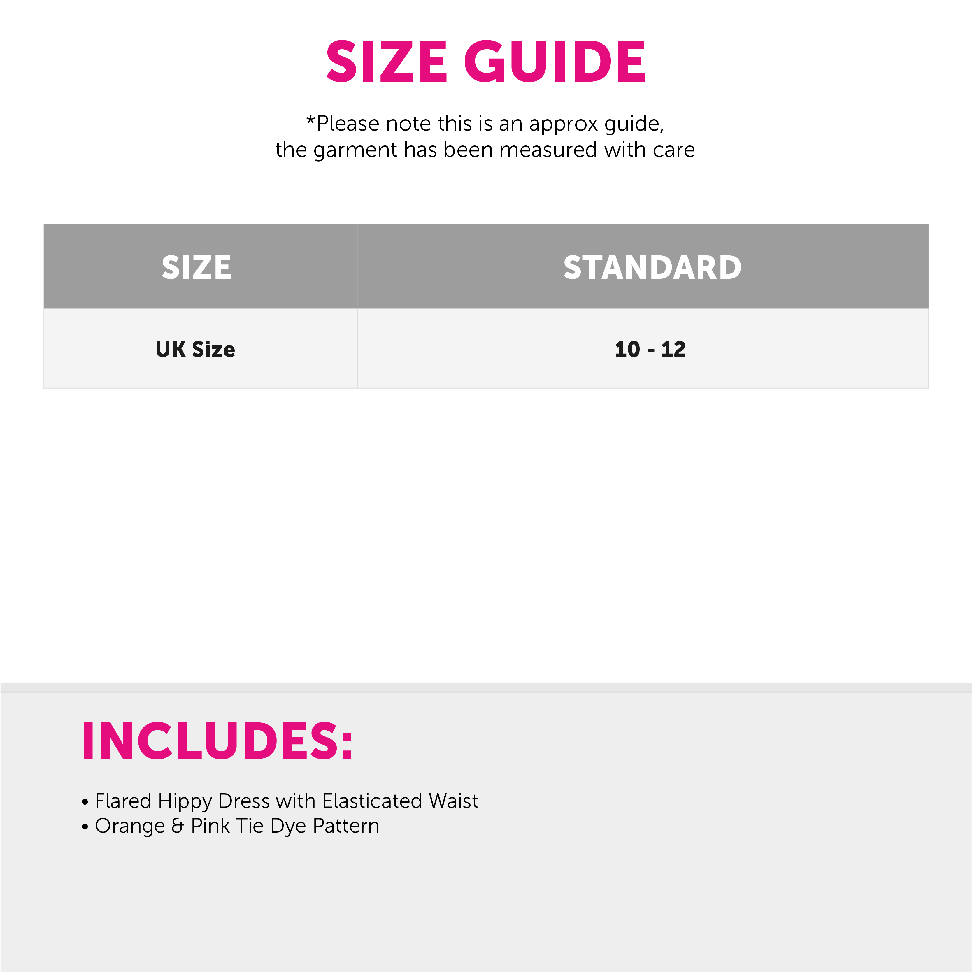 HIPPY DRESS DETAILS: Your Ladies Hippy Dress Costume is an Orange and Pink Tie Dye patterned Dress with Flared Sleeves and a comfortable elasticated waistband, a simplistic yet iconic look for any 60's Fancy Dress Party!