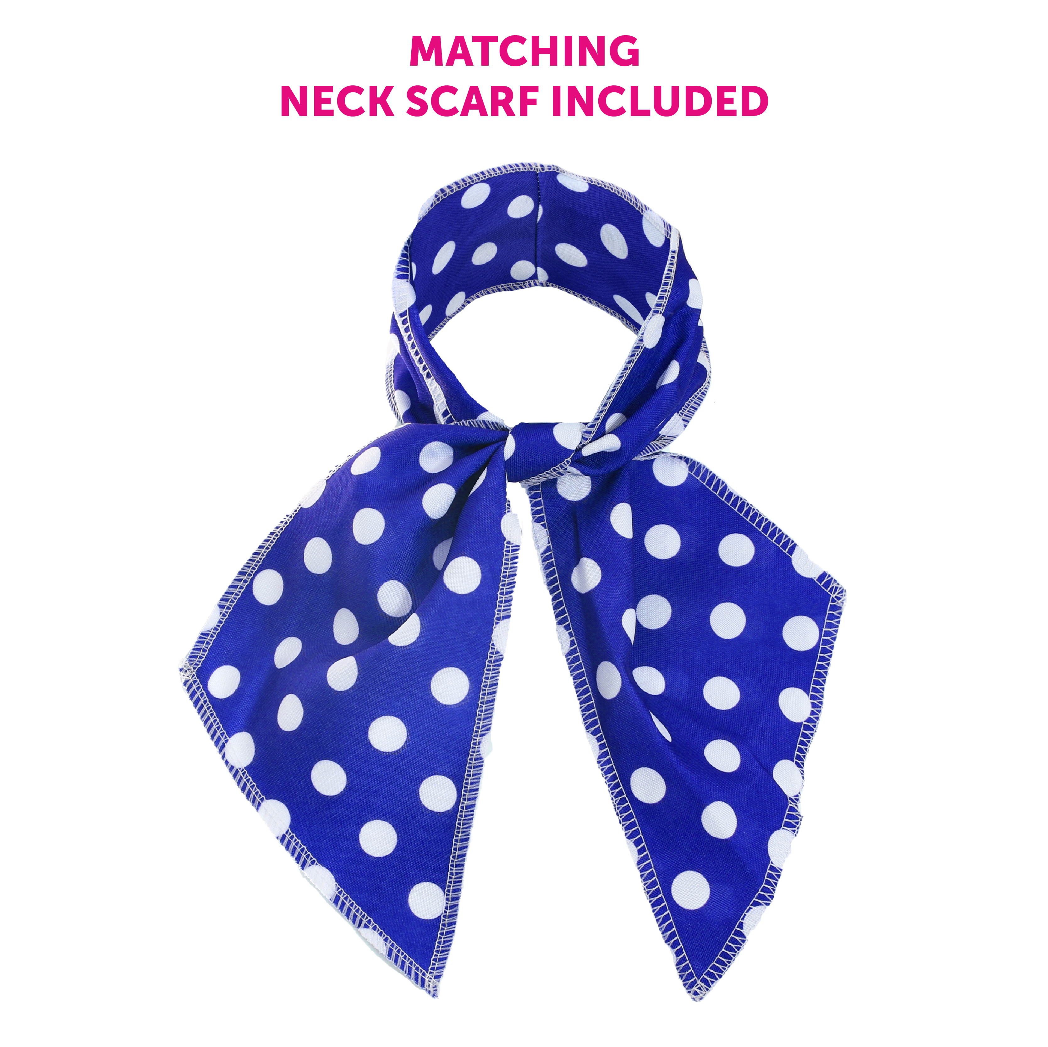 OUTFIT DETAILS: Your Ladies Polka Dot Skirt includes a Long Blue Skirt covered in a White Polka Dot pattern and a matching Polka Dot Scarf to complete your look!