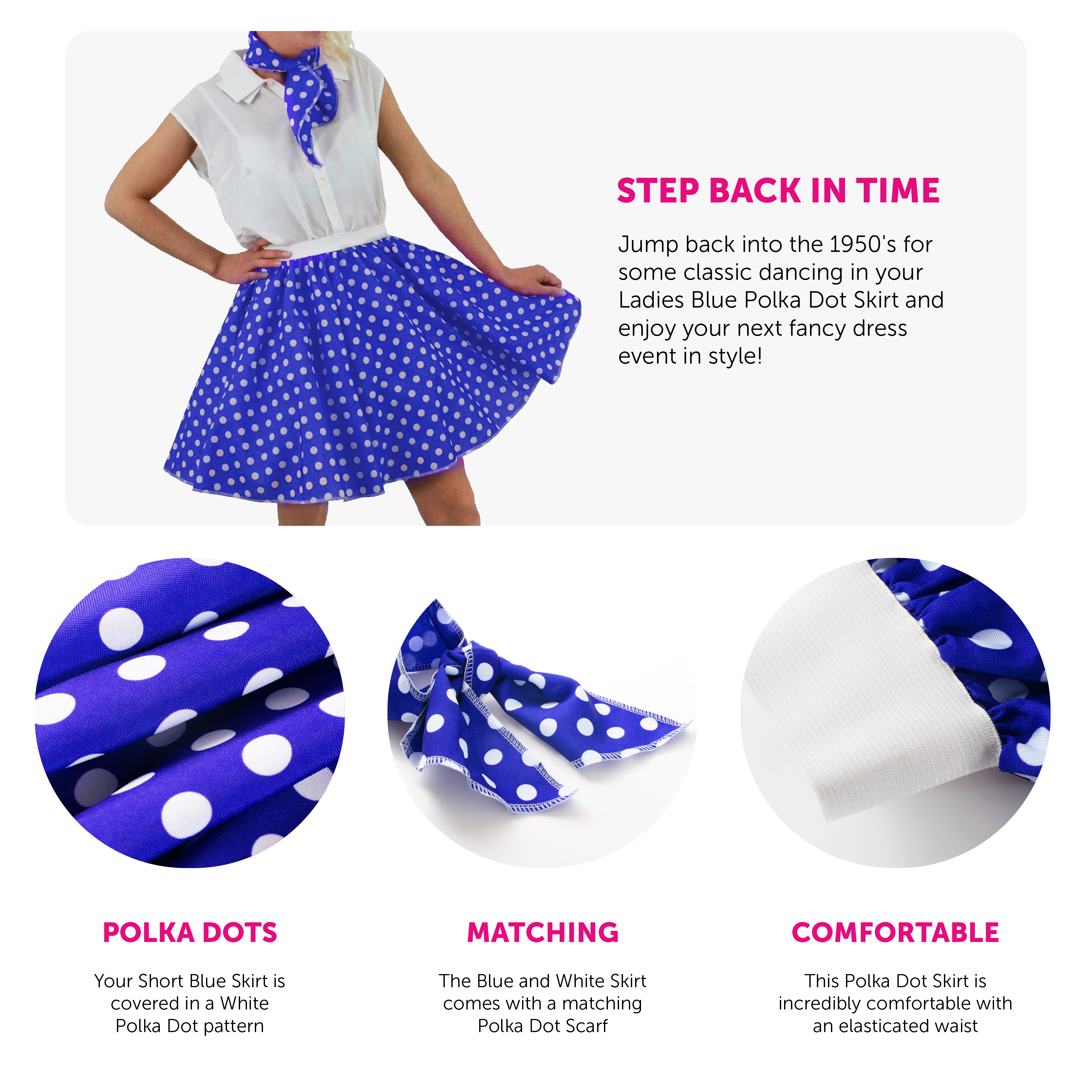 PERFECT FOR 1950'S & DANCE FANCY DRESS: Whether you’re dressing up for the times in the 1950's or in need of a dancing outfit for a stage production, then our Ladies Blue Polka Dot Skirt is the perfect selection for you!