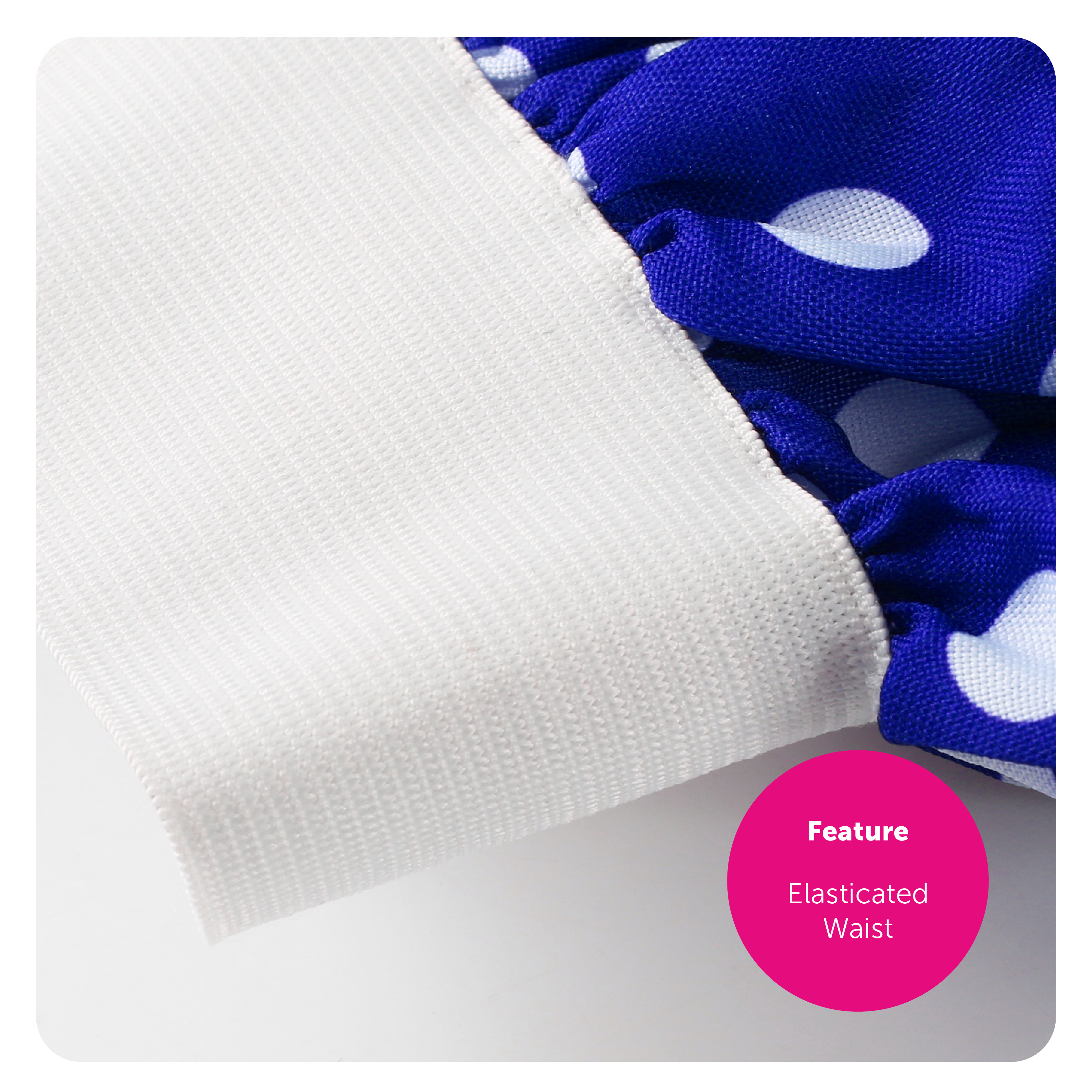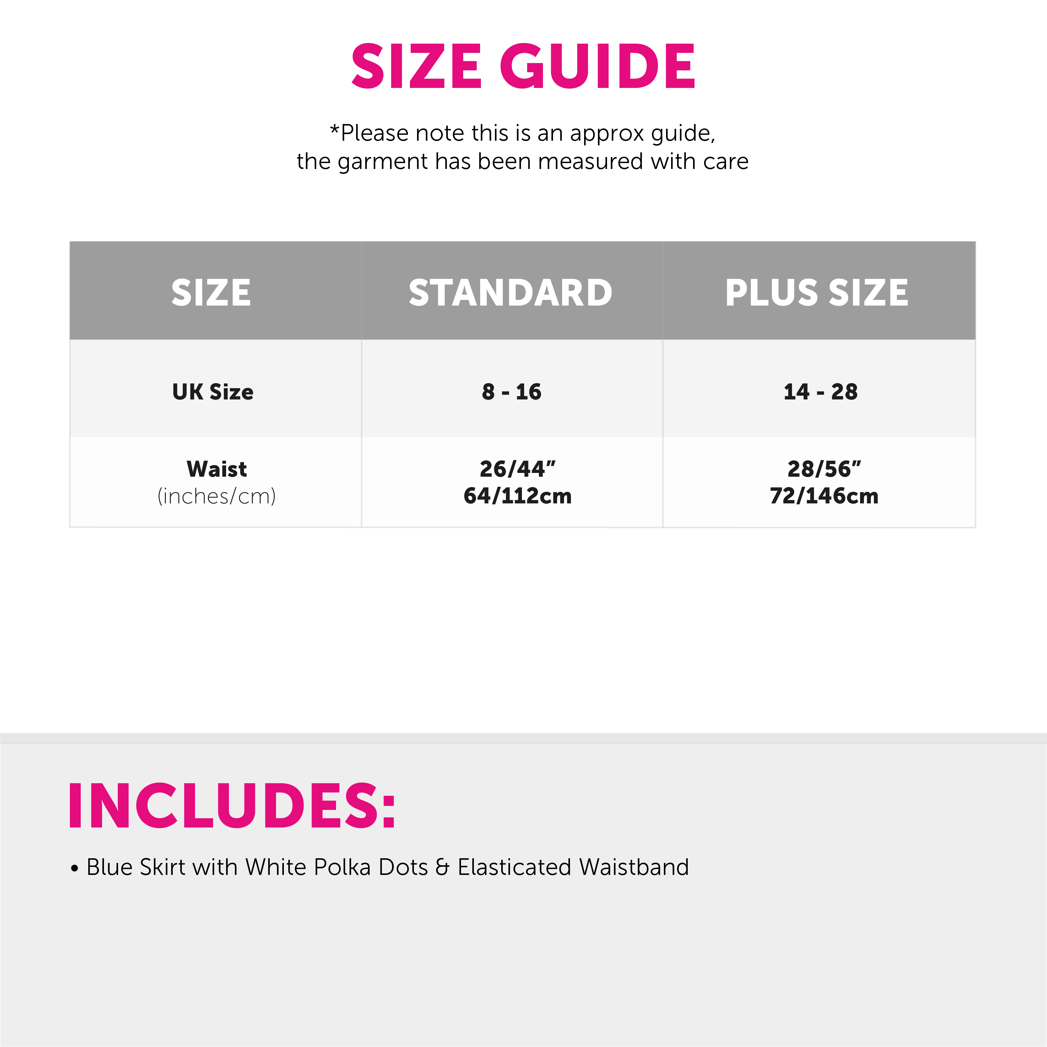 AVAILABLE IN TWO SIZES: Your Ladies Blue Polka Dot Skirt is available in two sizes only, Standard and Plus Size: Standard - (UK 8 - 16), Waist 26/44" (64/112cm) | Plus Size - (UK 14 - 28), Waist 28/56" (72/146cm)