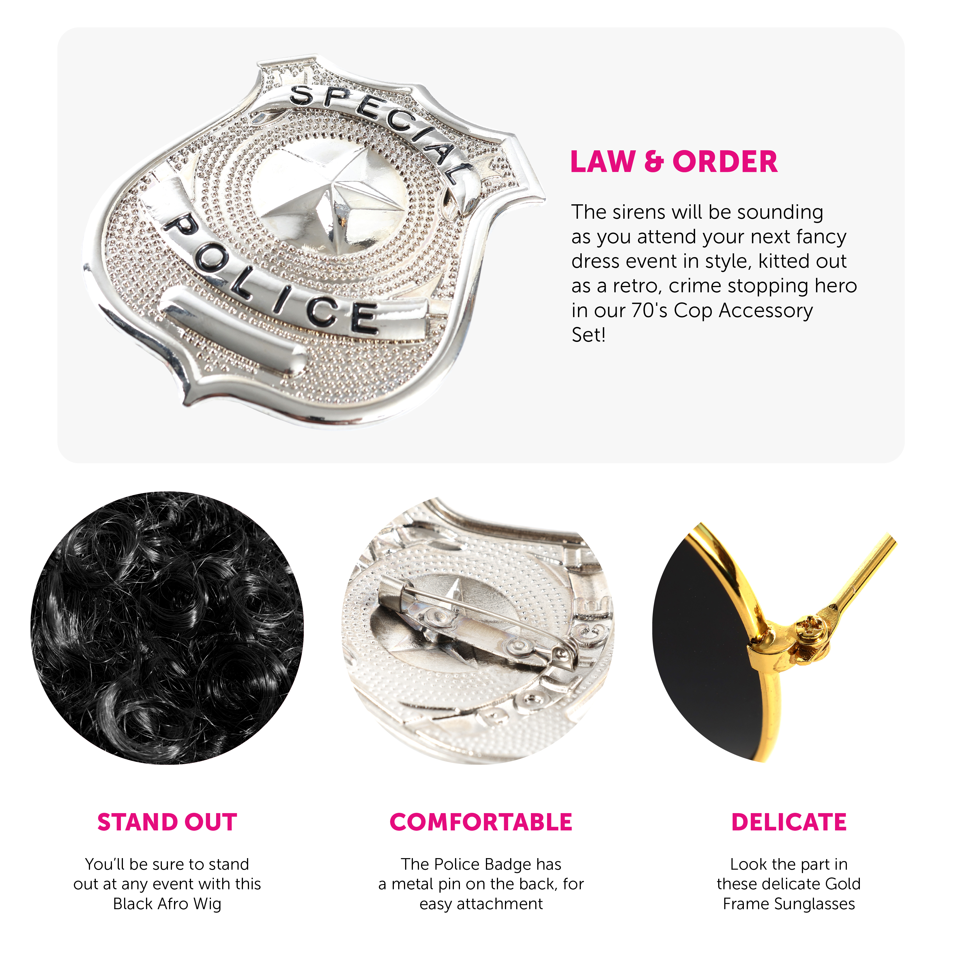 COP SET INCLUDES: Your 70's Cop Accessory Set includes a Black Afro Wig, an Adhesive Black Moustache, Sunglasses, 2x Fake Cigarettes, and a Silver Metal Police Badge with a pin for easy attachment, the perfect accessory set to add to your Fancy Dress Costume!