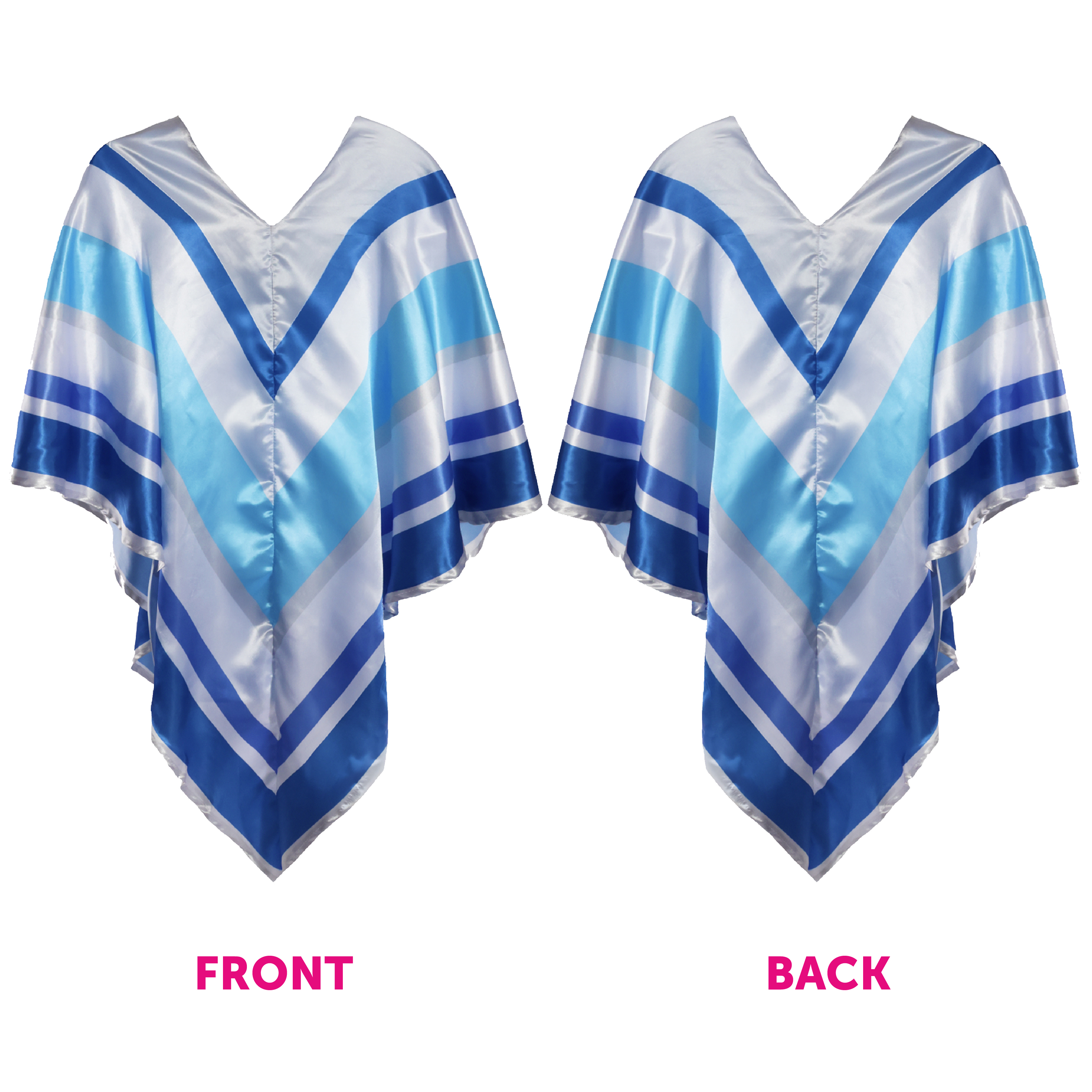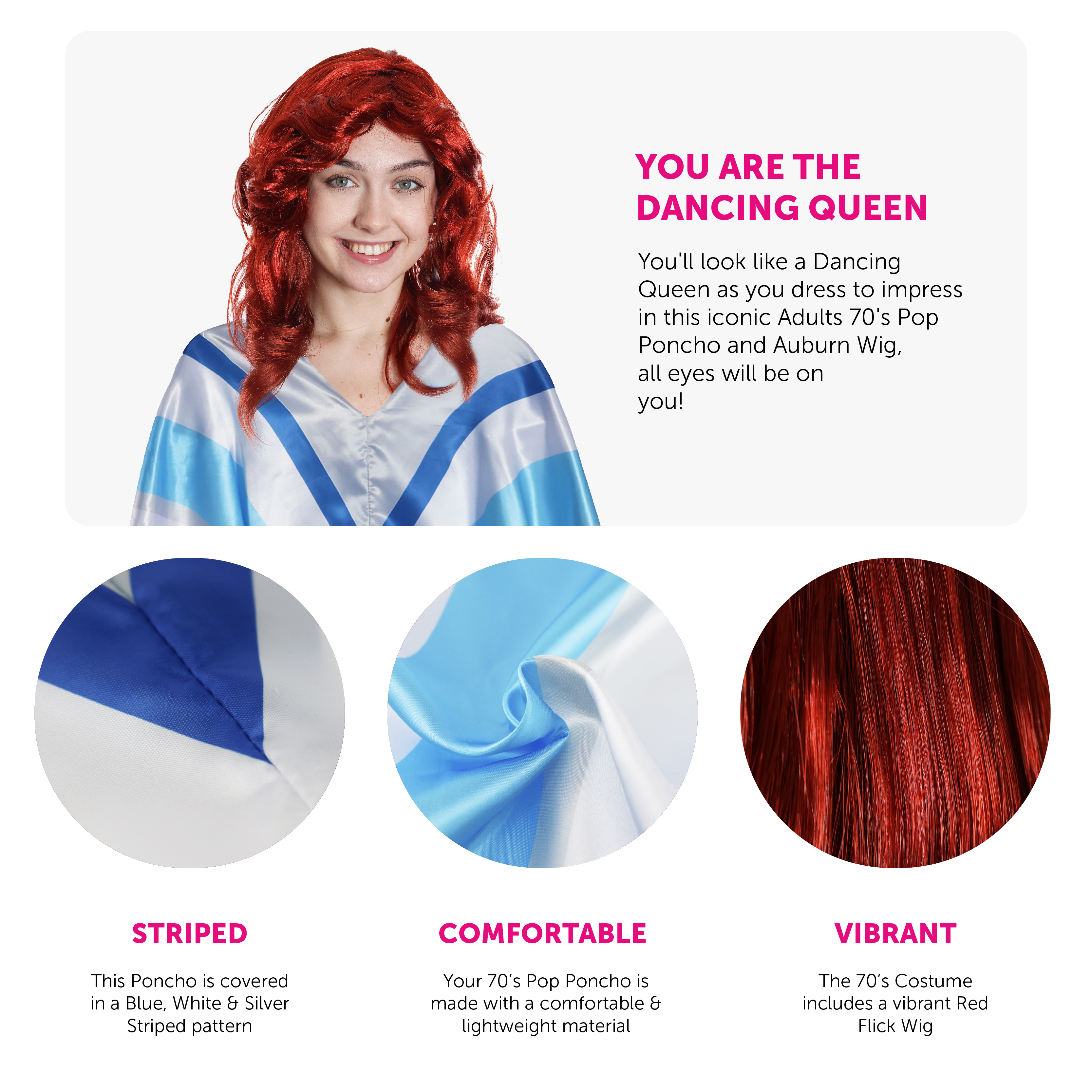 COSTUME DETAILS: This 70's Costume includes a high quality Satin Poncho, with Dark Blue, White, Grey and Light Blue Stripes, and a Long Auburn Flick Wig, making it the perfect Costume for any 70's themed event!