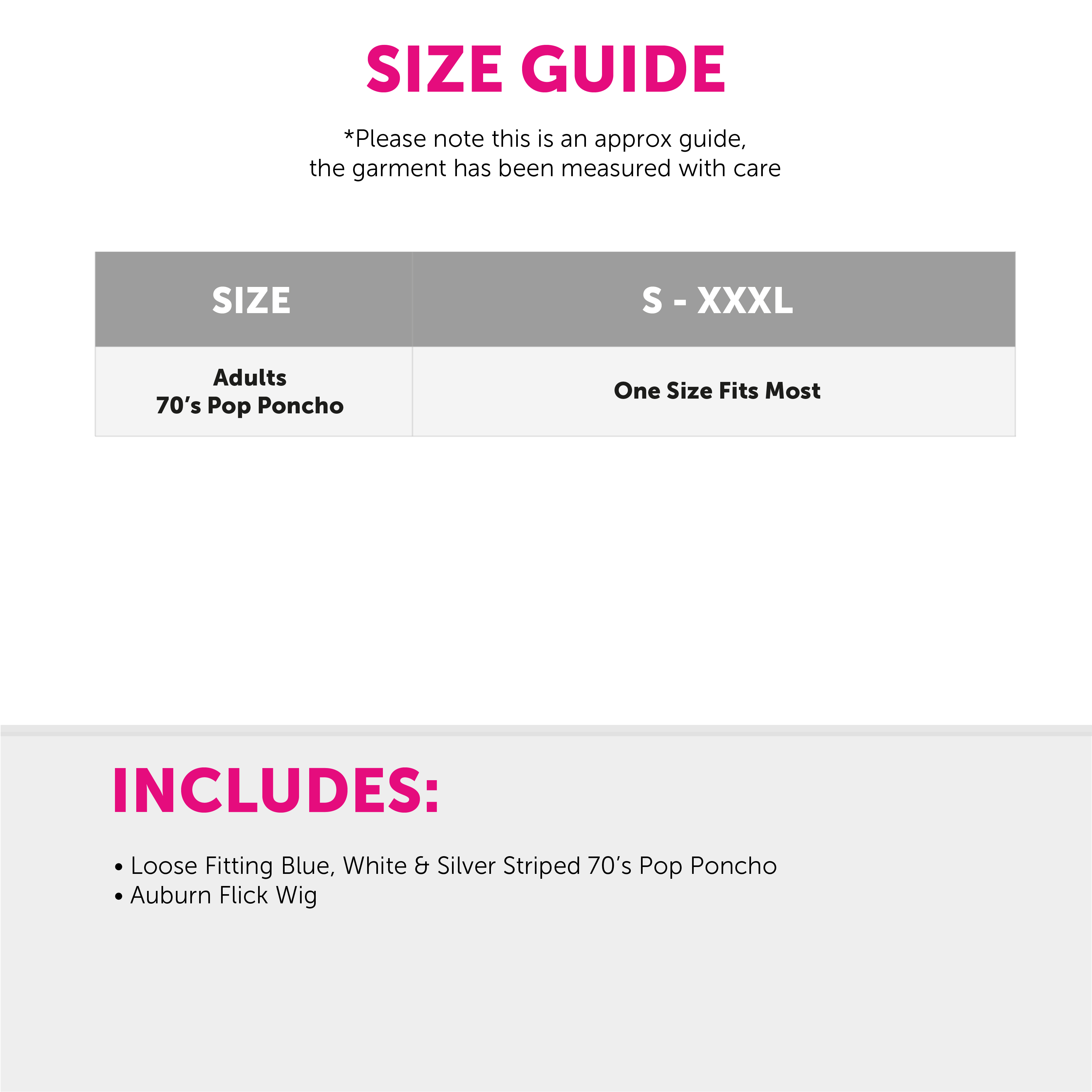 PERFECT FOR MUSIC THEMED PARTIES: Whether you are celebrating at a special music themed fancy dress party, music icon event or any other fancy dress occasion, do it in style with our Adults 70's Pop Poncho & Auburn Wig!