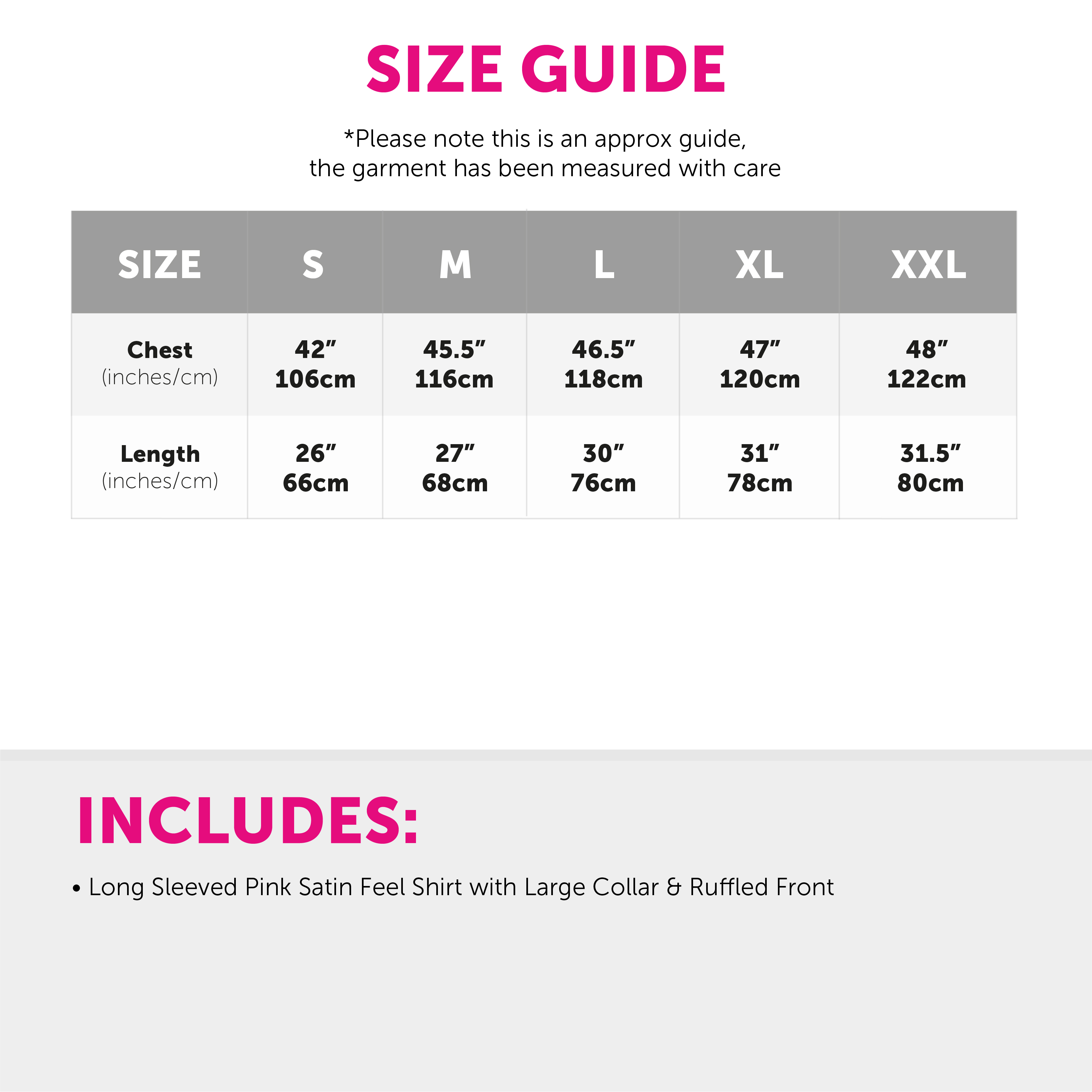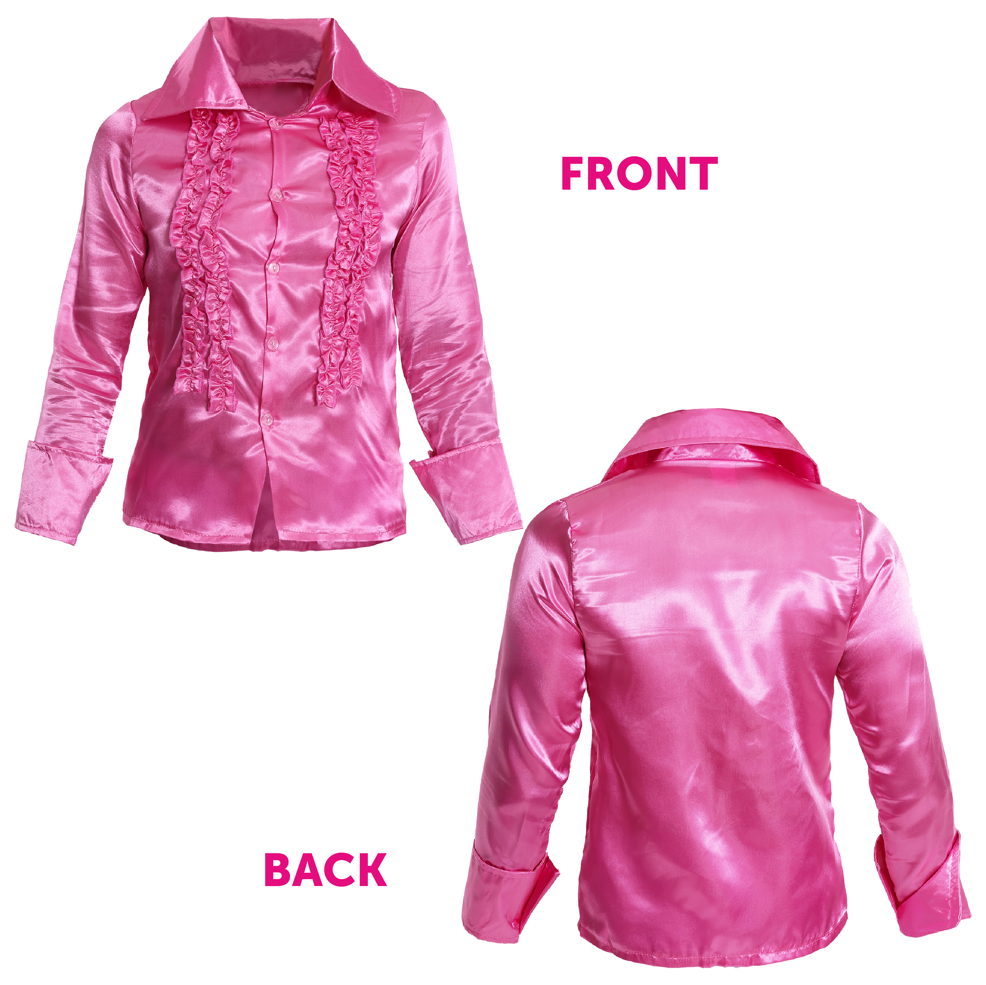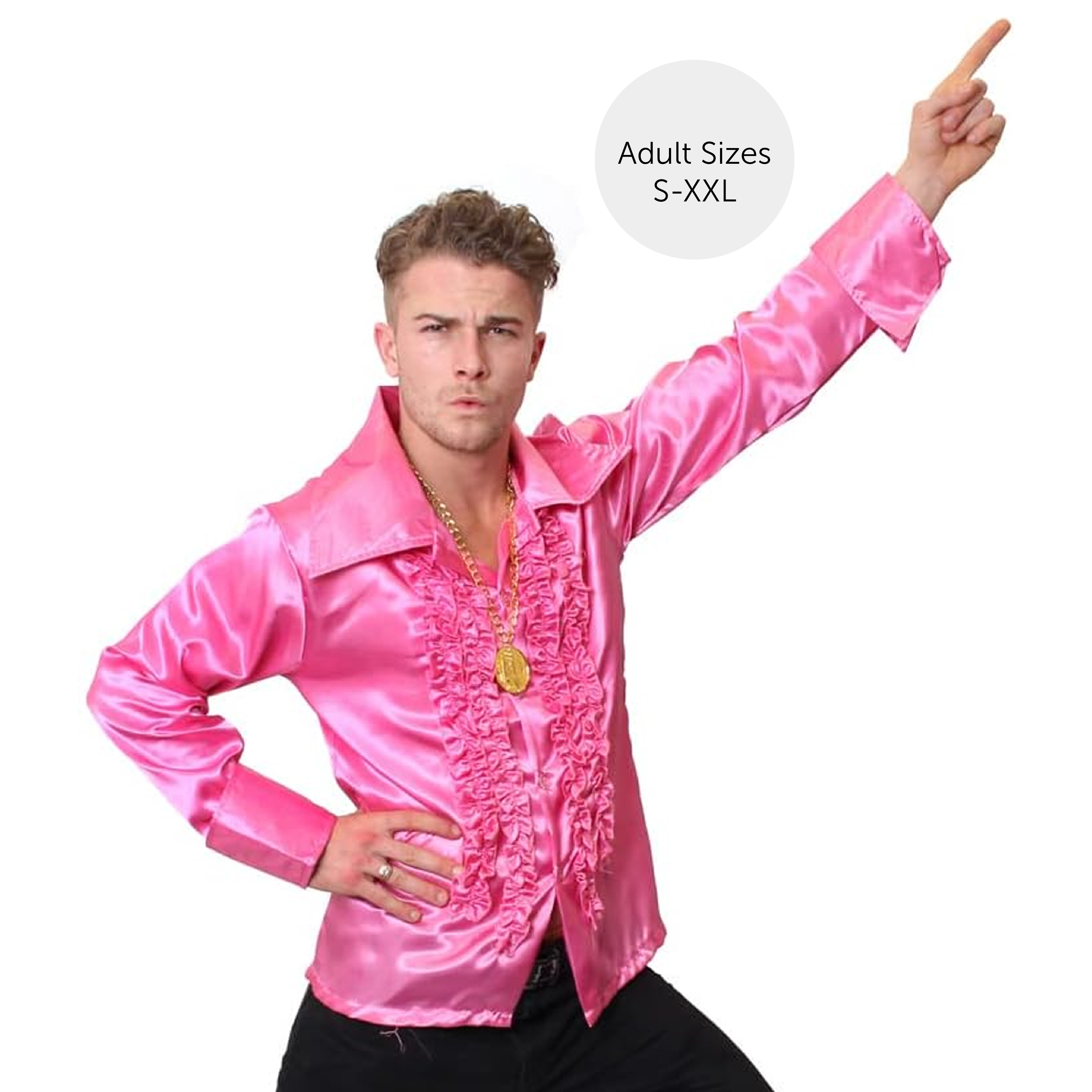 AVAILABLE IN MULTIPLE SIZES: Your Adults Pink Disco Shirts are available in multiple sizes from Small – XX-Large: Small - Chest 42" (106cm), Length 26" (66cm) | Medium - Chest 45.5" (116cm), Length 27" (68cm) | Large - Chest 46.5" (118cm), Length 30" (76cm) | X-Large - Chest 47" (120cm), Length 31" (78cm) | XX-Large - Chest 48" (122cm), Length 31.5" (80cm)
