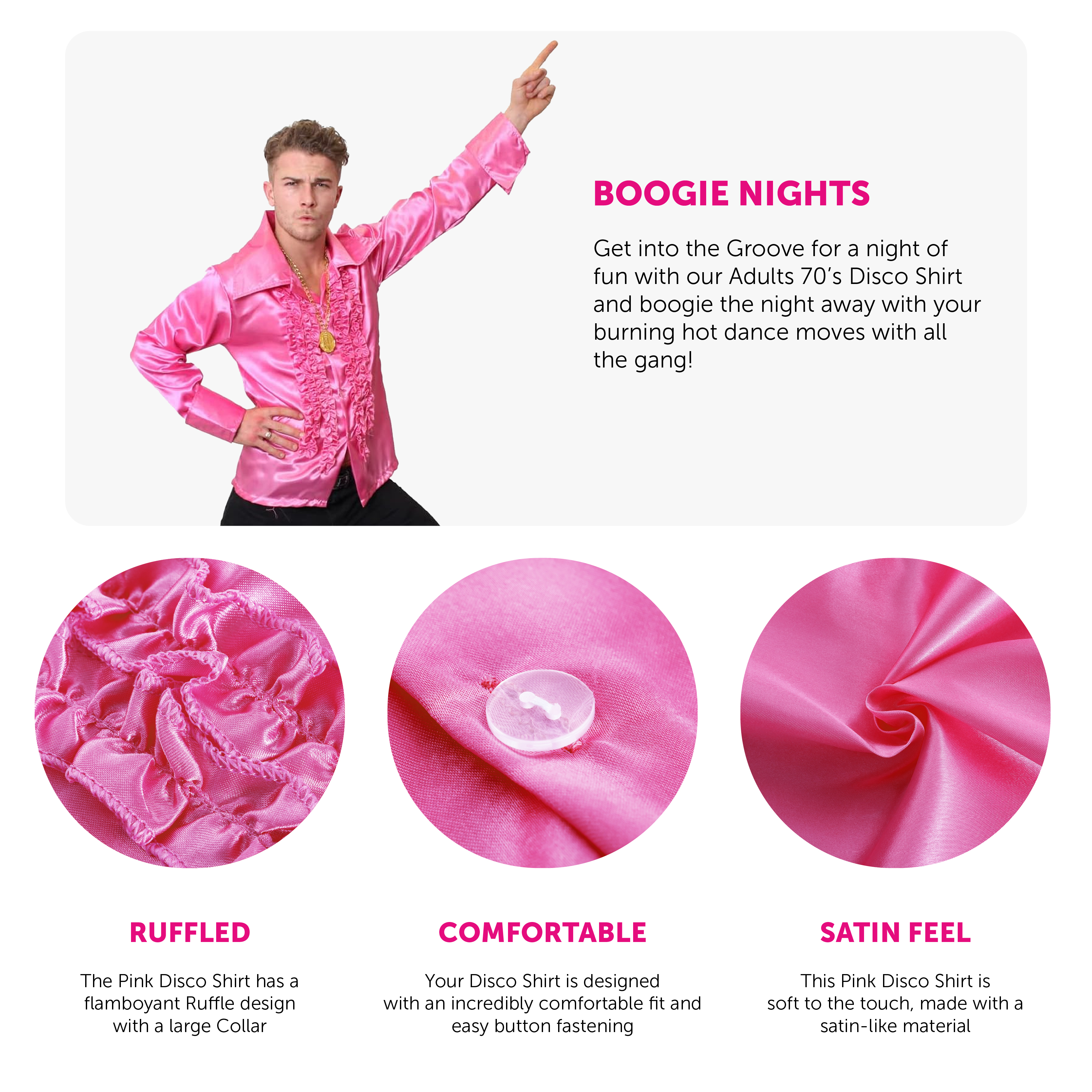 PERFECT FOR DISCO NIGHTS AND 70'S & 80'S PARTIES: Whether you’re getting down on a 70's night, or to bust a move on a disco night, you’ll be sure to steal away the dance floor with our Adults Pink Disco Shirt!