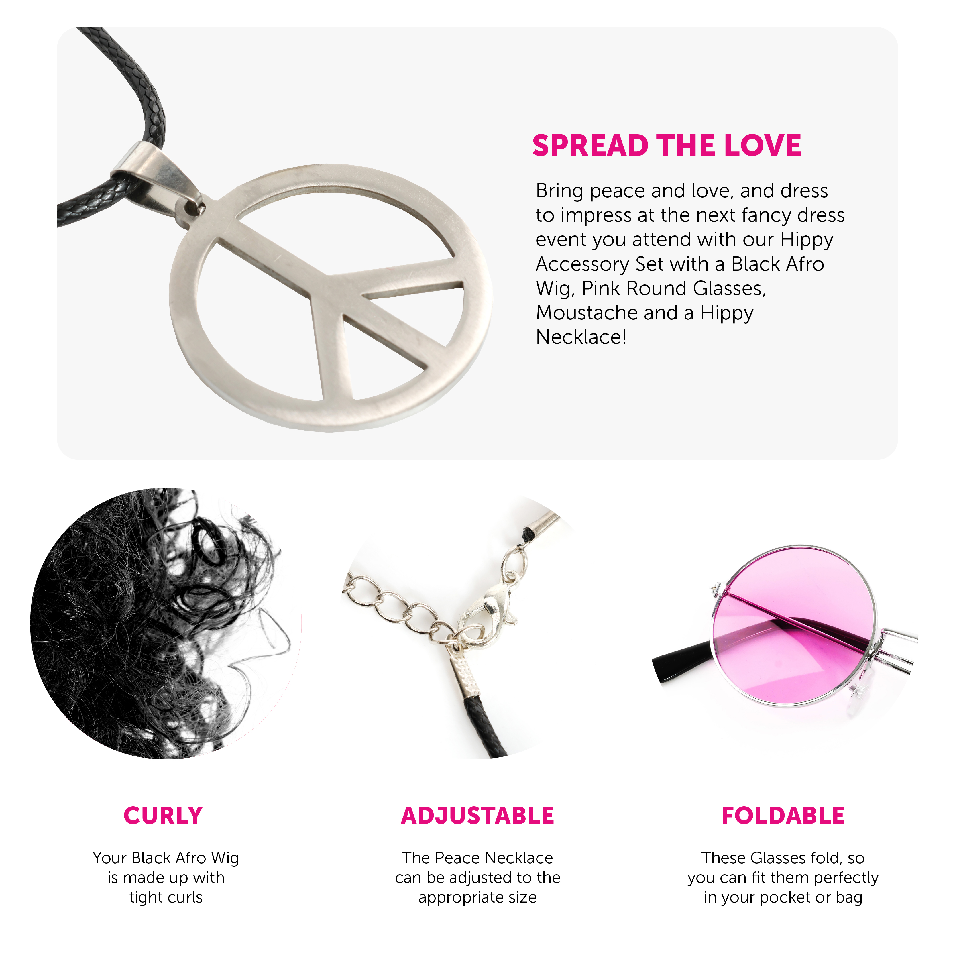 ACCESSORY SET INCLUDES: This Hippy Accessory Set includes a Black Afro Wig with tight curls, an Adhesive Moustache, a pair of Round Frame Glasses with Pink Lenses and an adjustable Necklace with a Peace Symbol pendant, the perfect accessories to add to your Hippy Outfit!