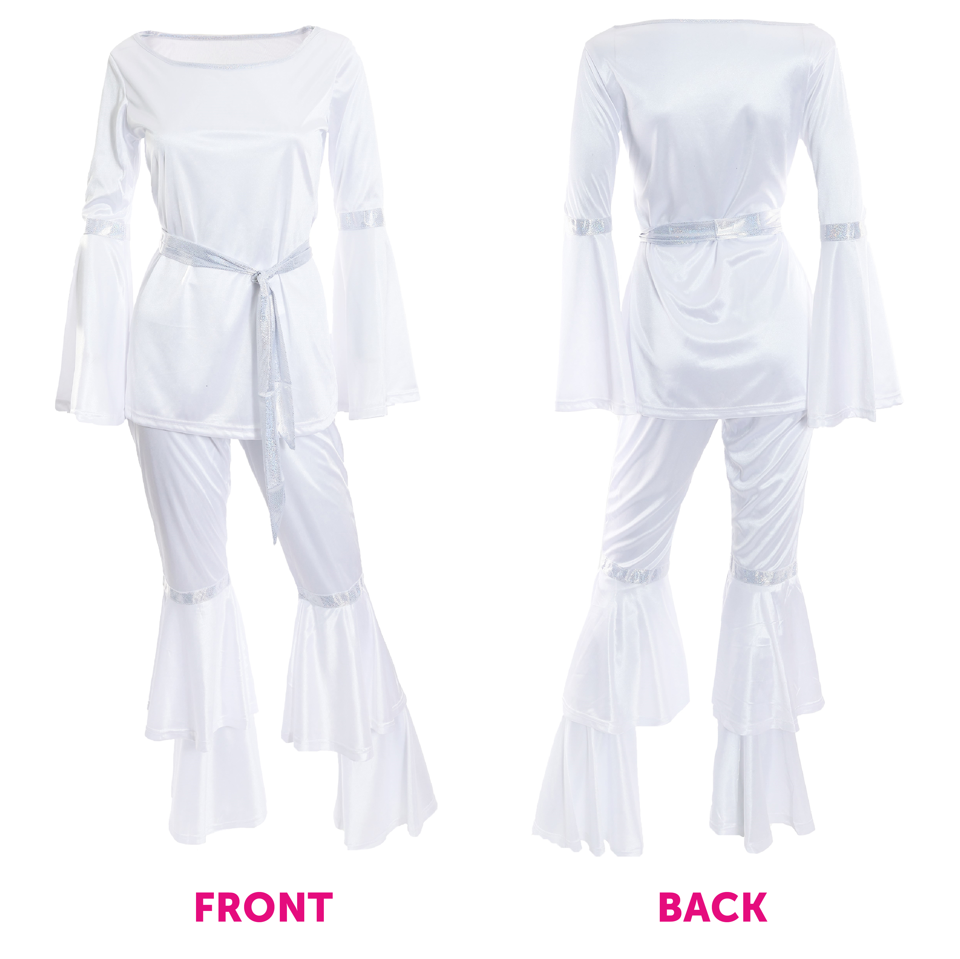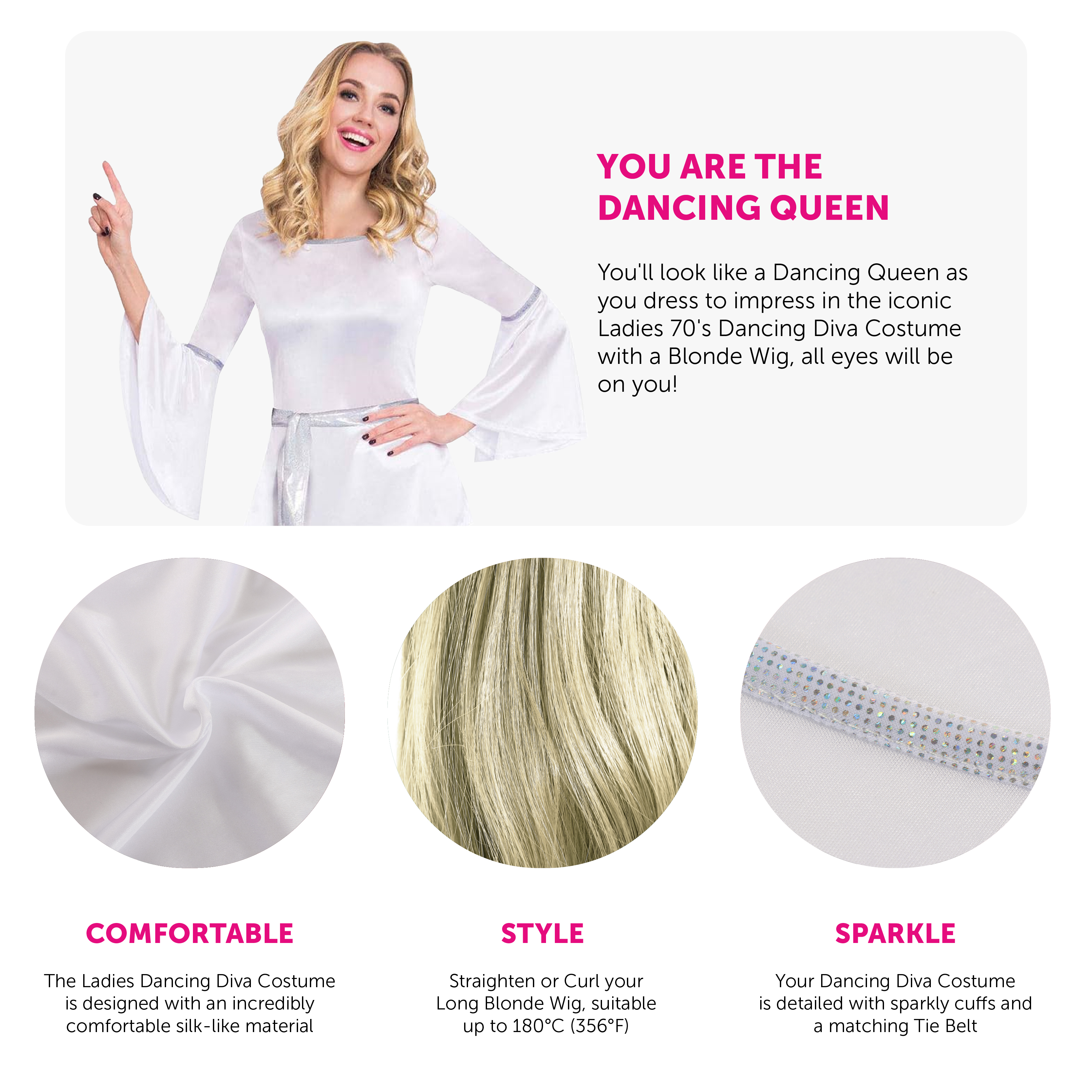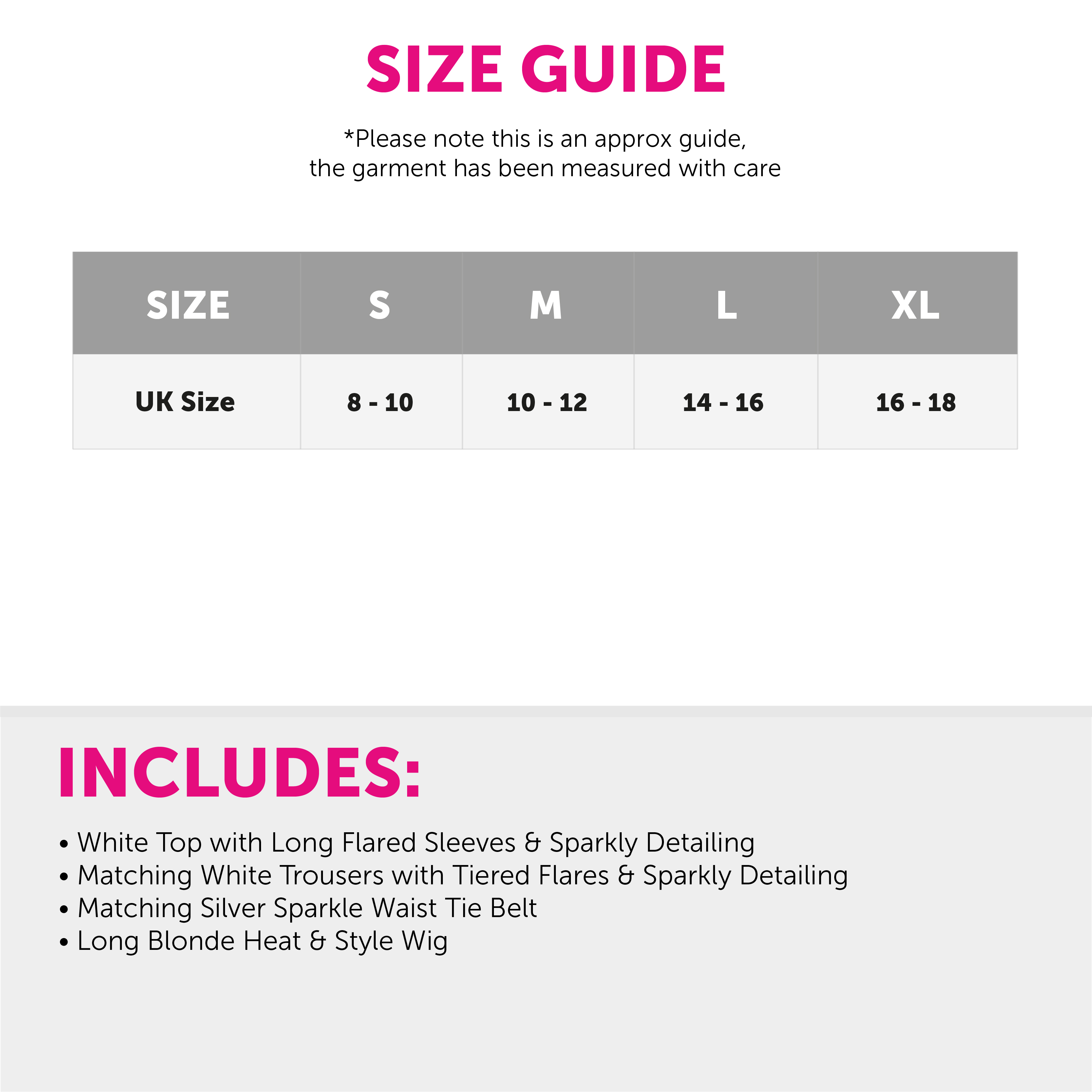 COSTUME DETAILS: This Ladies 70's Dancing Diva Costume includes a luscious, light Blonde Wig with a fringe, it is suitable for heat styling in any way you want, a long sleeved White Tunic Top with Flared Cuffs and Silver Trim detailing, matching White Trousers with tiered Flares and Silver Trim detailing and a simple Silver Waist Tie Belt, making it the perfect Costume for any 70's themed event!