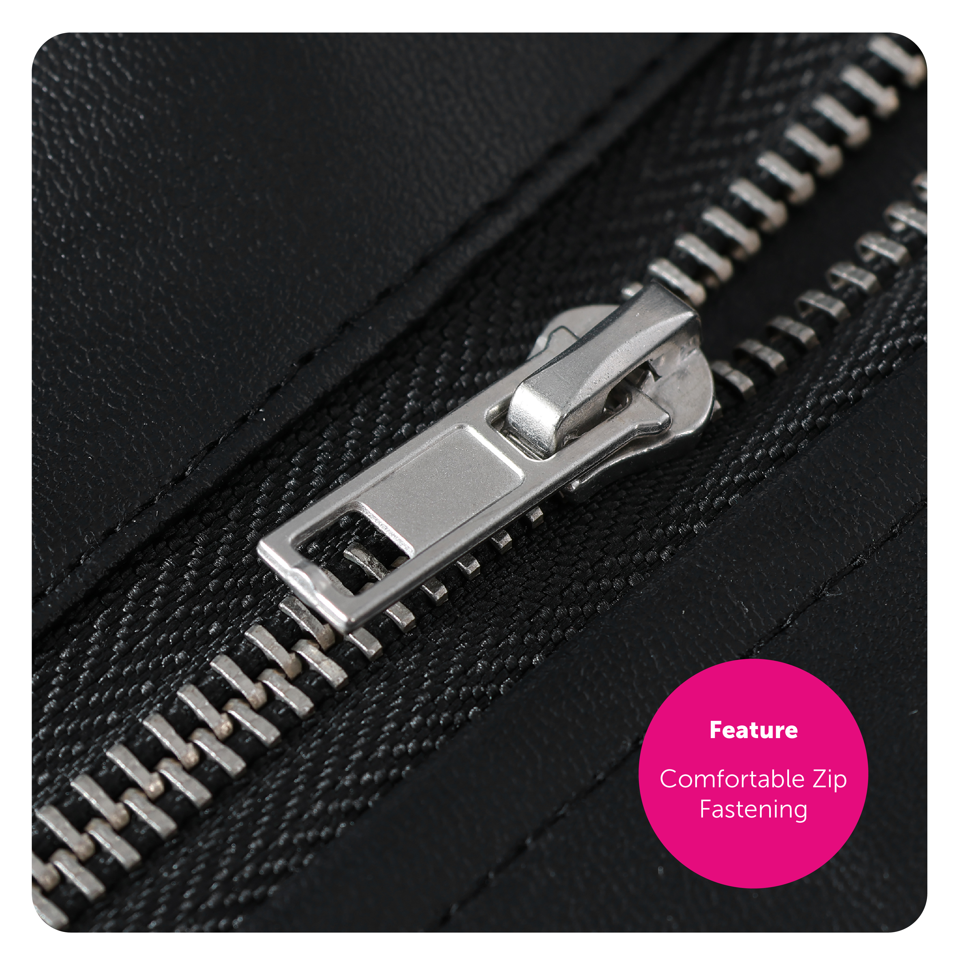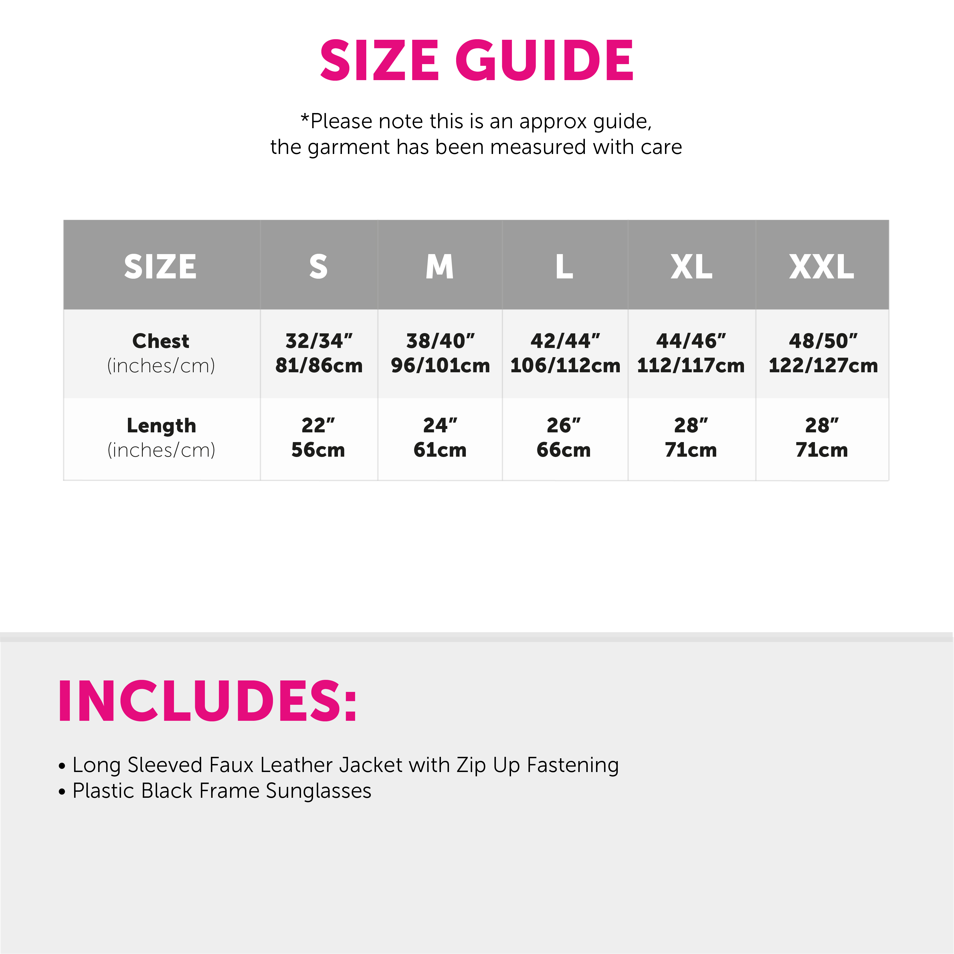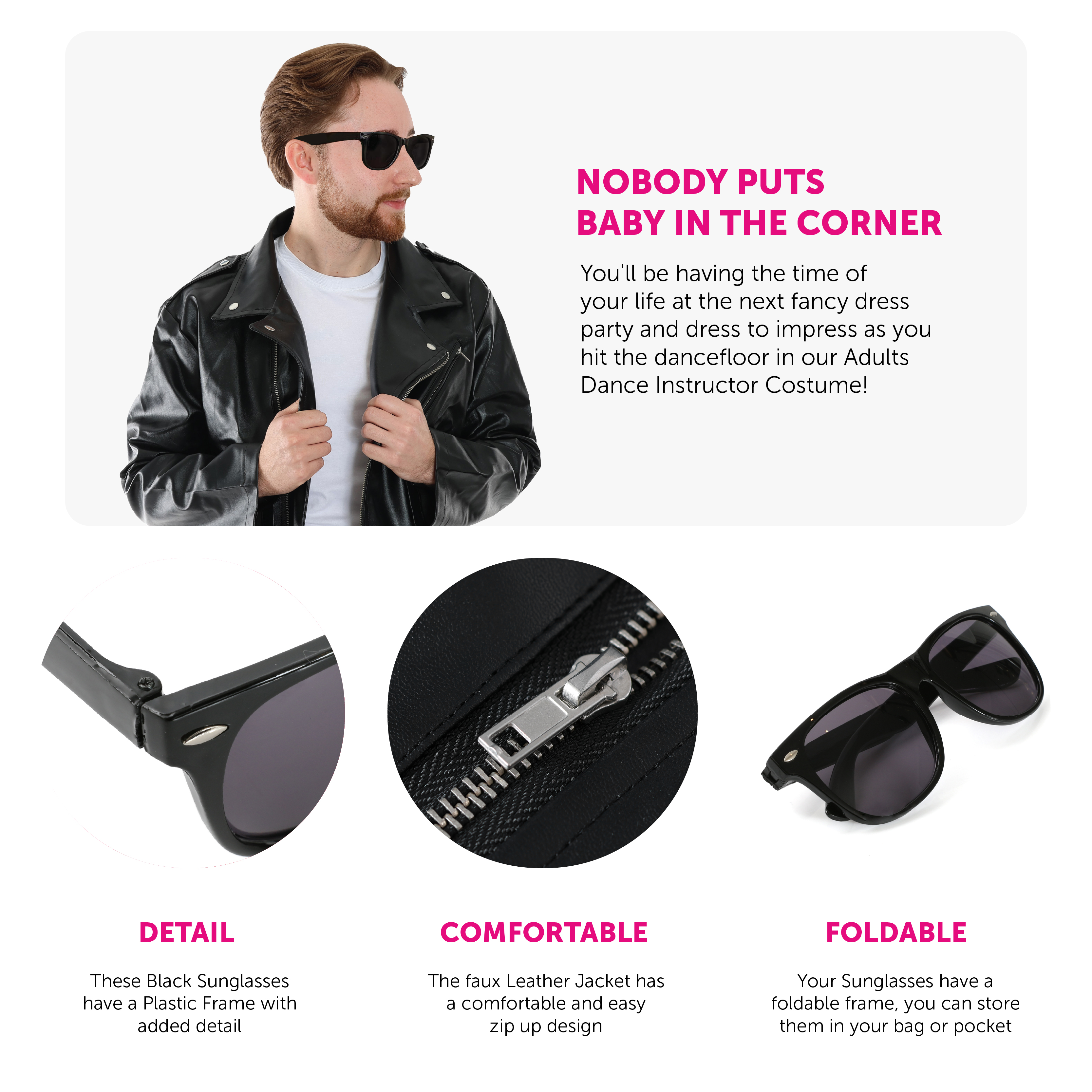 COSTUME DETAILS: Your Adults Dance Instructor Costume includes a long-sleeved, faux Black Leather Jacket with zip up fastening and a pair of Plastic Black Frame Sunglasses, the perfect outfit to dance the night away!