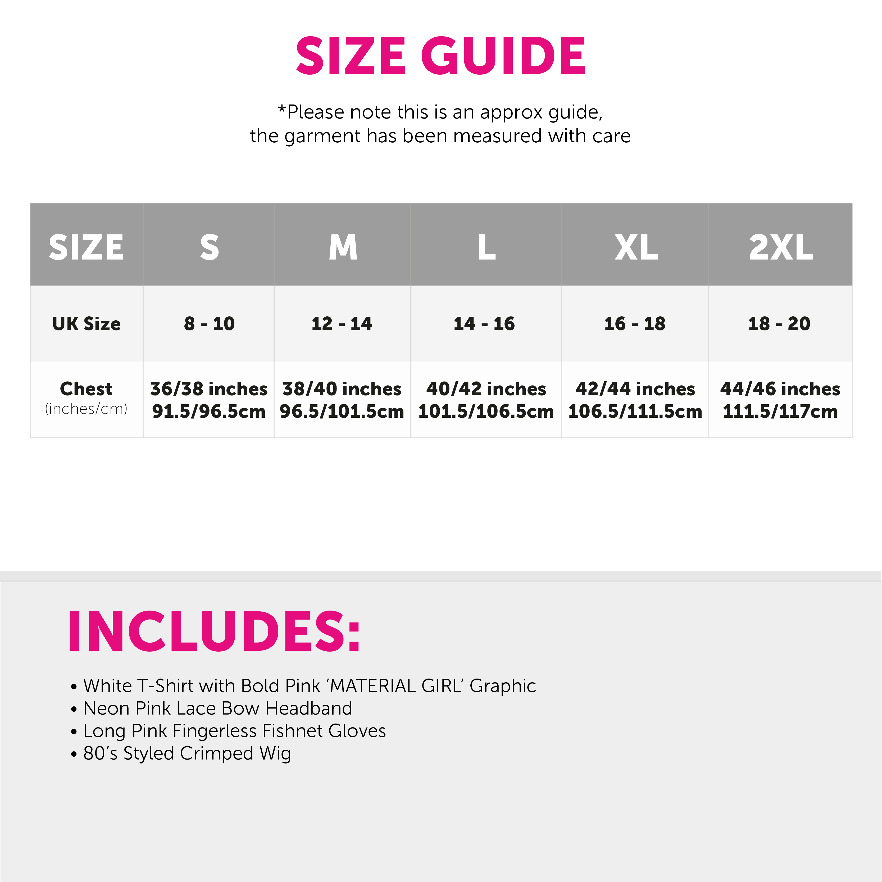 COSTUME INCLUDES: This 80's Pop Girl Costume includes a crisp White T-Shirt with a bold Pink 'Material Girl' graphic on the front, an 80's Style Crimped Wig, Long Hot Pink Fingerless Fishnet Gloves, and a Hot Pink Lace Bow Headband, perfect for any 80's event!