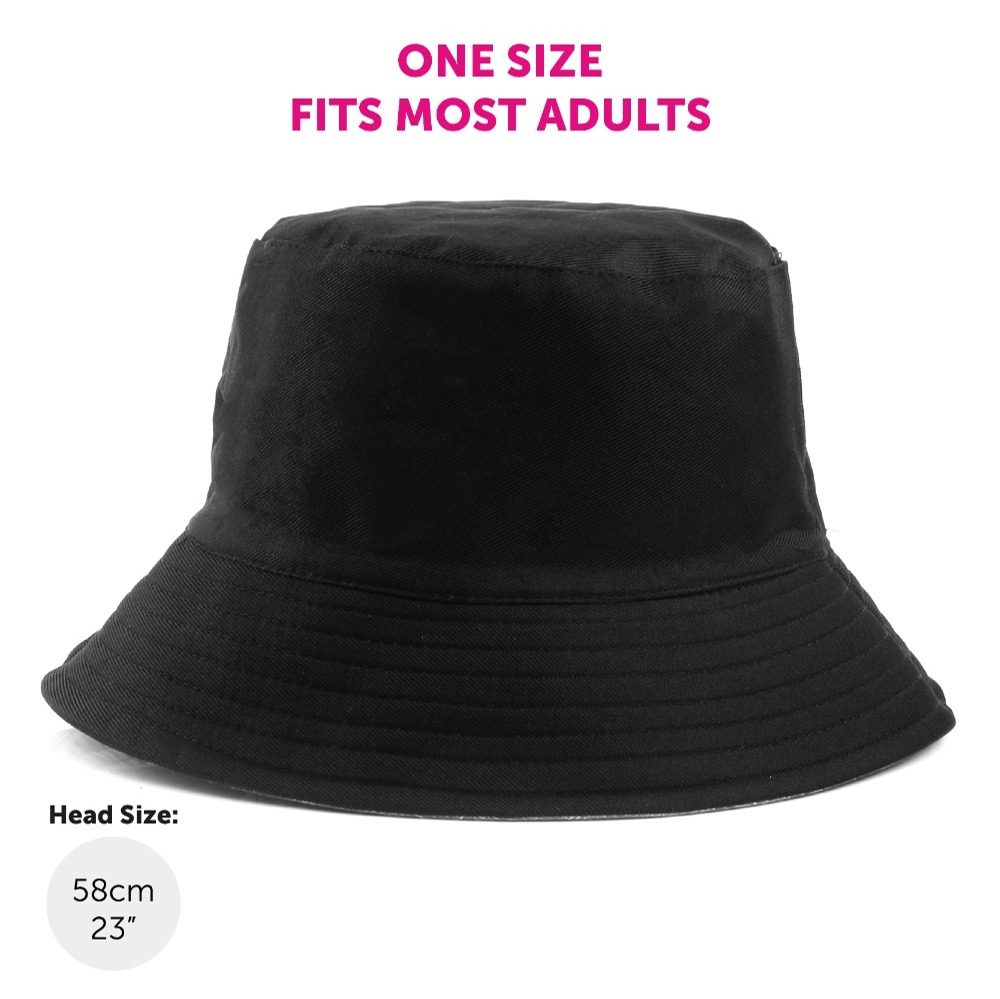Your Plain Black Bucket Hat is a one size fits all hat, measuring a head size up to 58cm (23")!