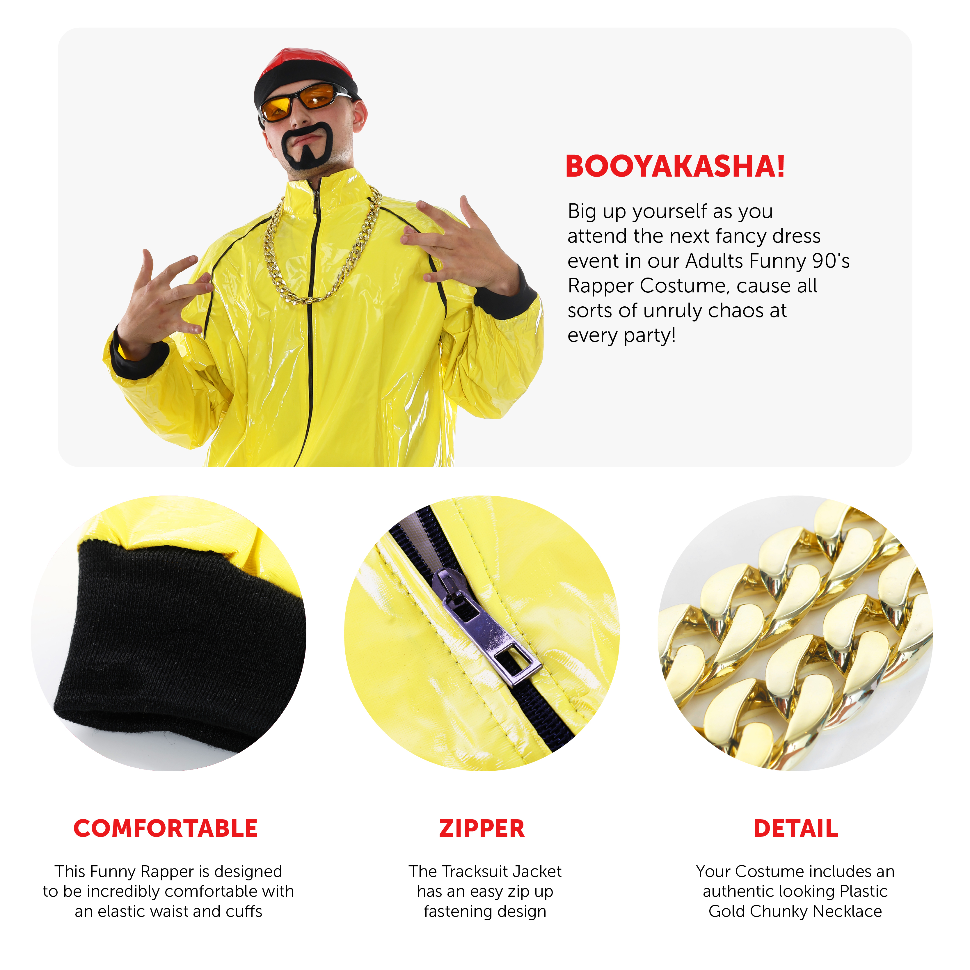 COSTUME DETAILS: Your 90's Rapper Costume includes a bright Yellow Tracksuit Jacket and matching Trousers, a Red Hat, Yellow Lens Sunglasses, a Black Adhesive Goatee Beard, and a Chunky Plastic Gold Chain Necklace, the perfect set for any fancy dress event!