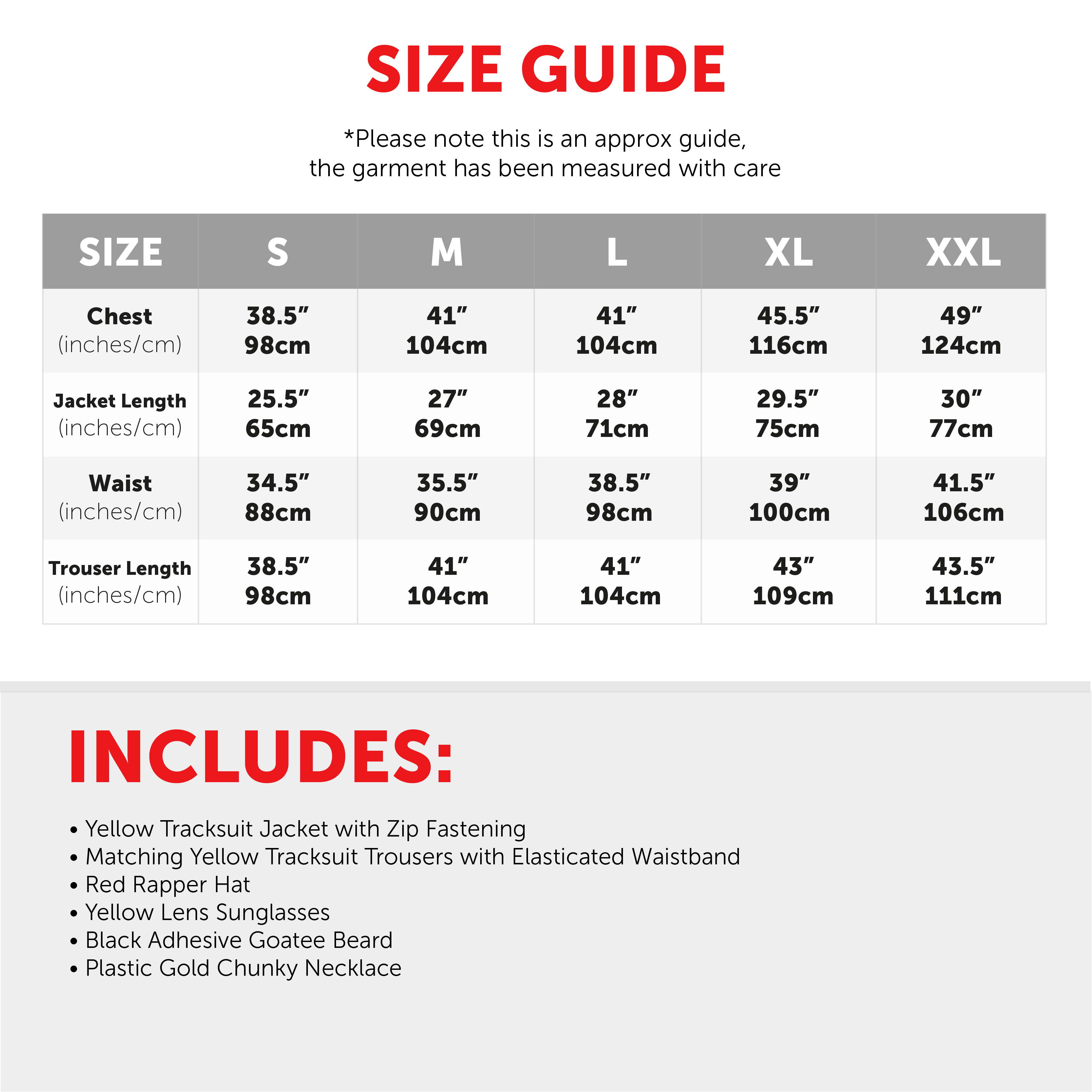 AVAILABLE IN MULTIPLE SIZES: Your Adults Funny 90's Rapper Costume is available in multiple sizes, from Small to XX-Large: Small - Chest 38.5" (98cm), Jacket Length 25.5" (65cm), Waist 34.5" (88cm), Leg Length 38.5" (98cm) | Medium - Chest 41" (104cm), Jacket Length 27" (69cm), Waist 35.5" (90cm), Leg Length 41" (104cm) | Large - Chest 41" (104cm), Jacket Length 28" (71cm), Waist 38.5" (98cm), Leg Length 41" (104cm) | X-Large - Chest 45.5" (116cm), Jacket Length 29.5" (75cm), Waist 39" (100cm), Leg Length 43" (109cm) | XX-Large - Chest 49" (124cm), Jacket Length 30" (77cm), Waist 41.5" (106cm), Leg Length 43.5" (111cm)