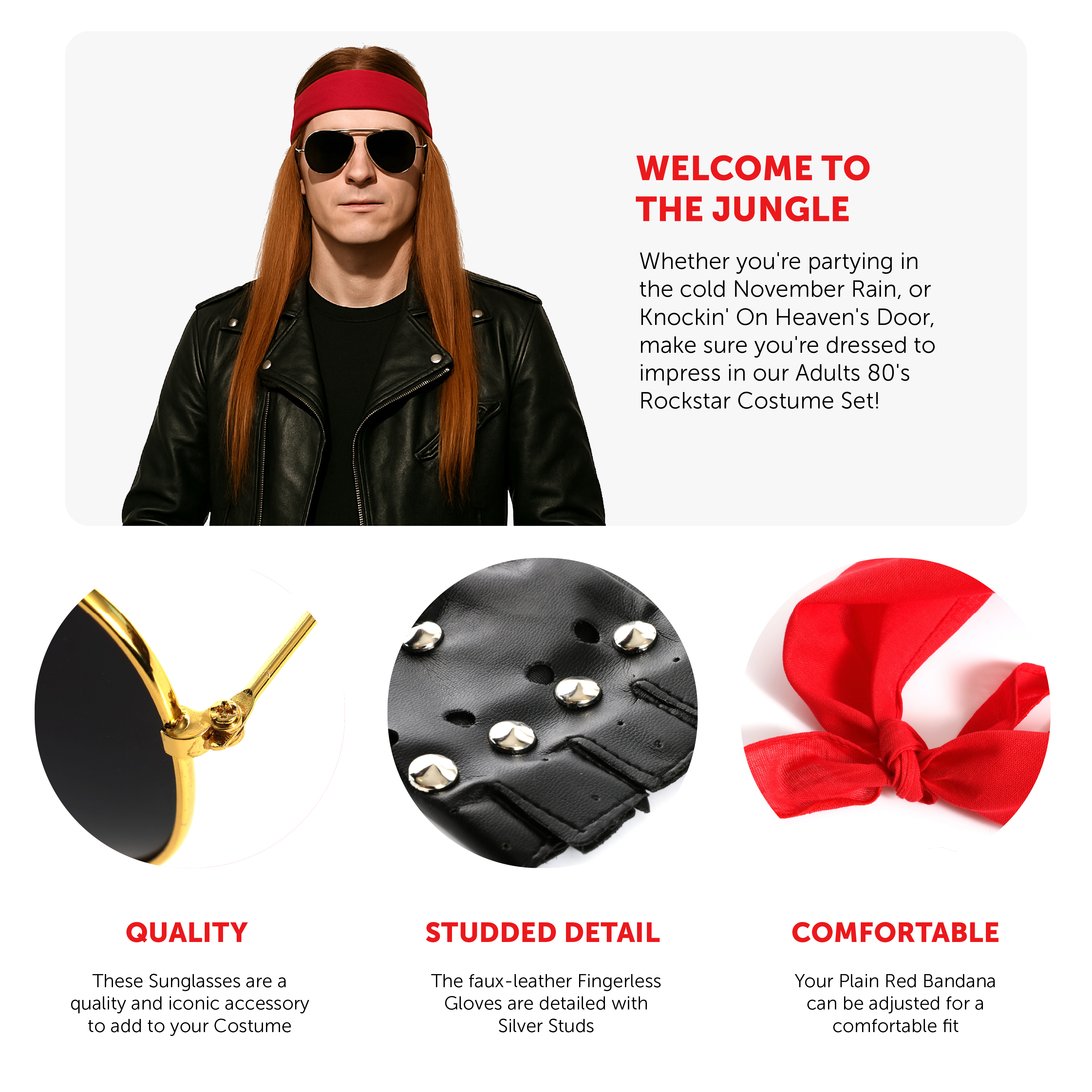 Axl Rose Inspired Costume | 5 Pcs | Leather Jacket, Ginger Wig, Red Bandana, Gloves & Glasses £32.99