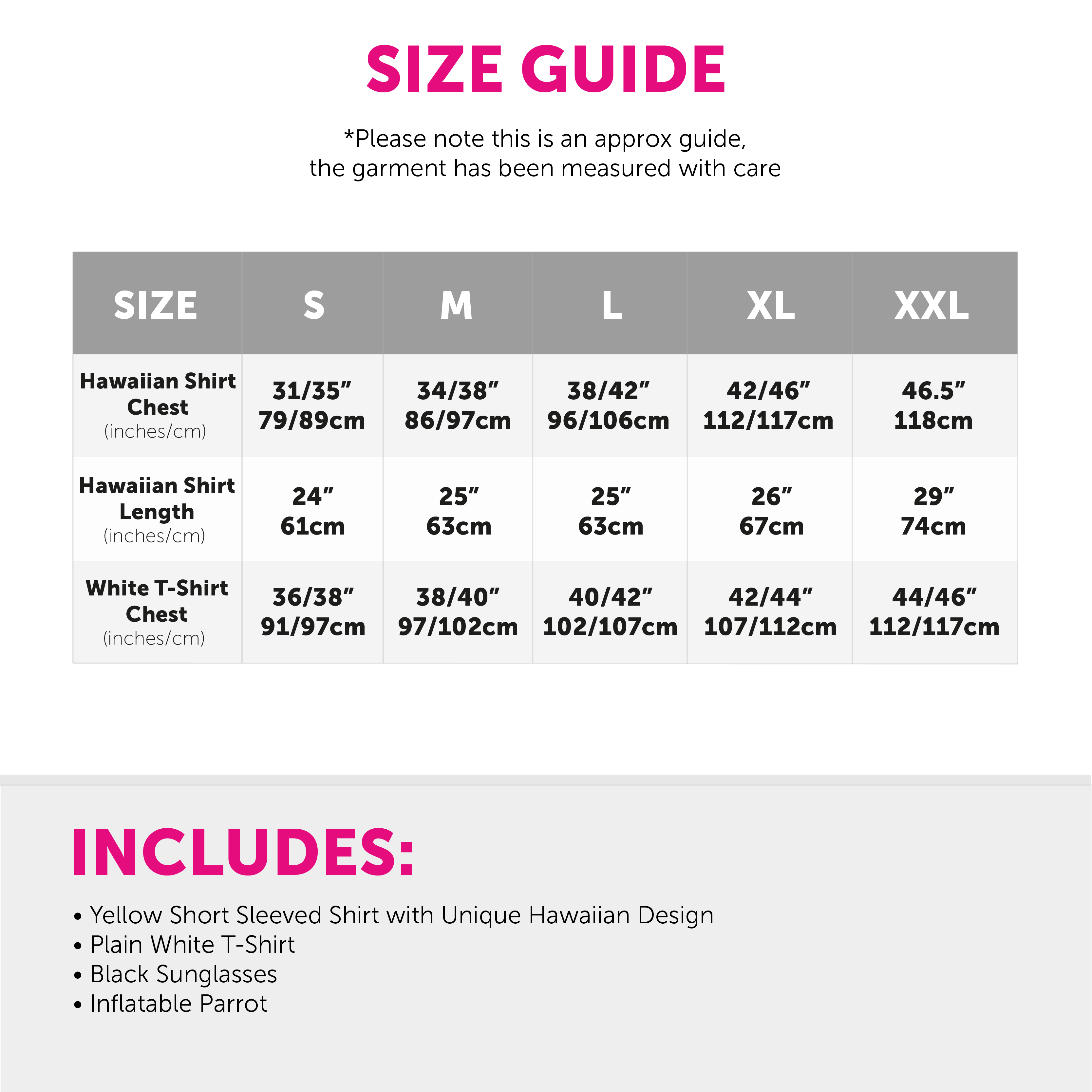 Yellow Hawaiian Shirt - Small - Chest 31/35" (79/89cm), Length 24" (61cm) | Medium - Chest 34/38” (86/97cm), Length 25" (63cm) | Large - Chest 38/42" (96/106cm), Length 25" (63cm) | X-Large - Chest 42/46" (112/117cm), Length 26" (67cm) | XX-Large - Chest 46.5" (118cm), Length 29" (74cm)