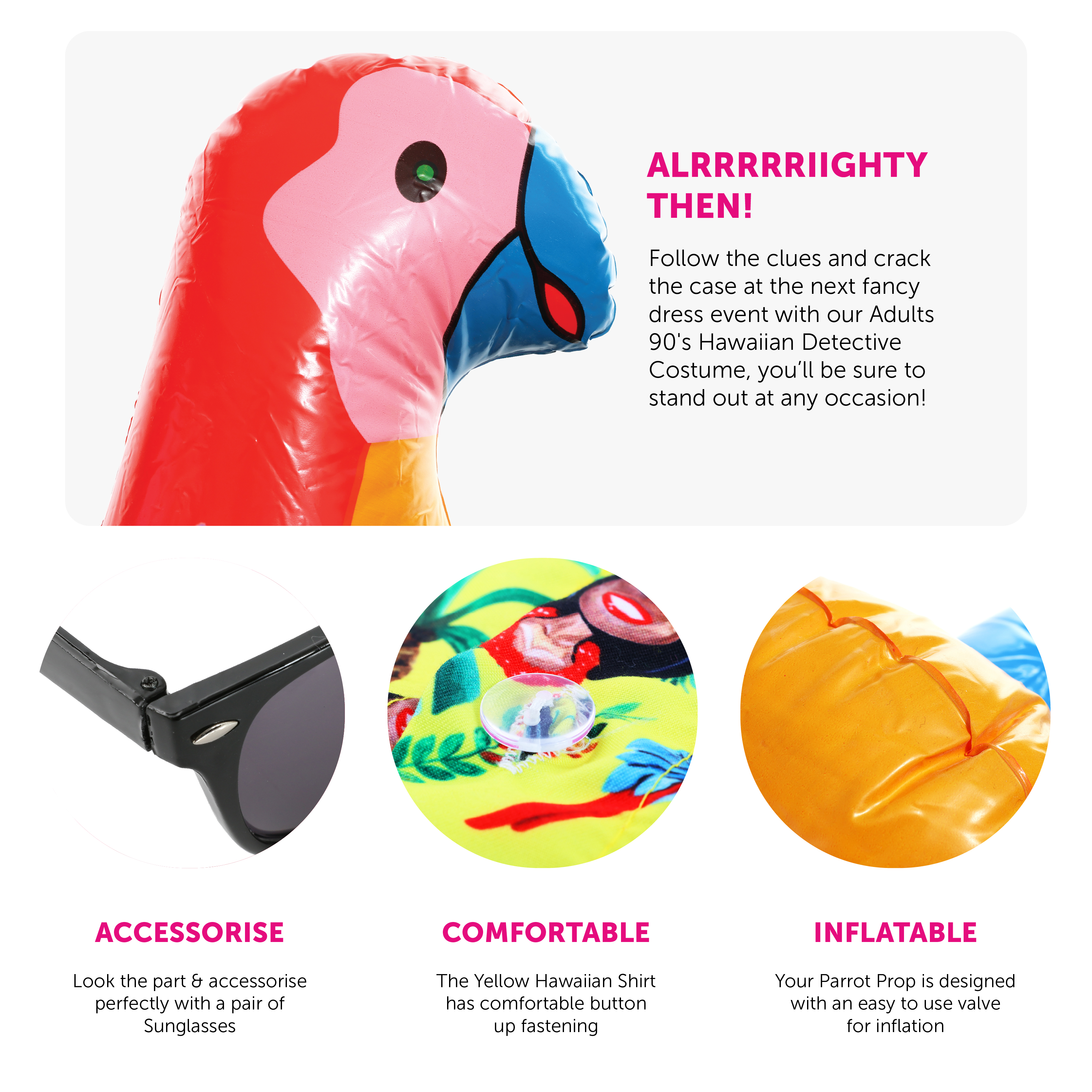 SET INCLUDES: This Adults 90's Hawaiian Detective Costume Set includes a Short Sleeved Yellow Shirt with a unique Hawaiian pattern, a White T Shirt, a pair of Sunglasses, and an Inflatable Parrot with an easy to use valve!