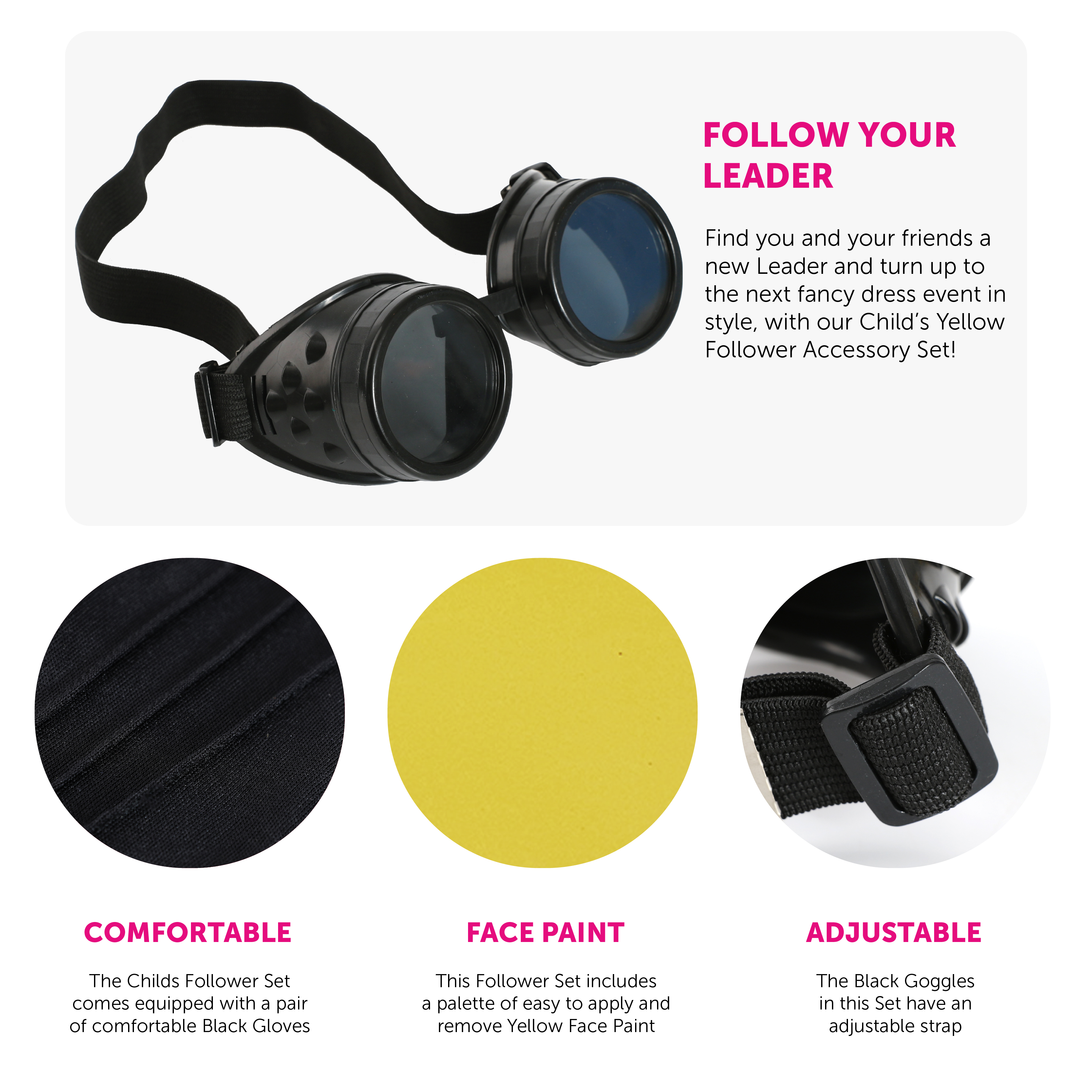 YELLOW FOLLOWER SET INCLUDES: Your Adults Yellow Follower Accessory Set includes a pair of Black Goggles with an adjustable strap, a pair of Black Gloves and a palette of easy to apply and remove Yellow Face Paint, to finish off your outfit!