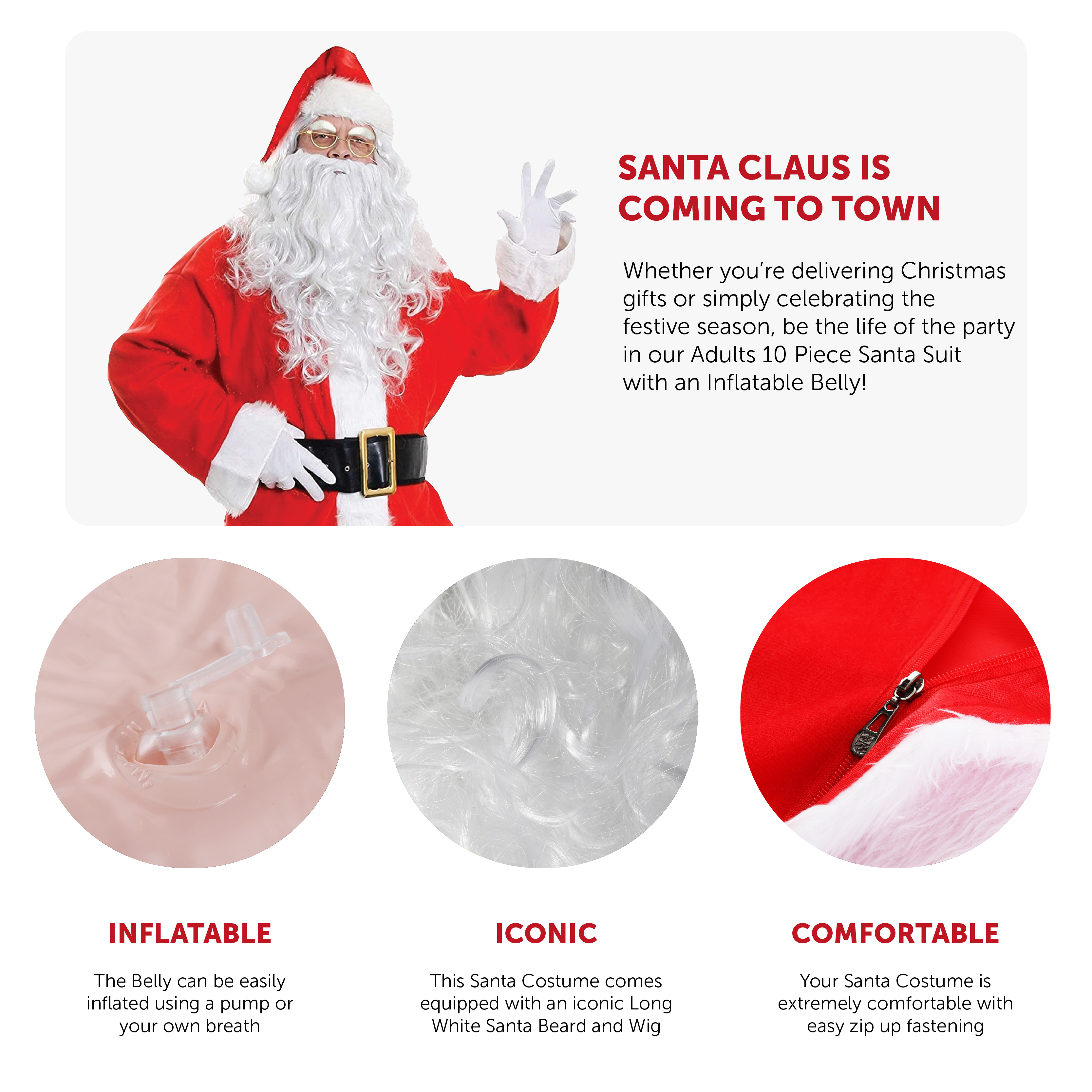 PERFECT FOR CHRISTMAS & SANTA FANCY DRESS: Whether you’re getting ready to jingle all the way to your next Christmas event, or to dress up as the man himself for the big day, then our Adults 11 Piece Santa Costume has you set for the event!