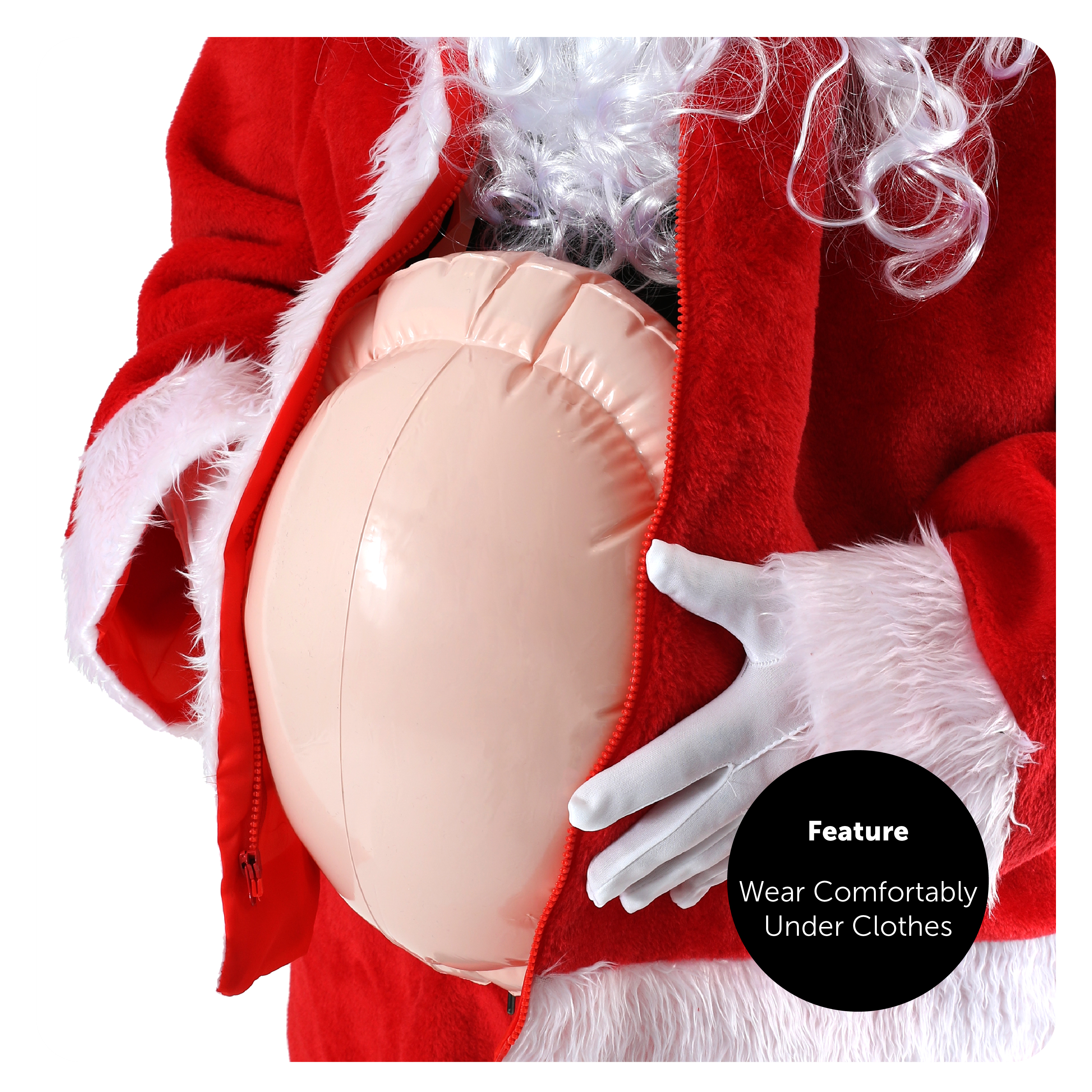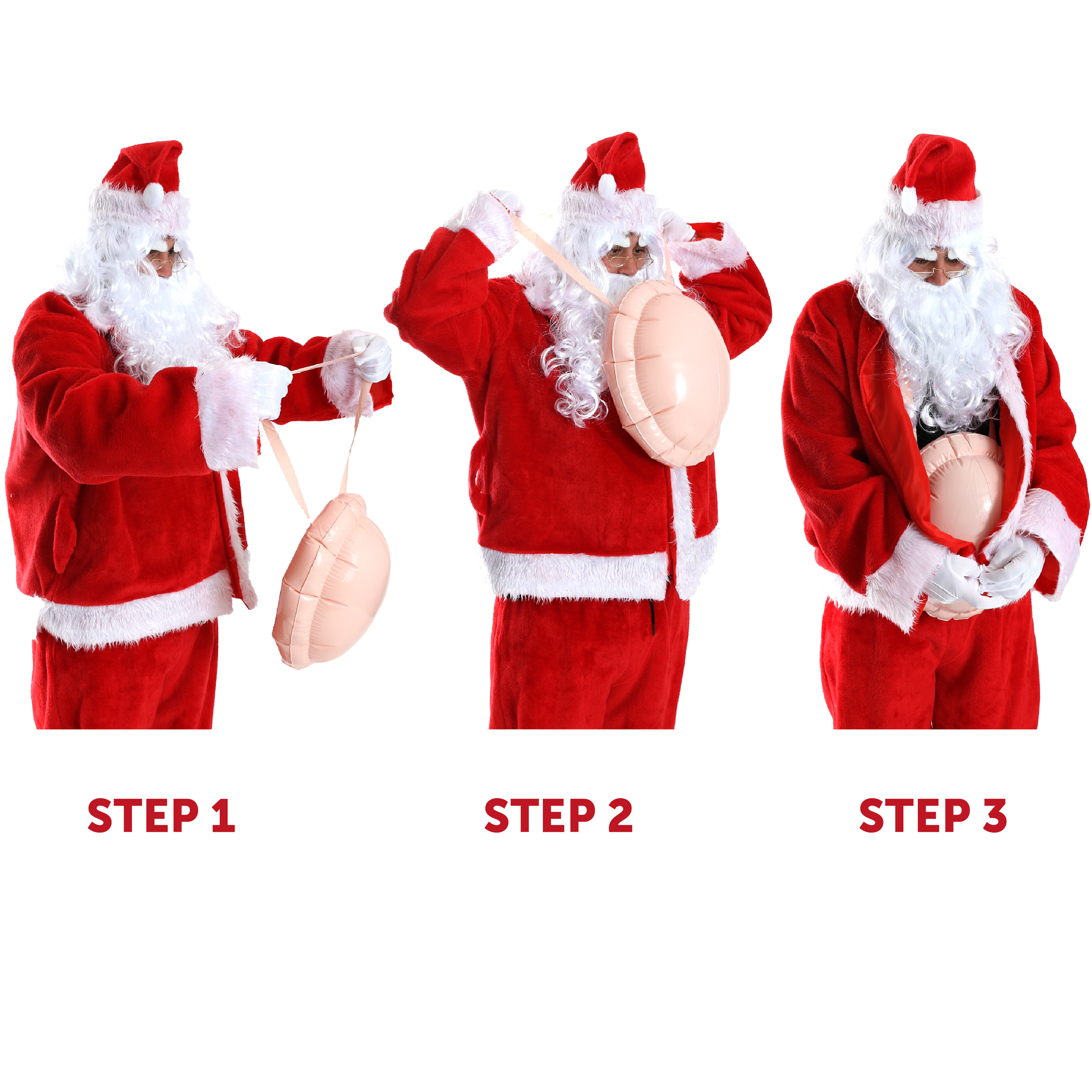 COSTUME INCLUDES: This Santa Costume includes a Red Zipped Jacket with Faux Fur Detail, Red Trousers with an Elasticated Waistband, Santa Hat with White Bobble, Large Black Belt with Gold Buckle, Long White Santa Beard with Elastic, Long White Santa Wig, Pair of White Gloves, Black Boot Covers with White Faux Fur Detail, Gold Half Moon Glasses, White Stick-on Eyebrows and an Inflatable Belly with arm straps, the perfect festive look!