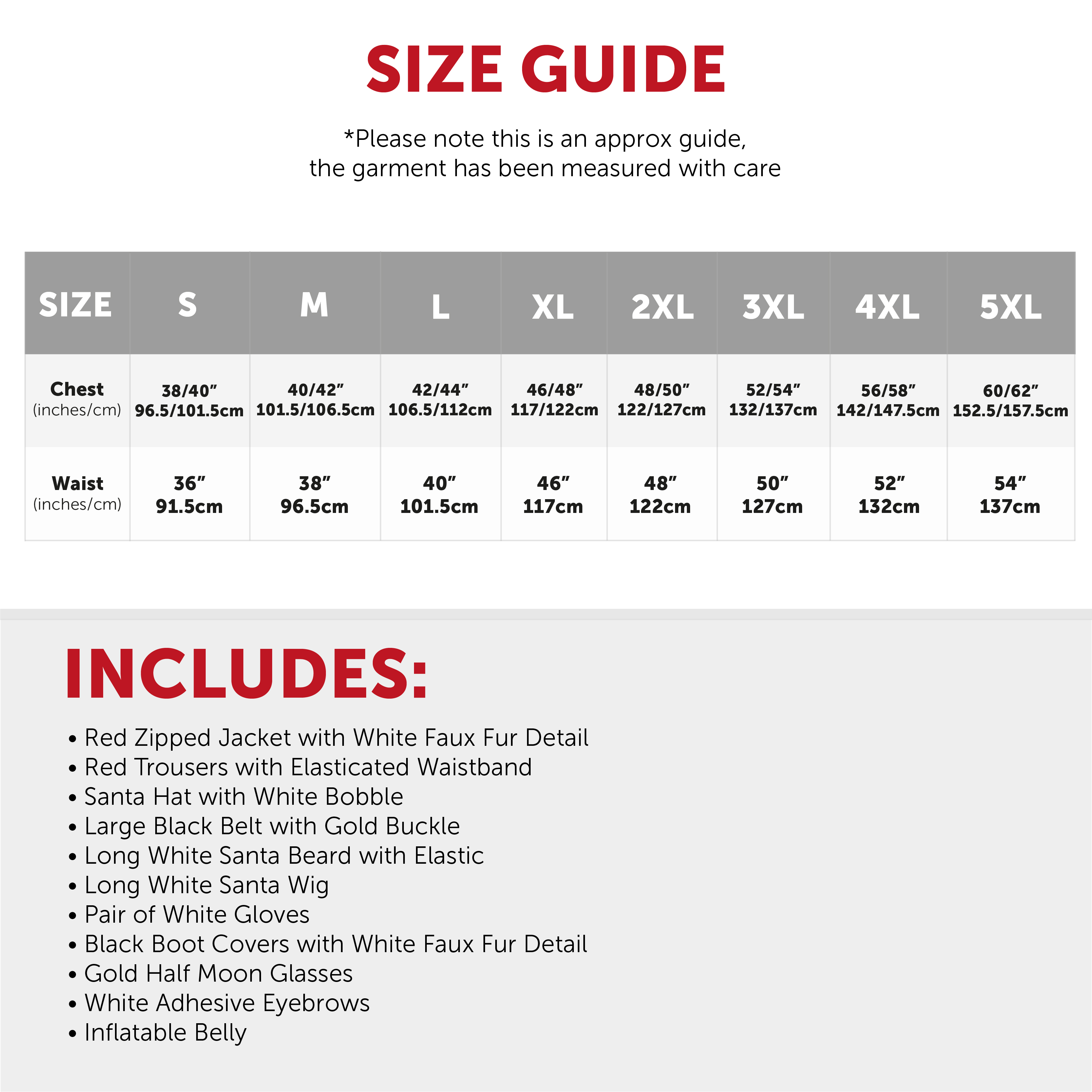AVAILABLE IN MULTIPLE SIZES: Your Santa Costume is available in multiple sizes from Small to XXXXX-Large: Small: Chest: 38/40" (96.5/101.5cm), Waist: 36" (91.5cm) | Medium: Chest: 40/42" (101.5/106.5cm), Waist: 38" (96.5cm) | Large: Chest: 42/44" (106.5/112cm), Waist: 40"(101.5cm) | X Large: Chest: 46/48" (117/122cm), Waist: 46" (117cm) | XX Large: Chest: 48/50" (122/127cm), Waist: 48" (122cm) | XXX Large: Chest: 52/54" (132/137cm), Waist: 50" (127cm) | XXXX Large: Chest: 56/58" (142/147.5cm), Waist: 52" (132cm) | XXXXX Large: Chest: 60/62" (152.5/157.5cm), Waist: 54" (137cm)