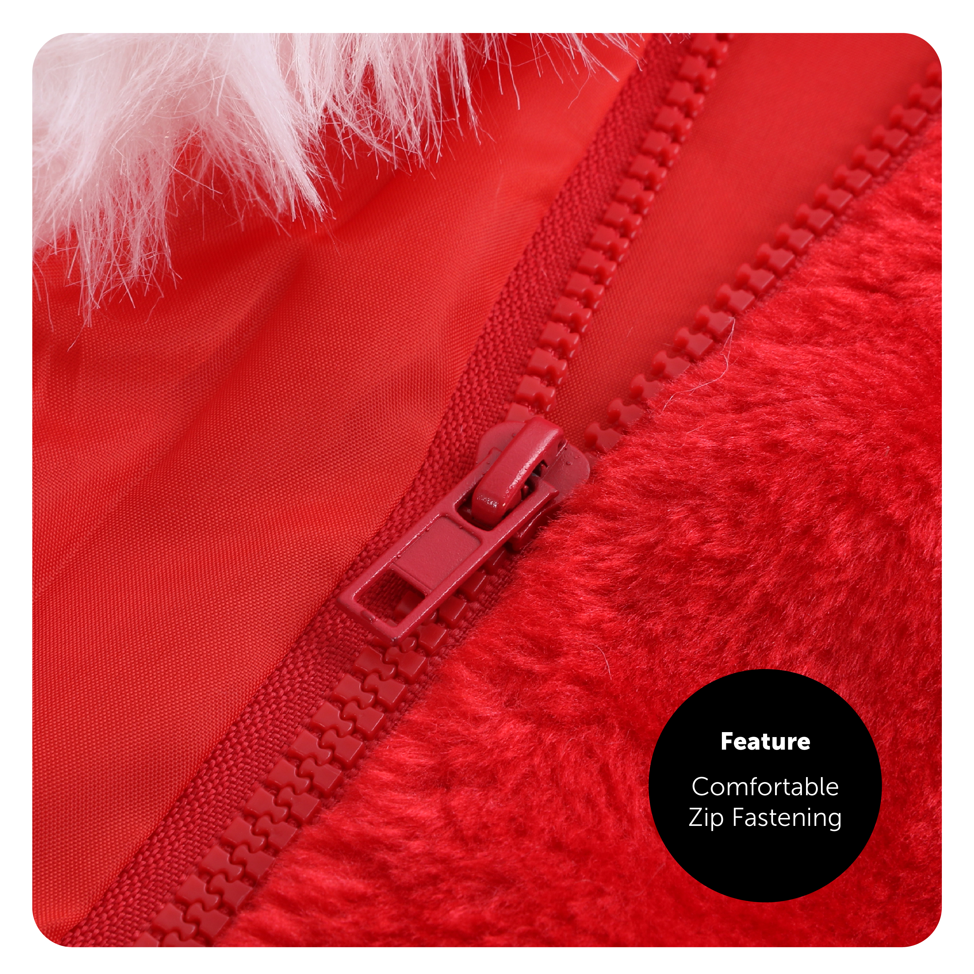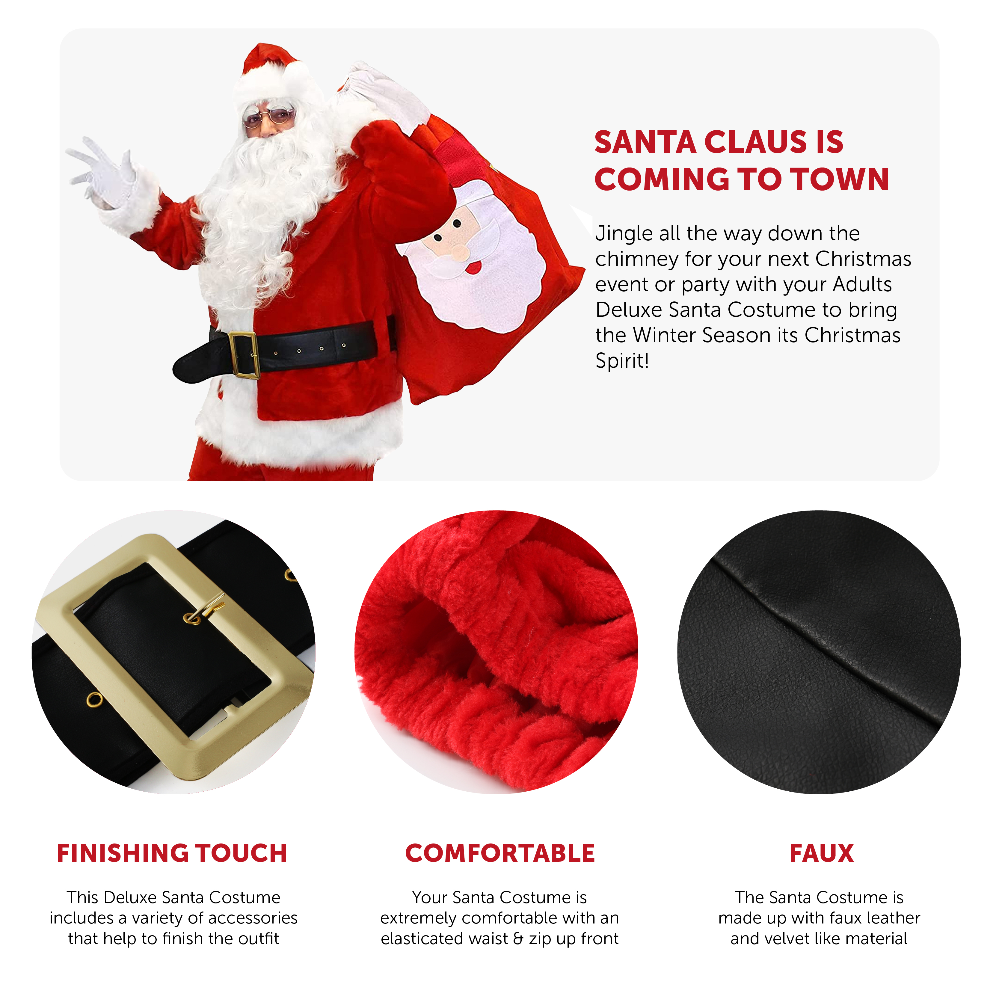 ADULTS DELUXE SANTA SUIT COSTUME: Jingle all the way down the chimney for your next Christmas event or party with our Adults Deluxe Santa Costume to bring the Winter Season it's Christmas Spirit! COSTUME INCLUDES: This Deluxe Santa Costume includes a Red Zipped Jacket with Faux Fur Detail, Red Trousers with an Elasticated Waistband, Santa Hat with White Bobble, Large Black Belt with Gold Buckle, Long White Santa Beard with Elastic, Long White Santa Wig, Pair of White Gloves, Black Boot Covers with White Faux Fur Detail, Gold Half Moon Glasses, White Stick-on Eyebrows, and a Large Christmas Santa Sack, the perfect festive look! AVAILABLE IN MULTIPLE SIZES: Your Deluxe Santa Costume is available in multiple sizes from X-Large/XX-Large to XXXX-Large: X-Large/XX-Large - Chest: up to 52" (132cm), Jacket Length: 34" (86cm), Arm Length: 23" (58cm), Waist: up to 46" (117cm), Trouser Length: 33" (84cm), Inside Leg: 21" (53cm) | XXX-Large - Chest: up to 58" (147cm), Jacket Length: 35" (89cm), Arm Length: 23" (58cm), Waist: up to 48" (122cm), Trouser Length: 35" (89cm), Inside Leg: 22" (56cm) | XXXX-Large - Chest: up to 66" (168cm), Jacket Length: 35" (89cm), Arm Length: 23" (58cm), Waist: up to 52" (132cm), Trouser Length: 36" (91cm), Inside Leg: 22" (142cm) GREAT SIZED ACCESSORIES: The Santa Sack is a great sized accessory, measuring 90cm x 60cm (35" x 24"), you'll be bringing all the festive cheer this year! PERFECT FOR CHRISTMAS & SANTA FANCY DRESS: Whether you’re getting ready to jingle all the way to your next Christmas event, or to dress up as the man himself for the big day, then our Adults Deluxe Santa Costume has you set for the event!