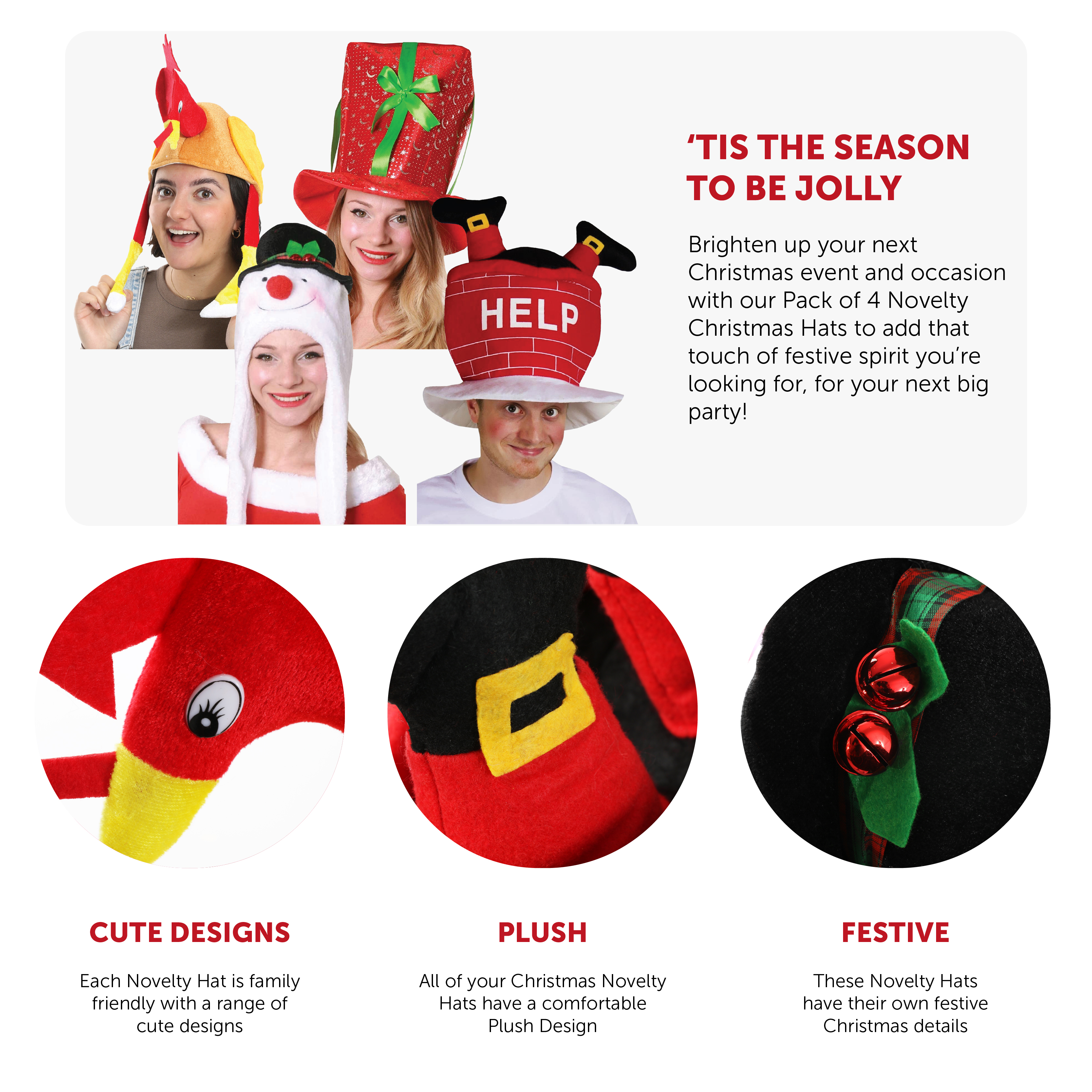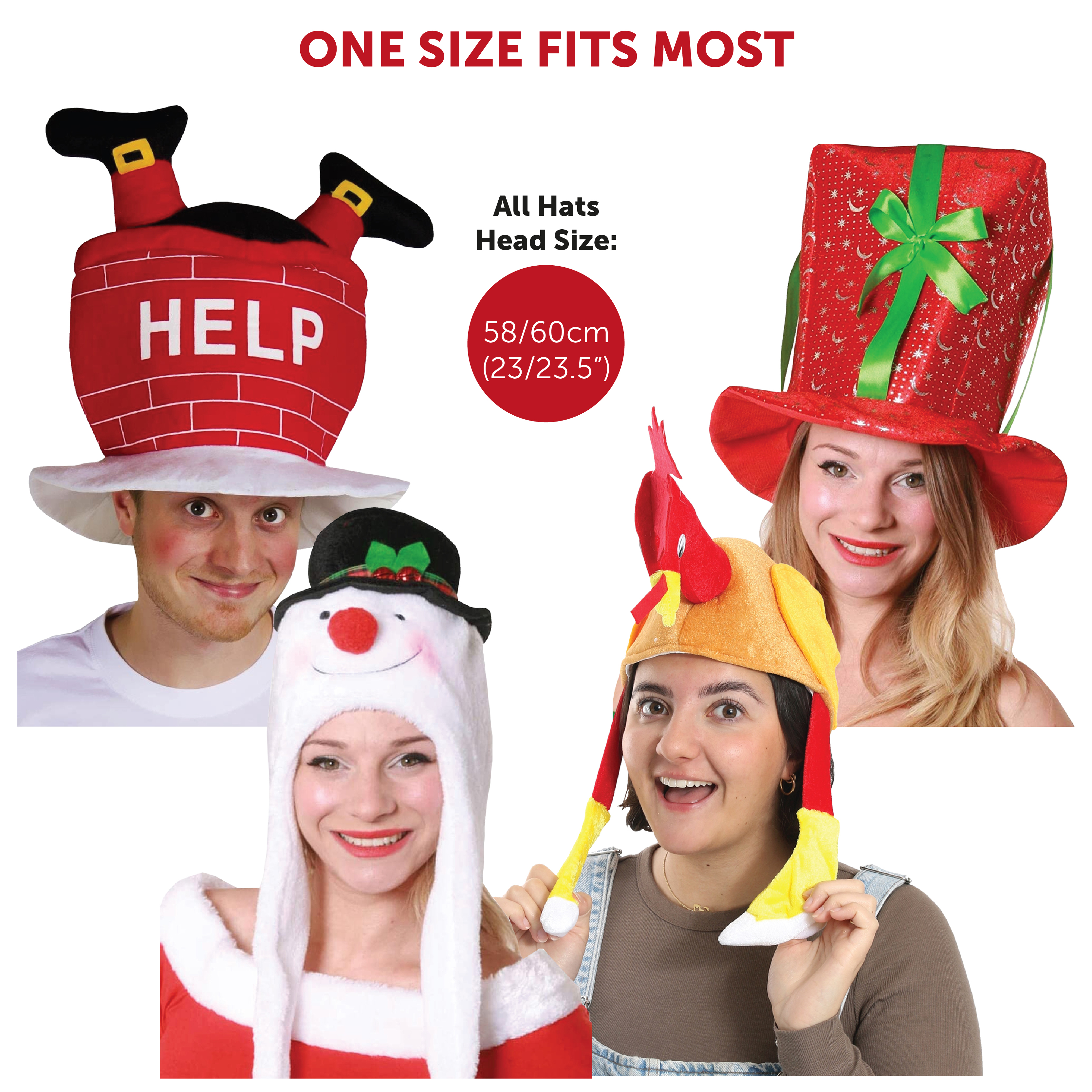 HAT SET INCLUDES: Your Christmas Hat Set includes 4x different Novelty Hats including, 1x Plush, Red Christmas Present Hat covered in a festive Silver pattern and wrapped in a Green Ribbon Bow, 1x Plush, Red Brickwork Chimney Shaped Hat with a White 'Snow' Brim, 'HELP' printed on the front and two Plush Legs sticking out of the top, 1x Soft White Snowman Head Hat, detailed with a Red Nose, Rosy Cheeks, a Black Top Hat with Holly and warm Ear Covers on either side with Green Pom-Poms at the tips, and 1x Plush Brown and Red Turkey Shaped Hat with a Legs hanging down either side!