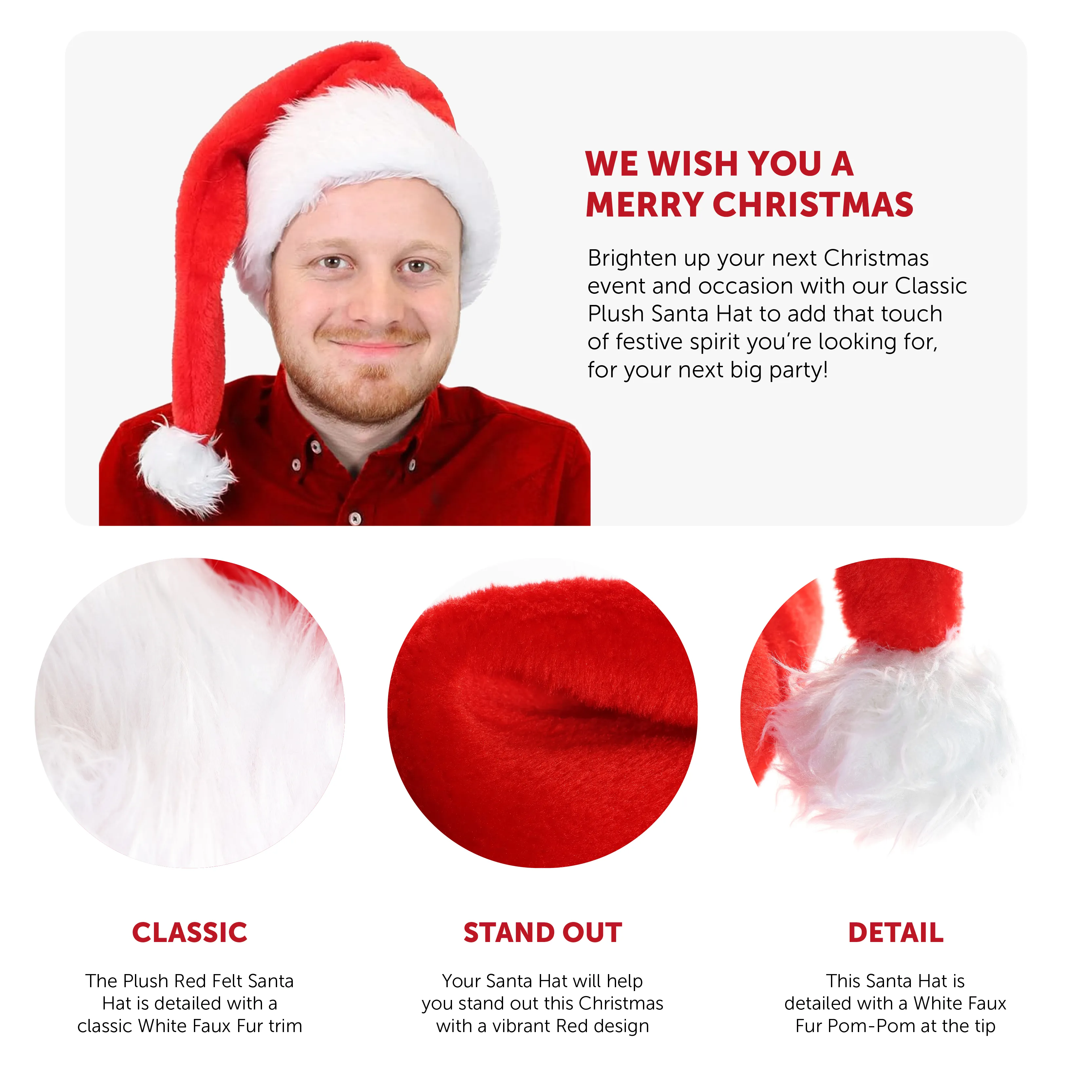 Complete your festive look with our Deluxe Plush Santa Hat, made from soft, high-quality fabric for ultimate comfort. The traditional red and white design with a fluffy white pom-pom brings a timeless Christmas feel to your outfit.