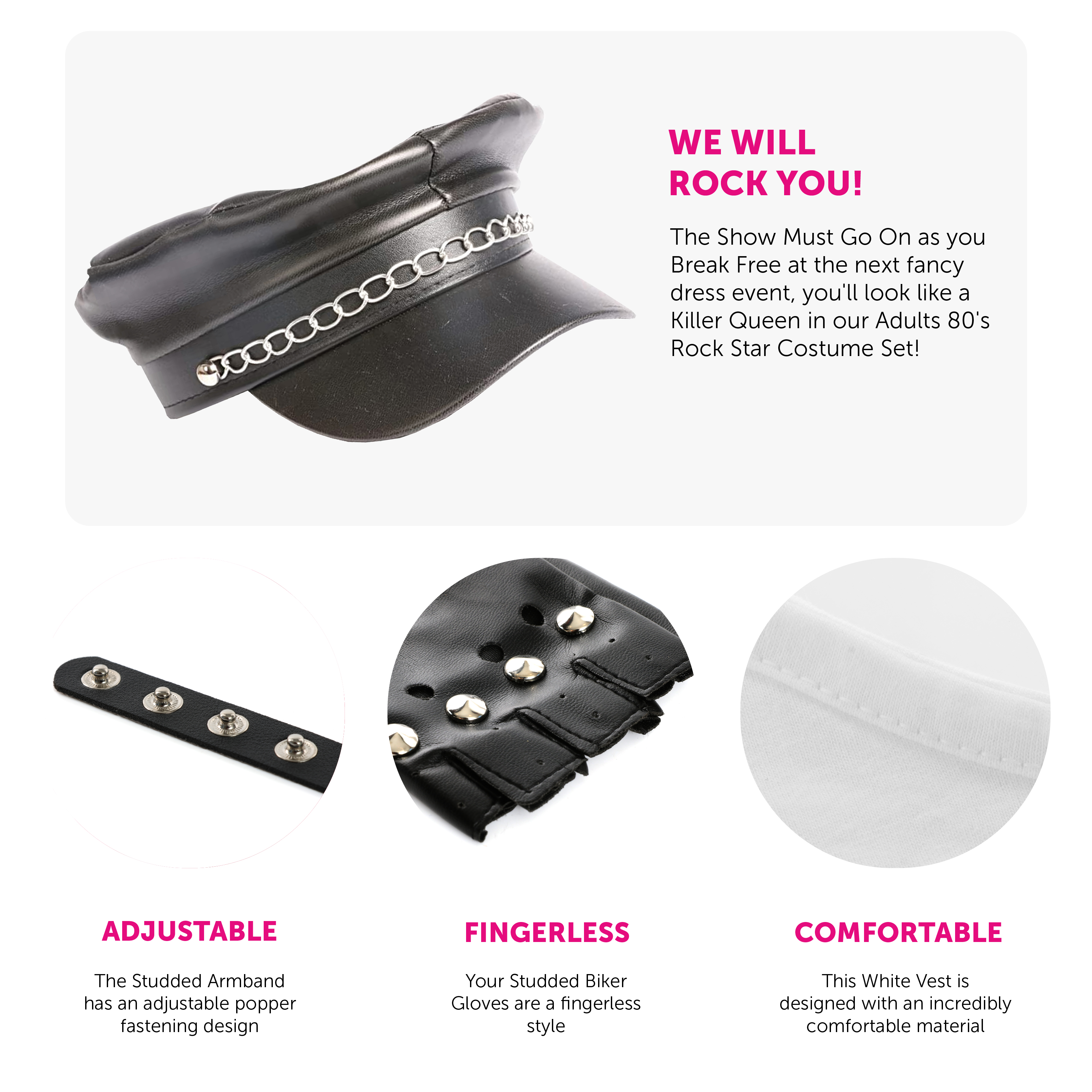 COSTUME SET INCLUDES: This 80's Rock Star Accessory Set includes a Plain White Vest, a Black Faux-Leather Biker Cap with Silver Chain detail, a pair of Mirrored Aviator Sunglasses, a Black Adhesive Moustache, a Faux-Leather, Black Armband with Silver Stud detailing and a pair of Faux-Leather Fingerless Biker Gloves - perfect for music events!