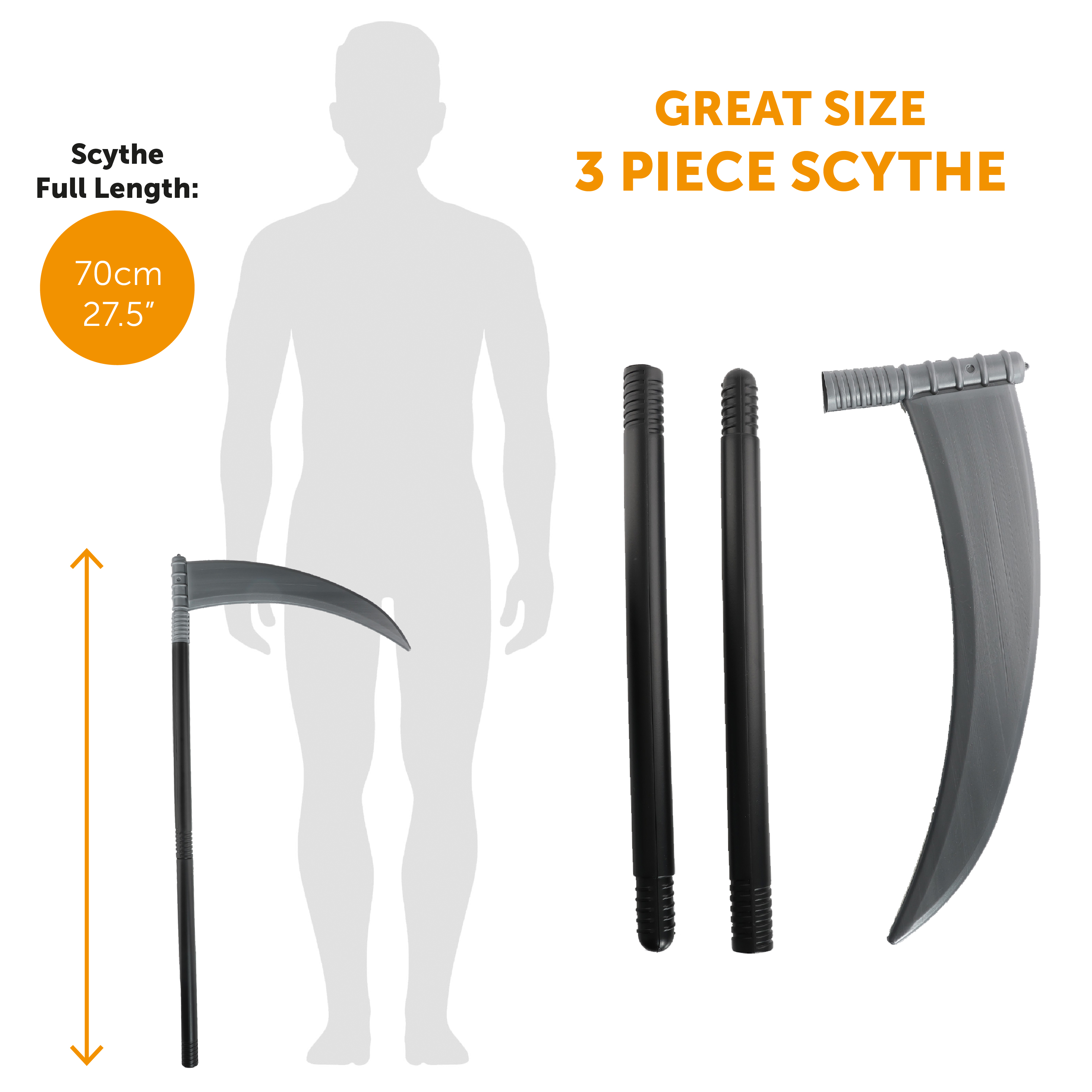 GREAT MEASUREMENT: Finish off your outfit perfectly with the easy to fix, 3 piece Grim Reaper Scythe, measuring a length of 70cm (27.5") - the perfect sized prop to accompany your look!
