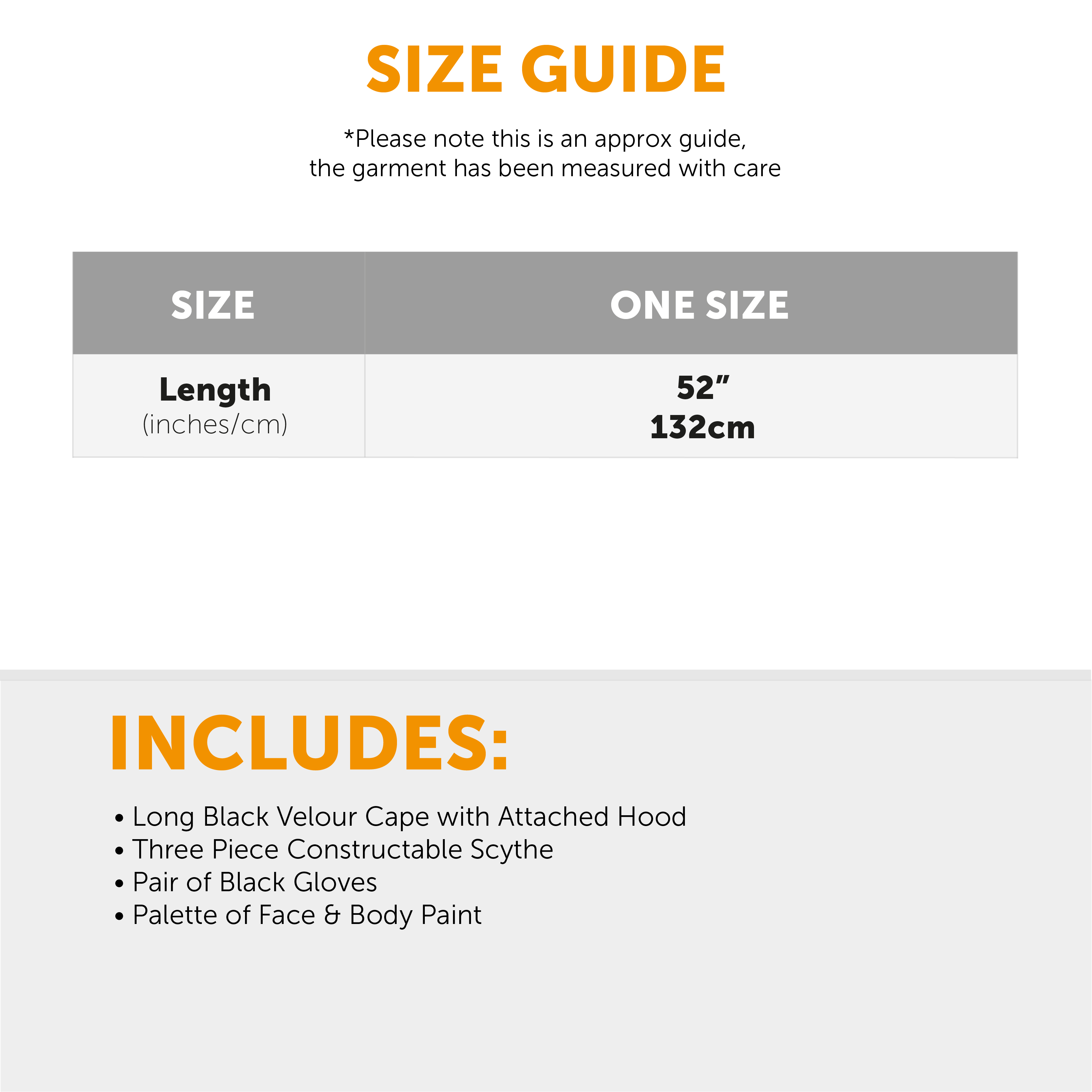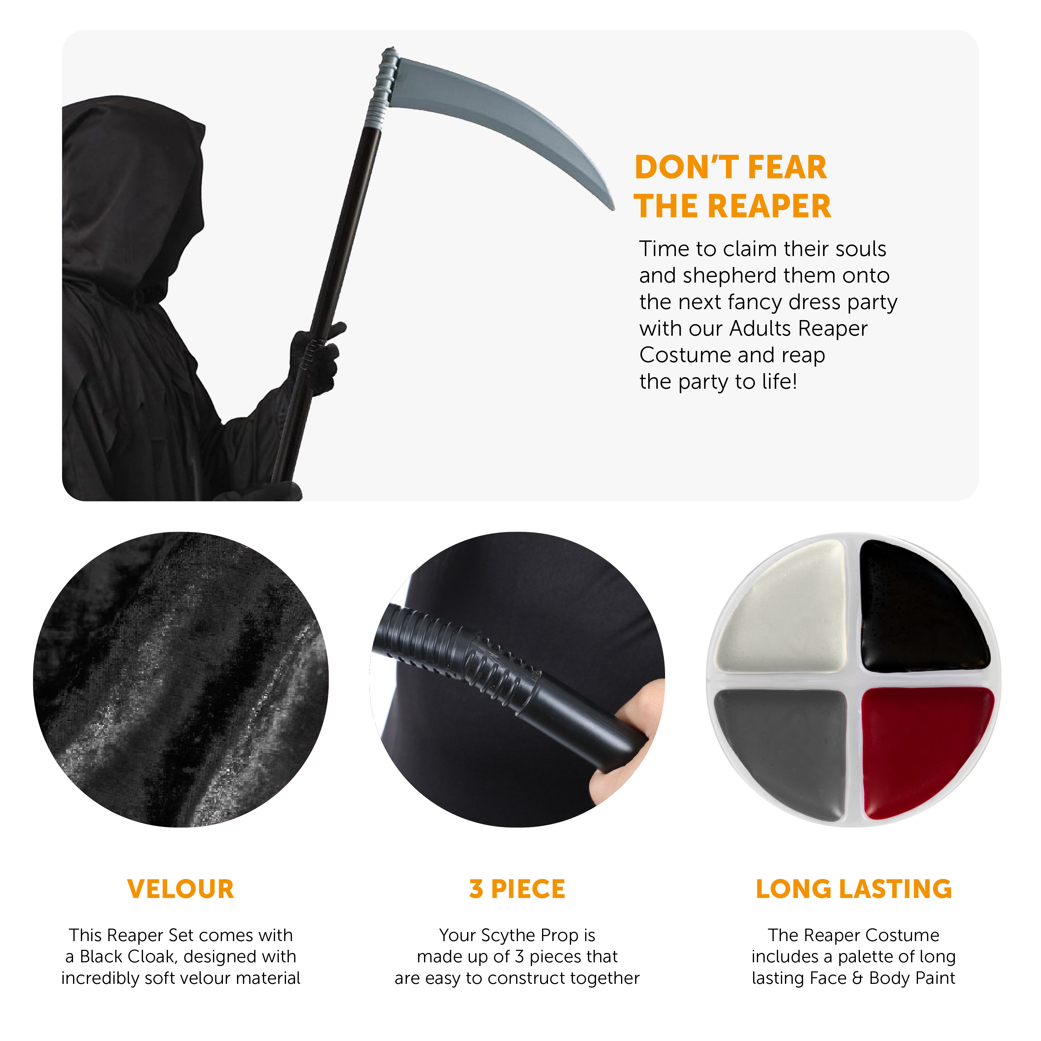 REAPER COSTUME INCLUDES: Your Adults Reaper Costume includes a Long Black Velour Cloak with an attached Hood, a 3 piece constructable Scythe, a pair of Black Gloves, and a palette of Face and Body Paint, the perfect Costume Set for any Halloween event!