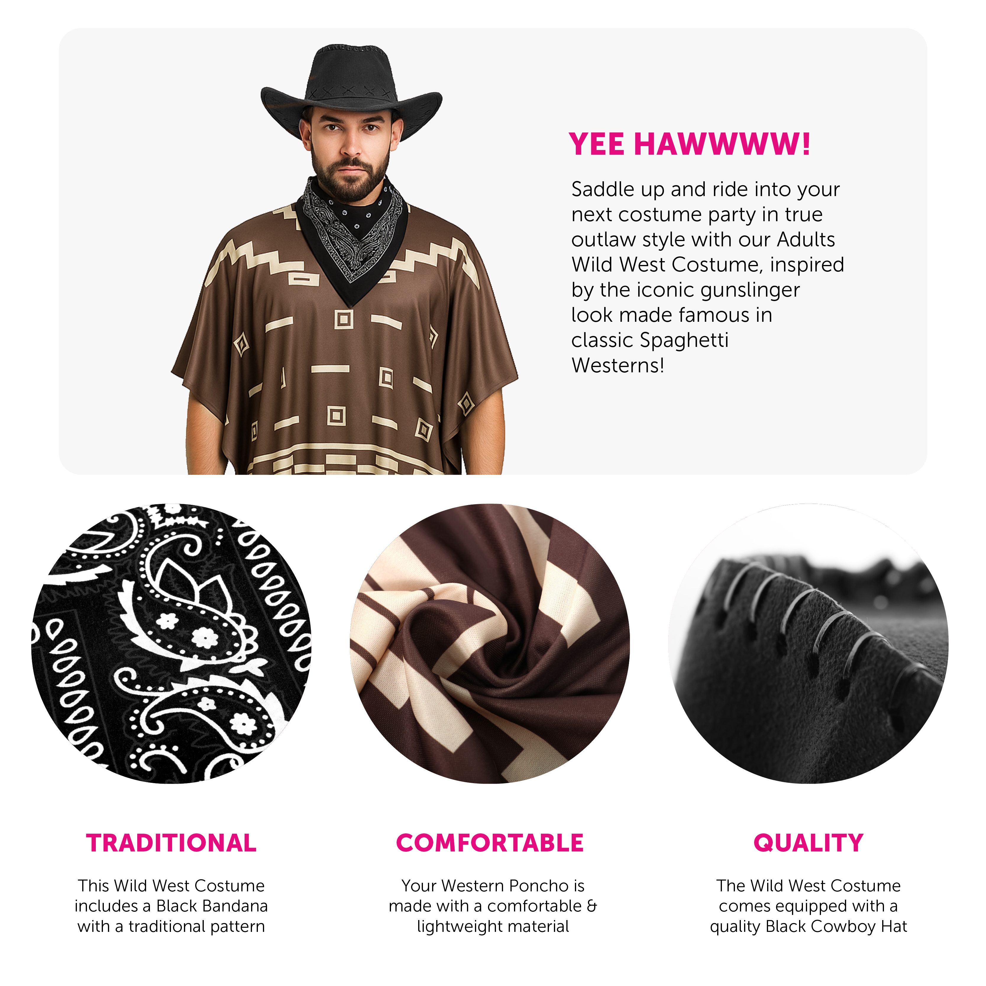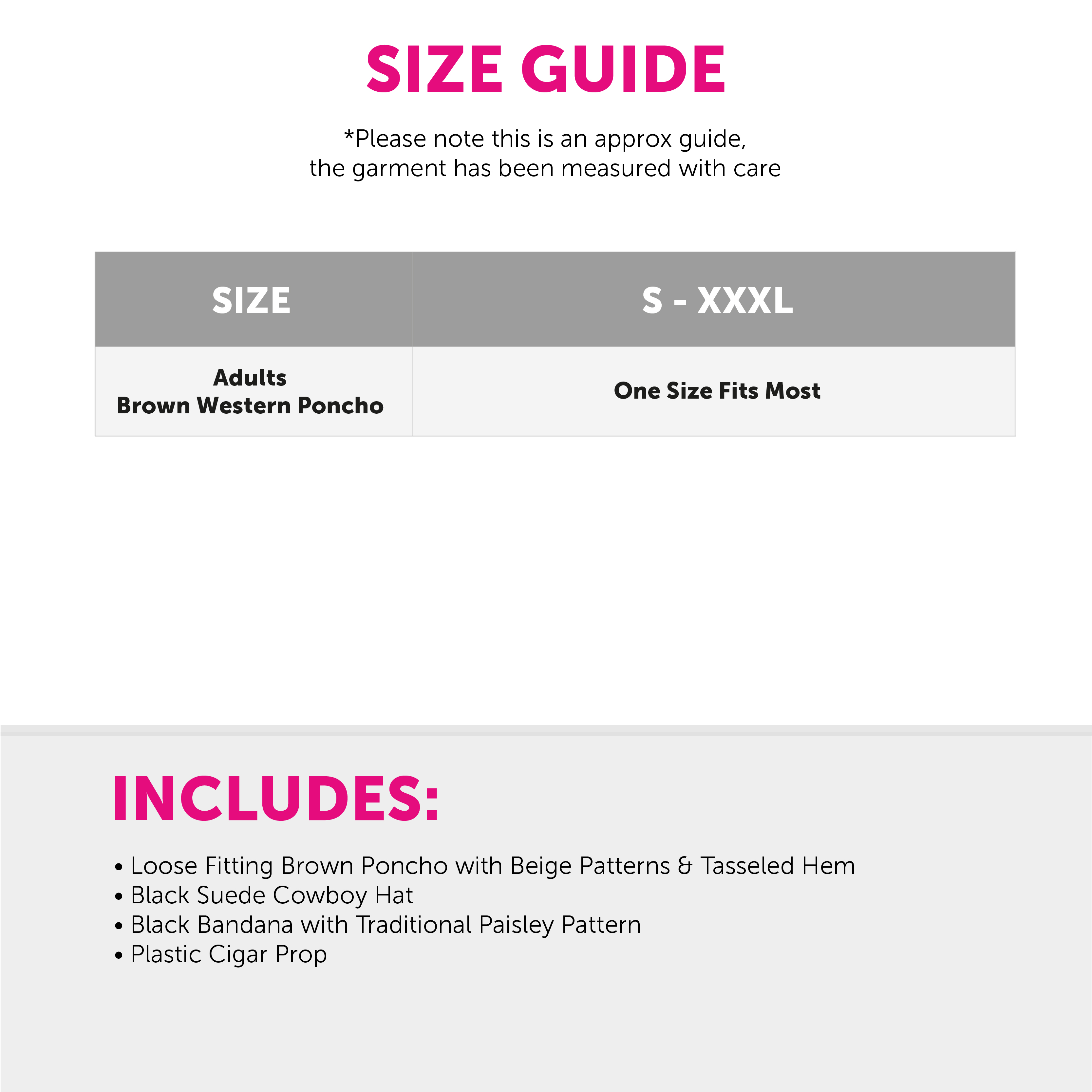 COSTUME INCLUDES: Your Adults Wild West Costume includes a Large Brown Poncho detailed with bold geometric patterns and a Tasseled Hem, a Black Faux Suede Cowboy Hat, Plastic Cigar, and a Black Bandana with a traditional paisley pattern, to complete the look!