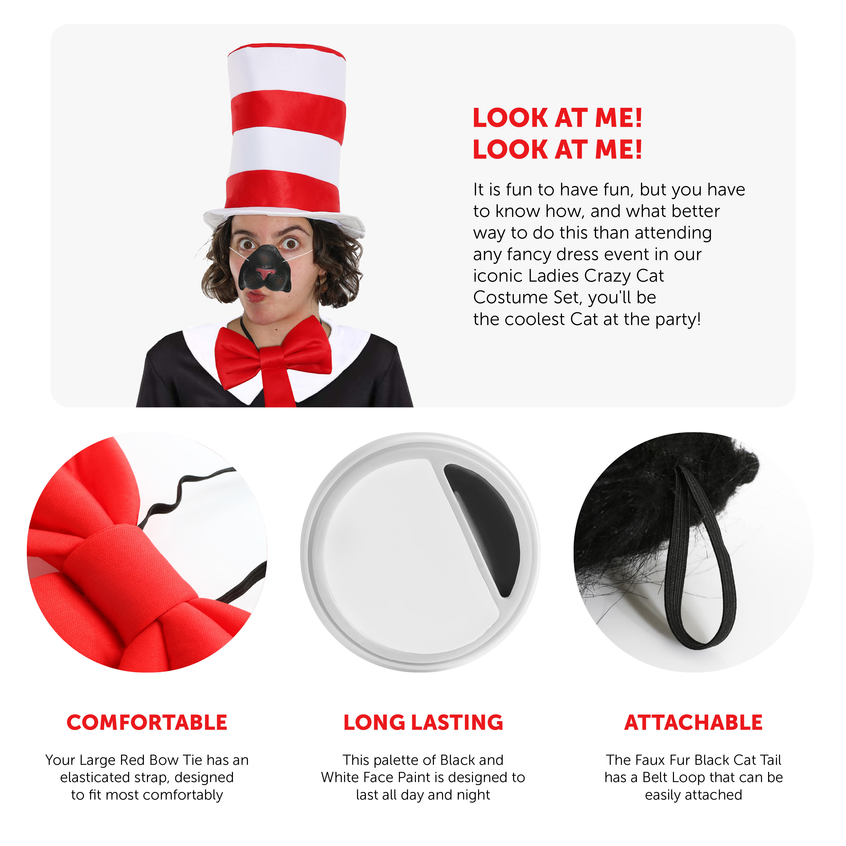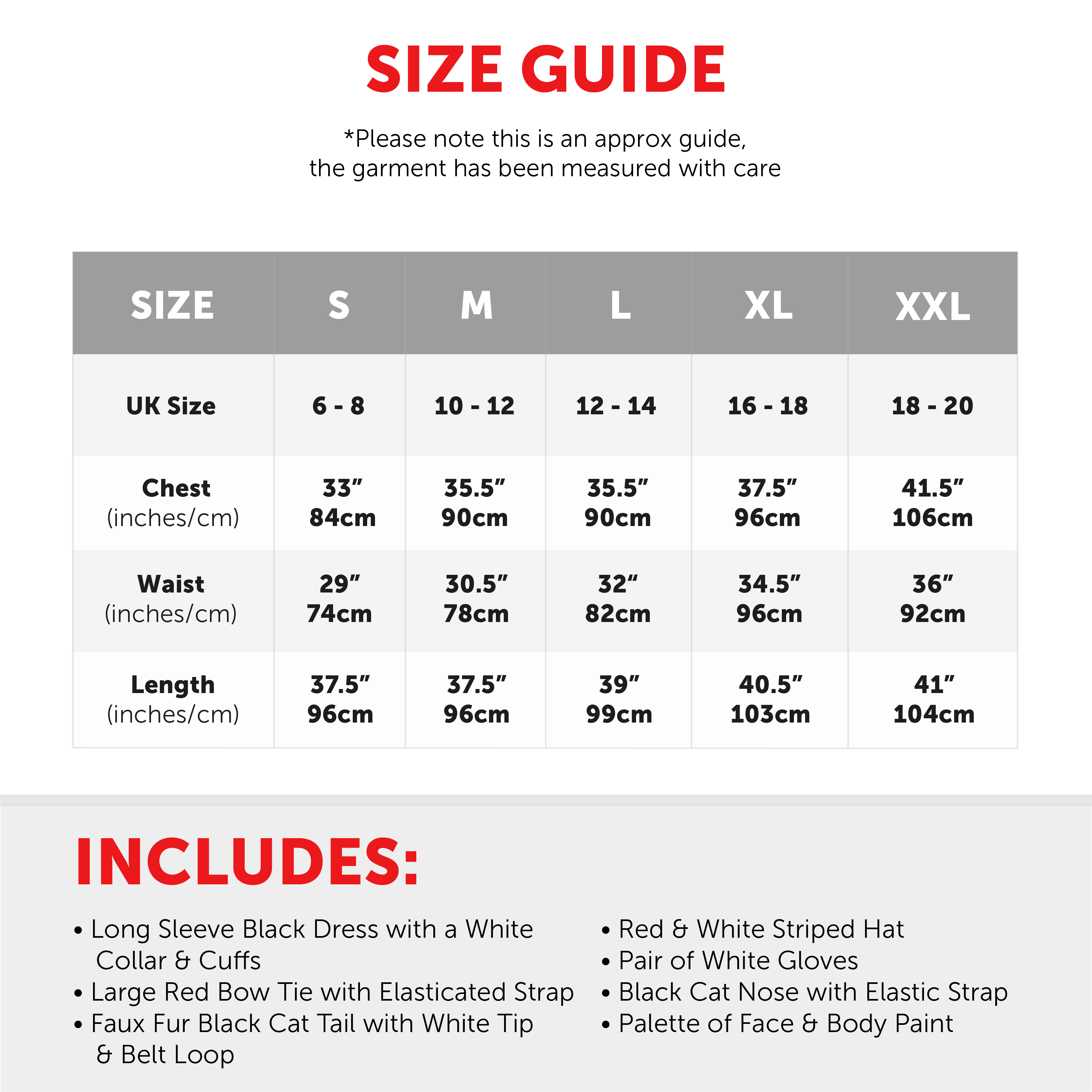 COSTUME INCLUDES: Your Ladies Crazy Cat Costume includes a Black Dress with White Cuff and Collar detail, a tall, Red and White Striped Top Hat, a Black Cat Nose on an elastic strap, a pair of White Gloves, a large Red Bow Tie, a Black Cat Tail with a White tip and Belt Loop, and a palette of Black and White Face Paint, the perfect look for you this World Book Day!