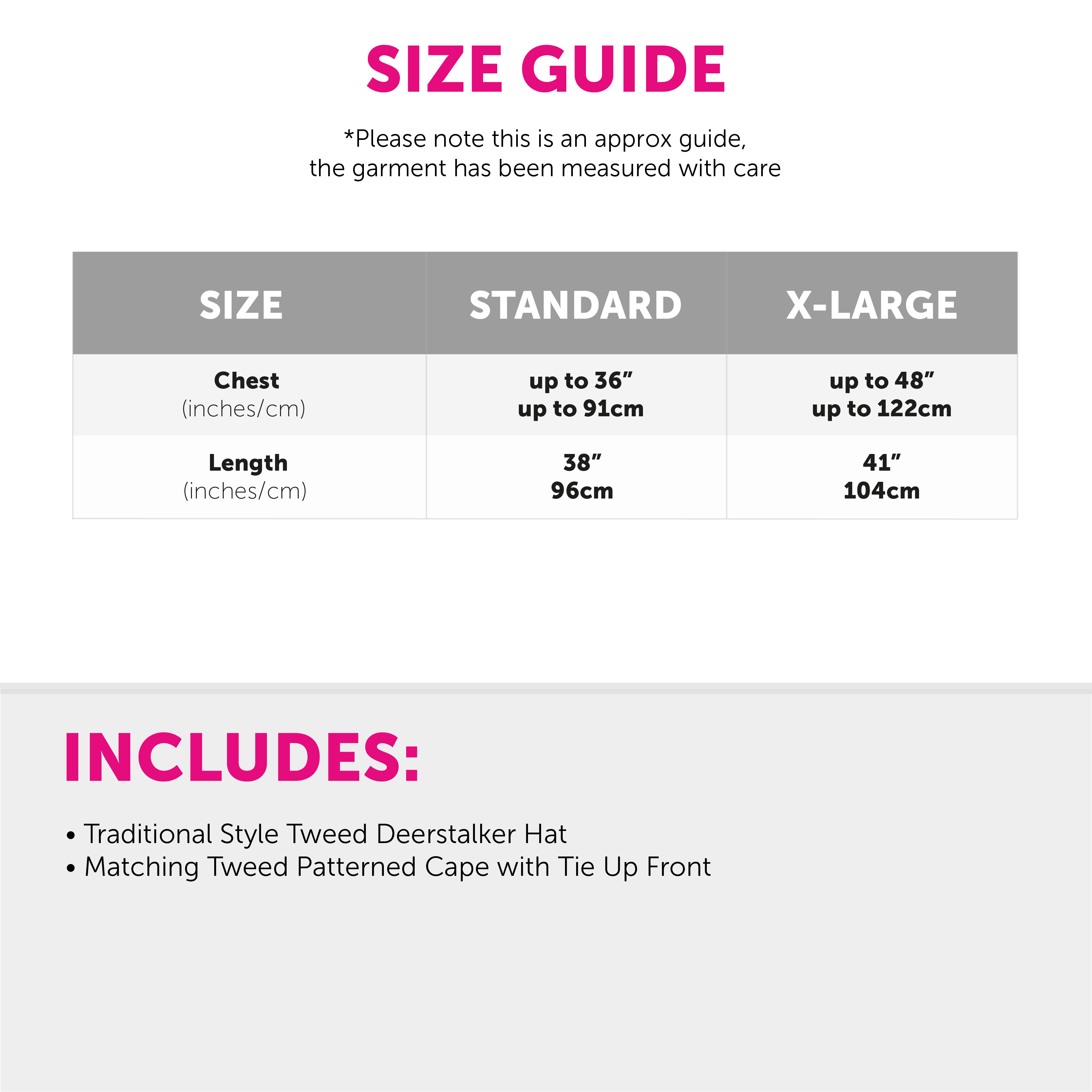 AVAILABLE IN 2 ADULT SIZES: Our Detective Costume is available in 2 Adults Sizes from Standard to X-Large: Standard: Chest Up To: 36"/91cm, Length: 38"/96cm | X-Large: Chest Up To: 48"/122cm, Length: 41”/104cm