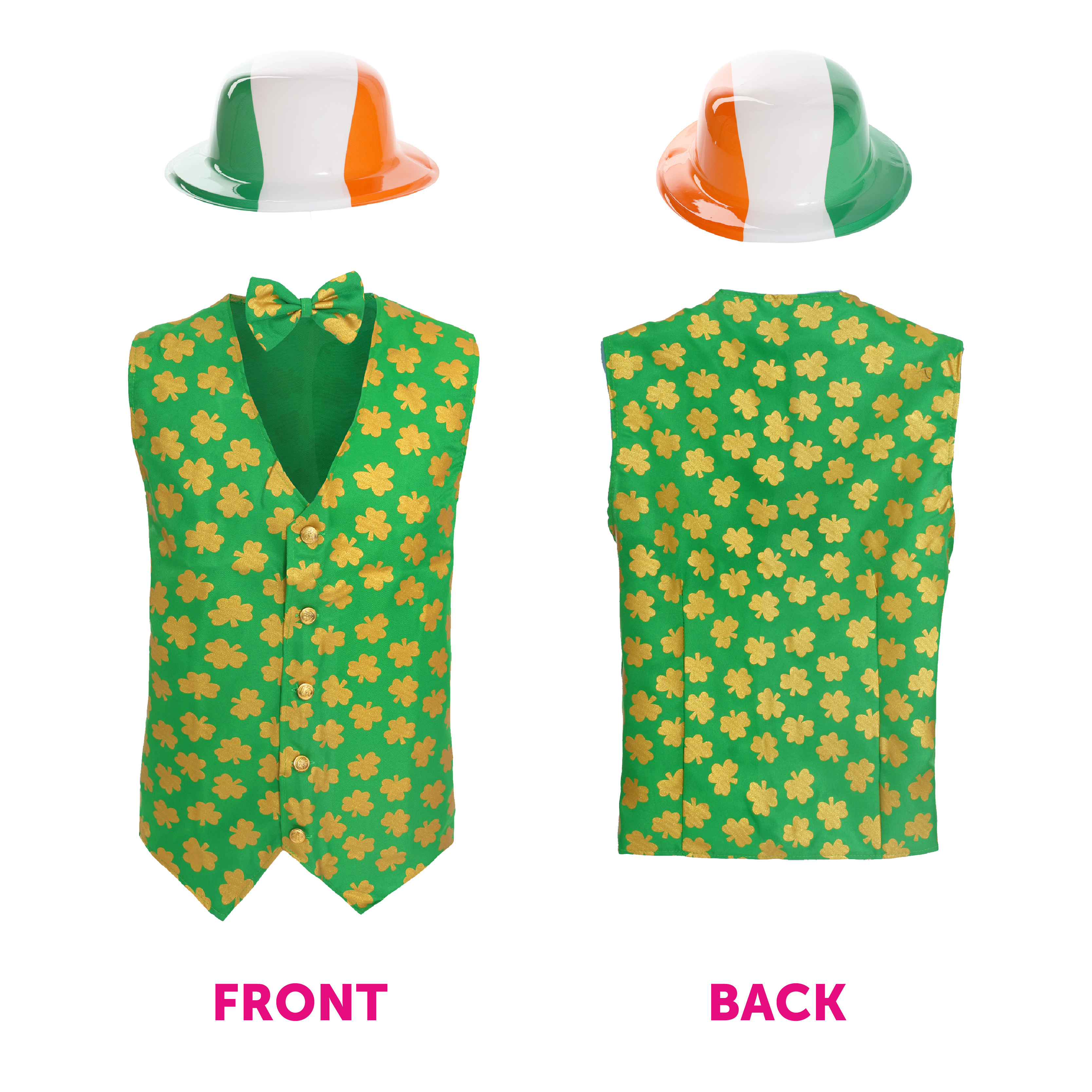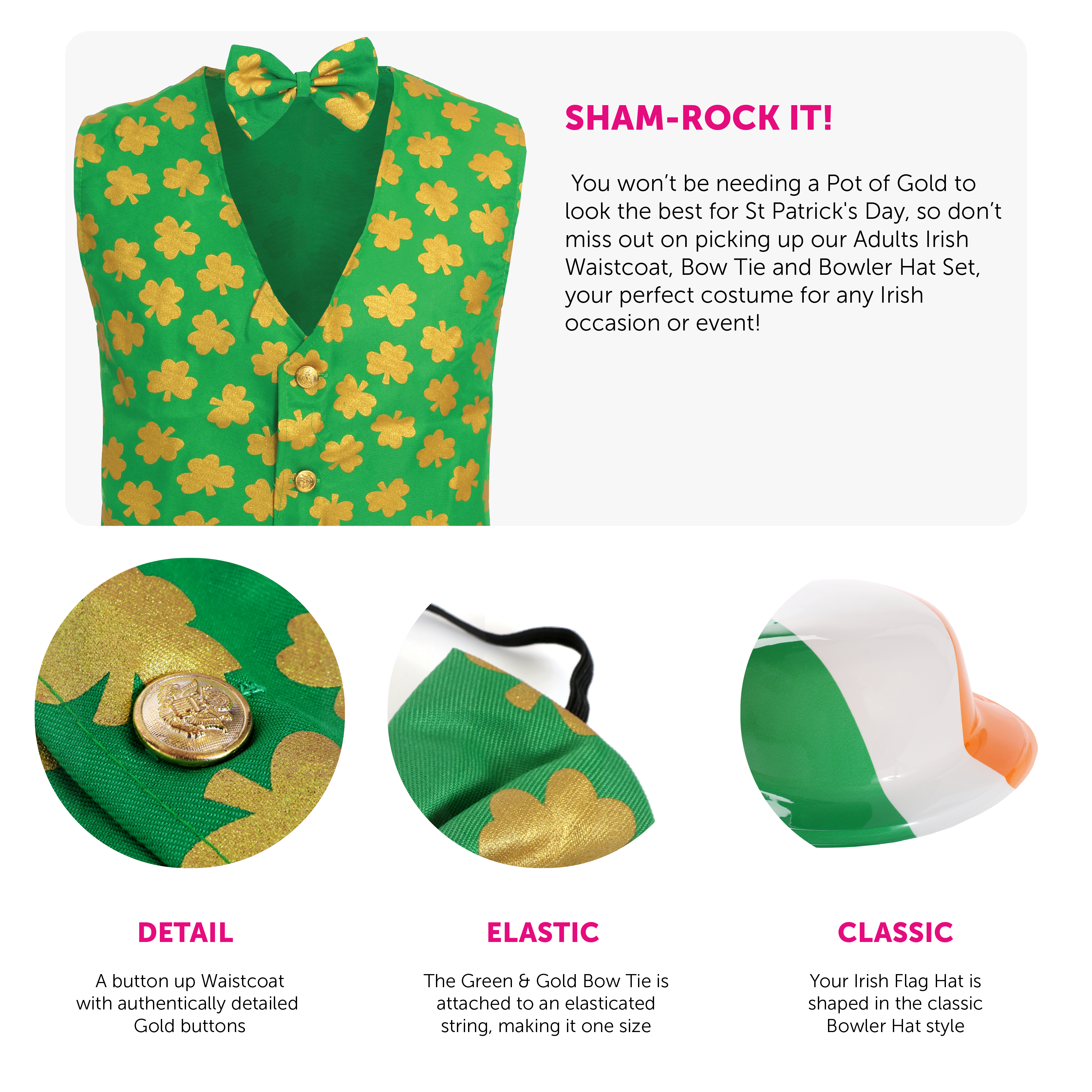 IRISH SET DETAILS: This Irish Costume Set includes a Green Irish Waistcoat with a Golden Shamrock Print, a Matching Bow Tie on an elastic band, and plastic Bowler Hat sporting Ireland's Flag, to complete your St Patrick's Day Costume Set!