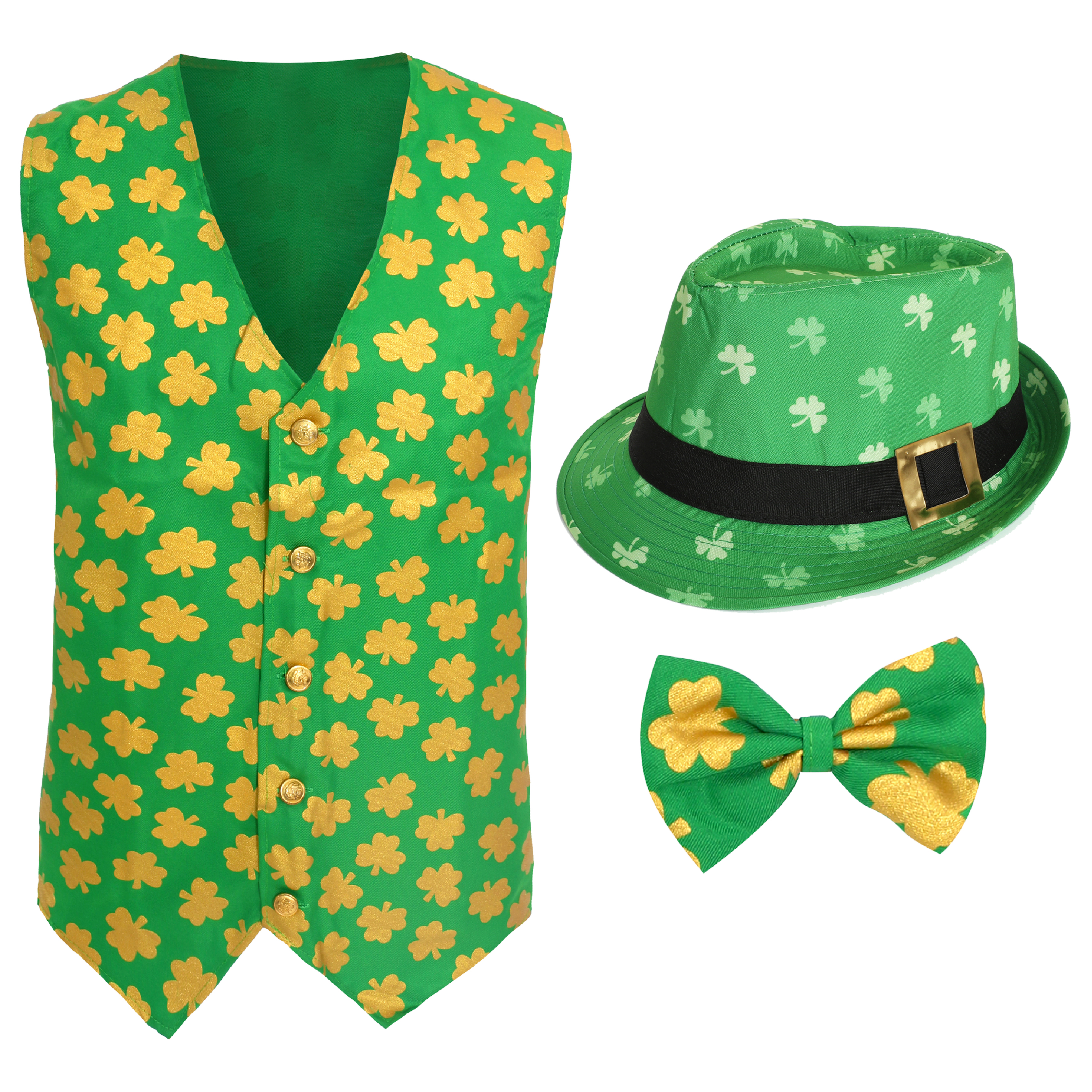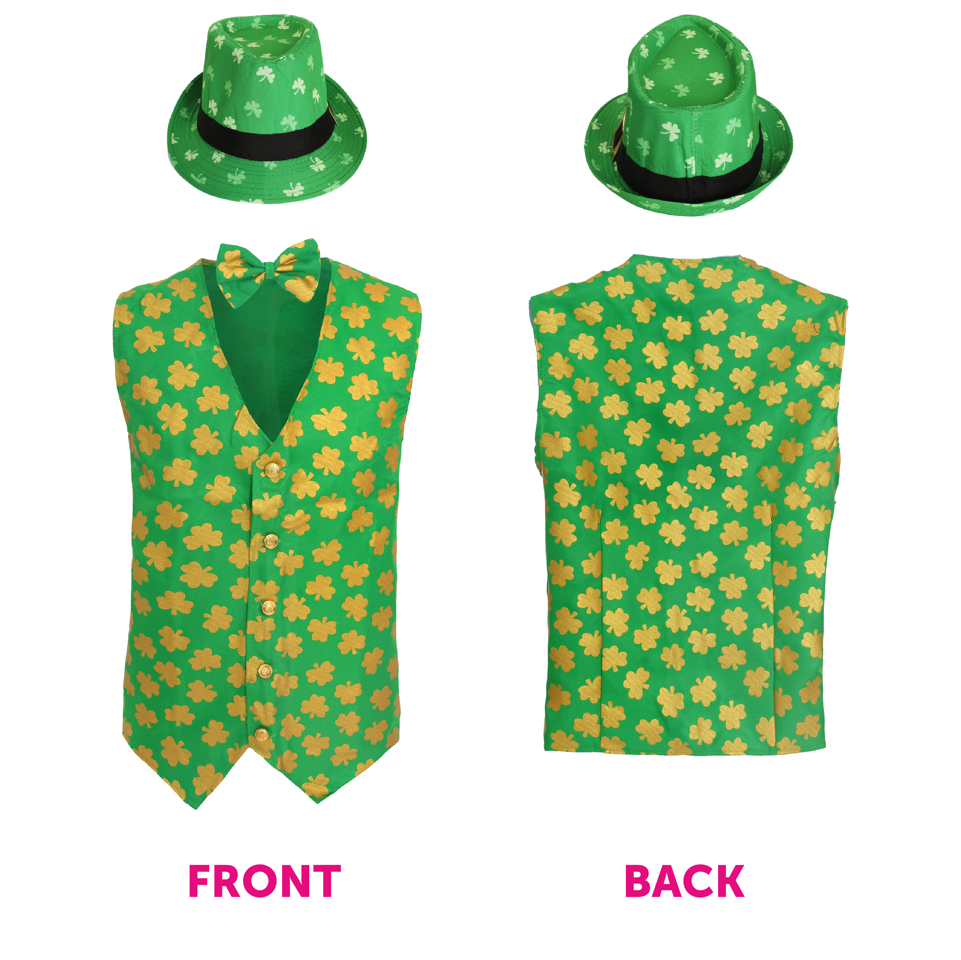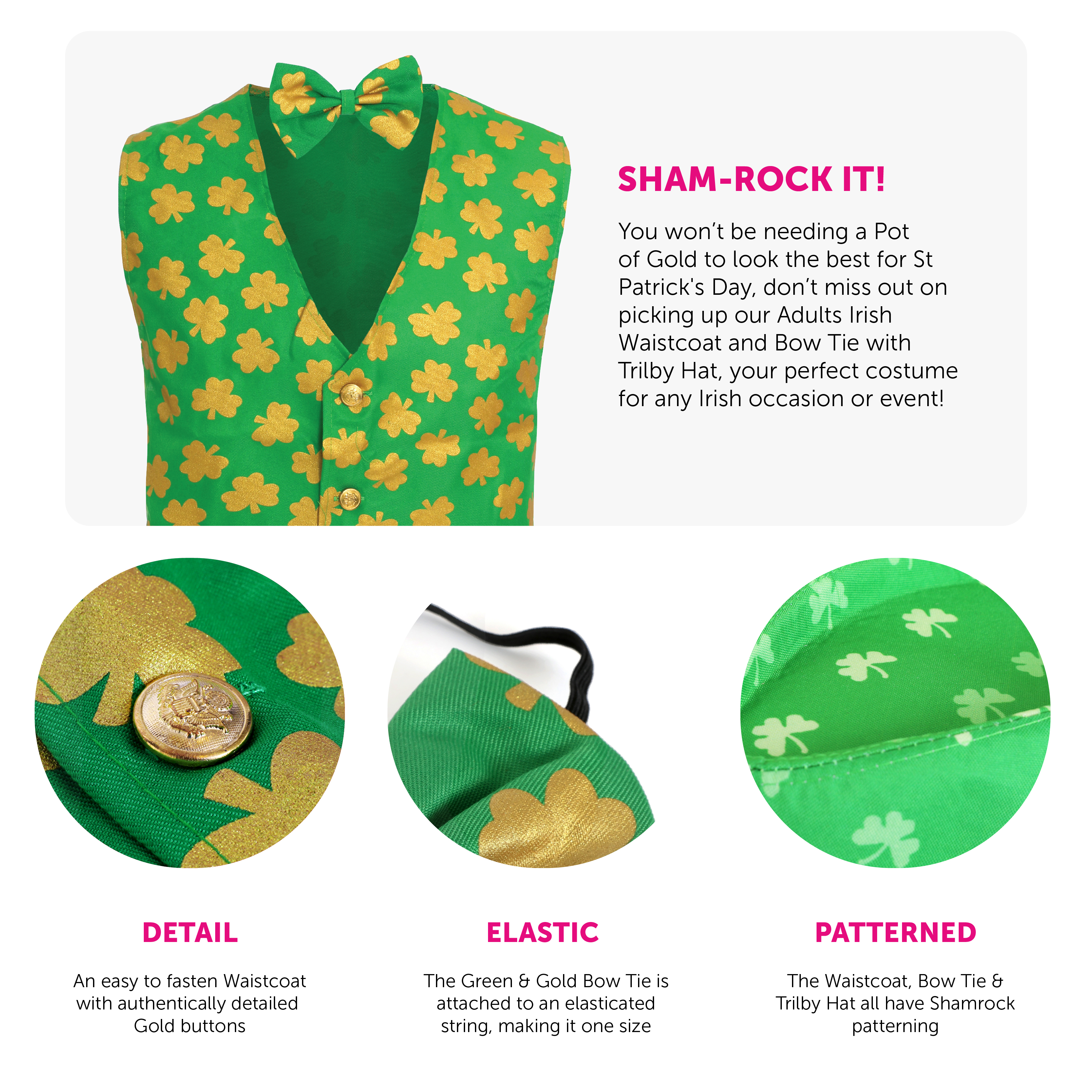 COSTUME DETAILS: This Adults Irish Costume includes a Green Irish Waistcoat with a Golden Shamrock Print all over, a Matching Bow Tie on an elastic string, and a Green Shamrock Trilby Hat with a Gold Buckle, to finish off your Irish themed outfit perfectly!