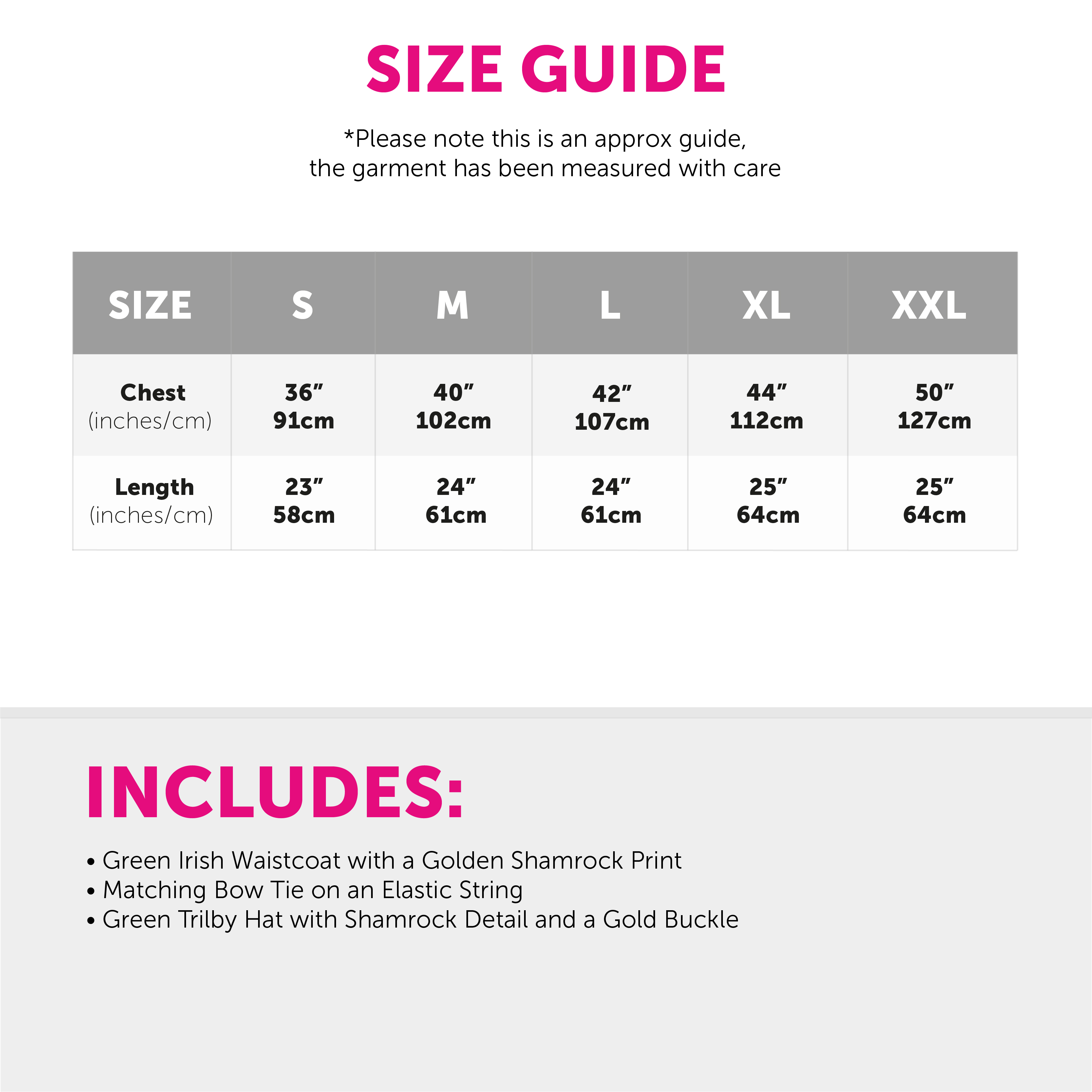 AVAILABLE IN MULTIPLE SIZES: The Irish Waistcoat Costume is available in multiple sizes from Small to XX-Large: Small - Chest 36" (91cm), Length 23" (58cm) | Medium - Chest 40" (102cm), Length 24" (61cm) | Large - Chest 42" (107cm), Length 24" (61cm) | X-Large - Chest 44" (112cm), Length 25" (64cm) | XX-Large - Chest 50" (127cm), Length 25" (64cm)
