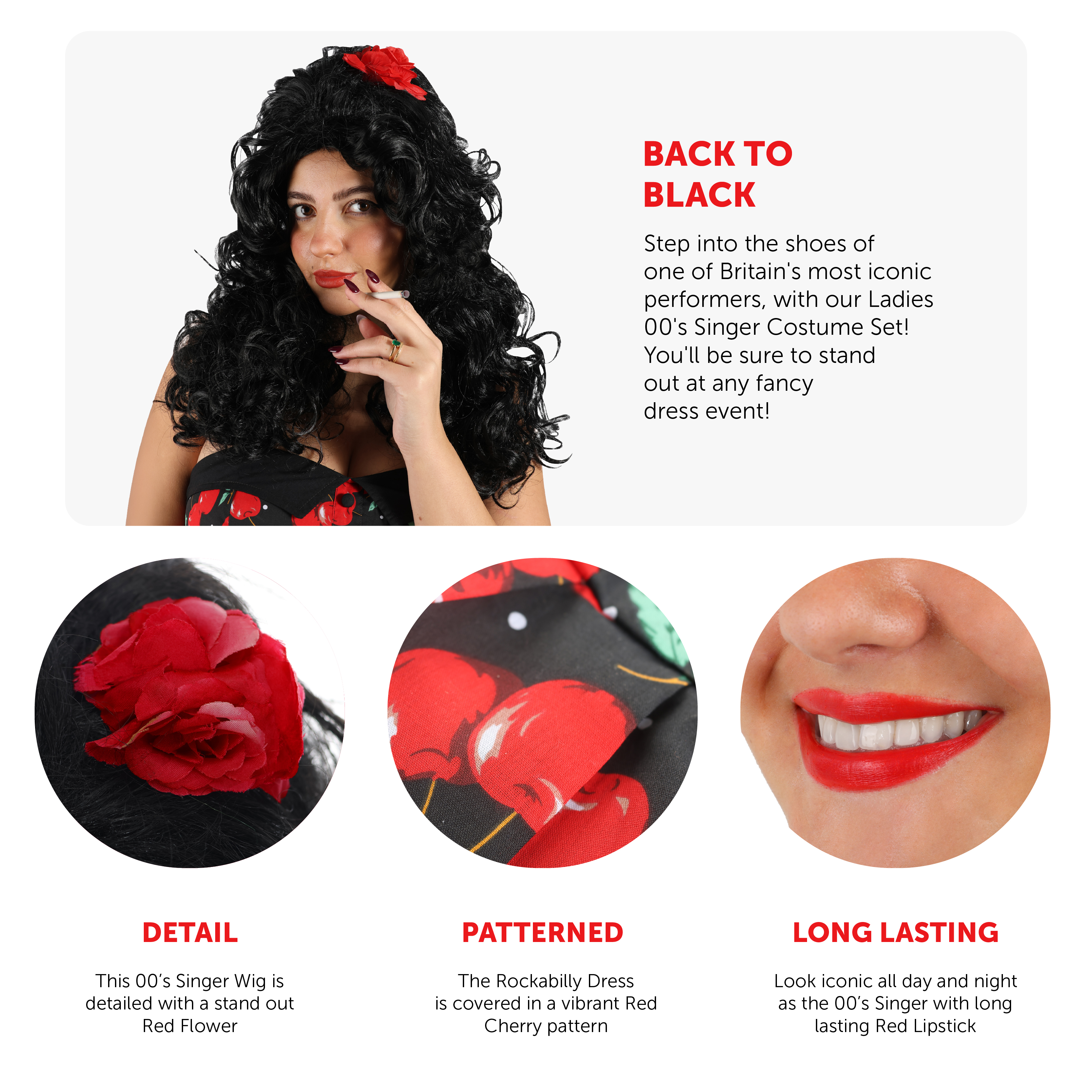 COSTUME INCLUDES: This Ladies 00's Singer Costume includes a glamorous looking Long Curly Black Wig, styled into a stand out Beehive and detailed with a Red Flower, a Black Rockabilly style Dress with Red Cherry pattern, Fake Cigarettes, and Funki Red Lipstick, the perfect addition to your music themed fancy dress costume!