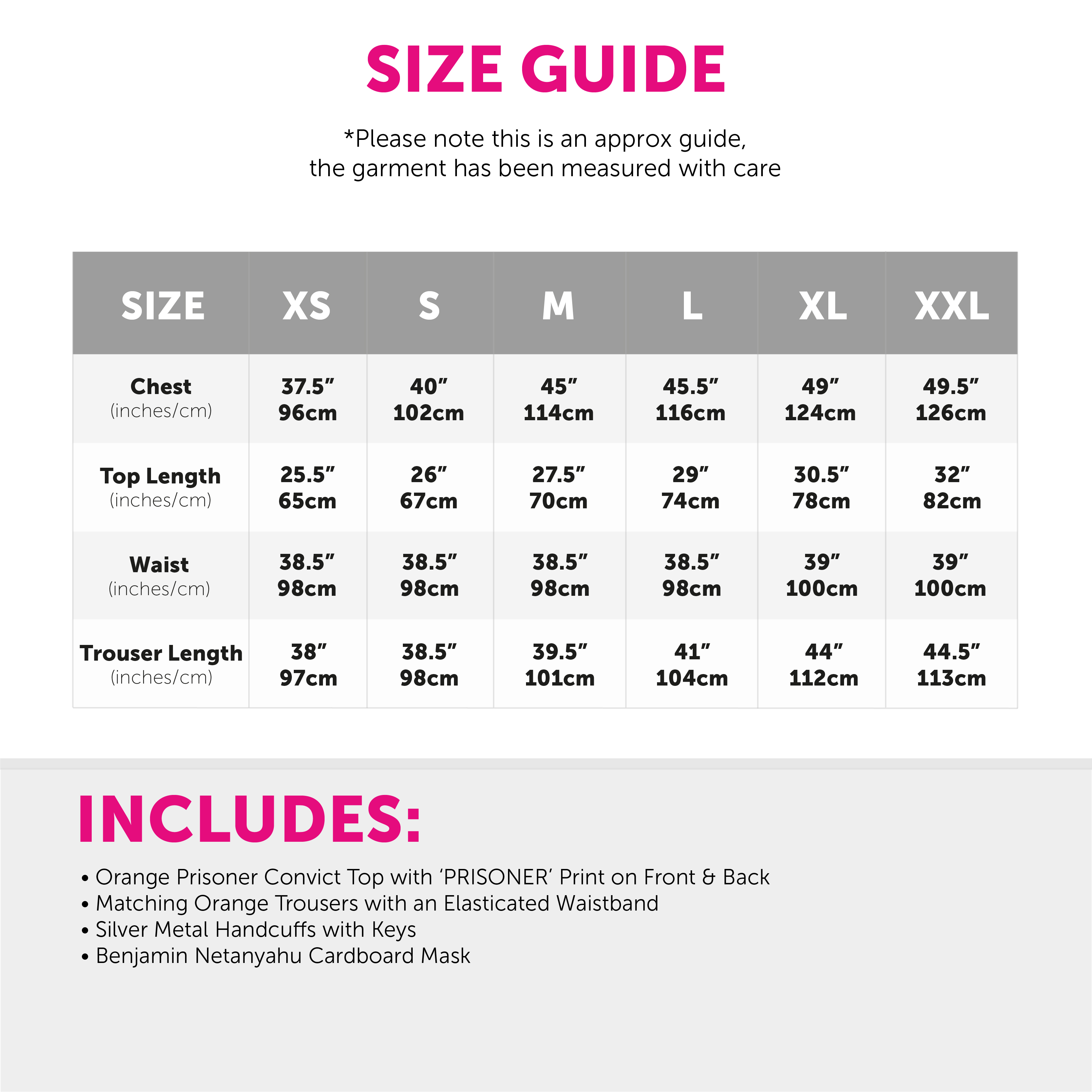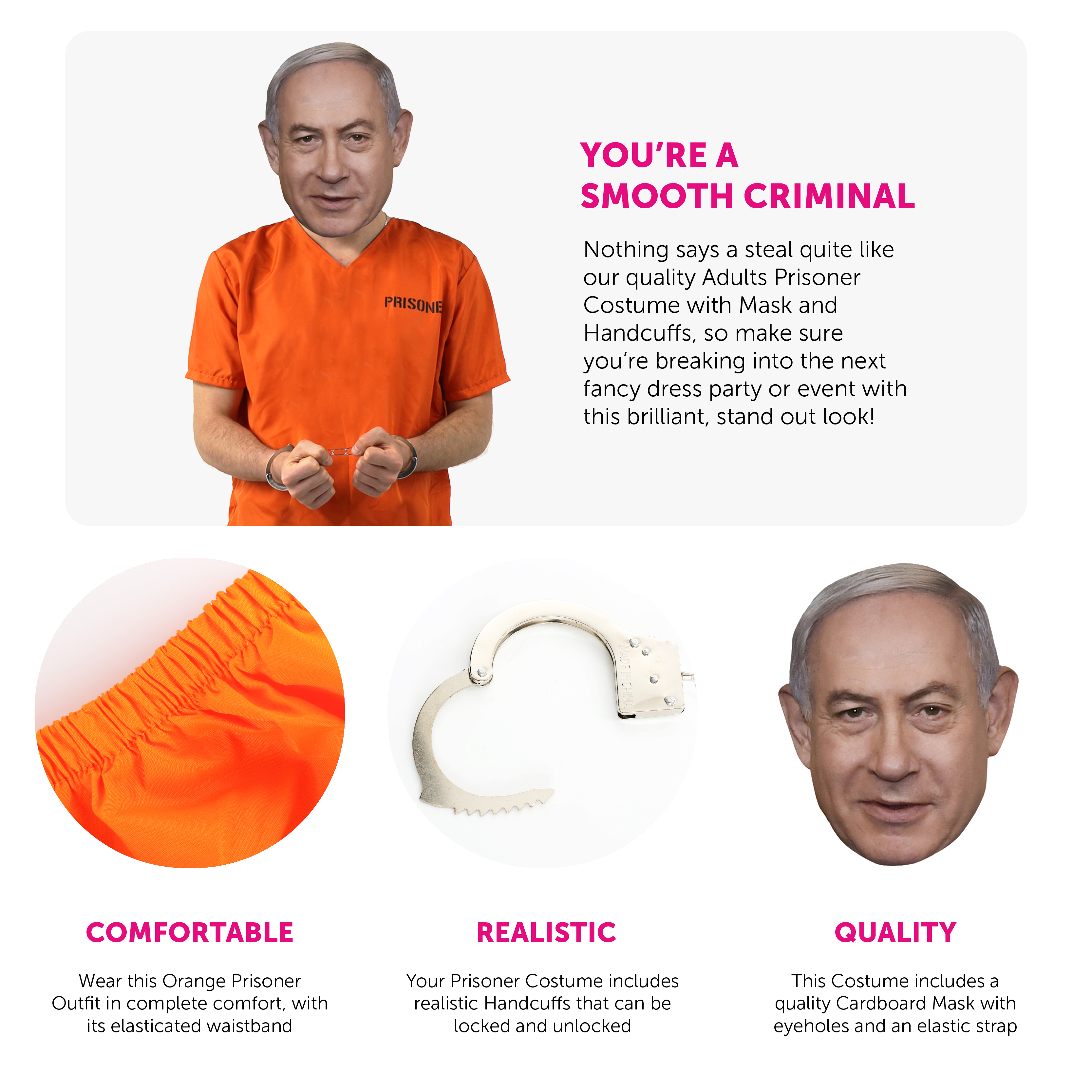 COSTUME INCLUDES: This Costume includes an Orange Prisoner Convict Top with ‘PRISONER’ printed on the front and back, with matching Orange Trousers, Metal Handcuffs with a set of keys, and a Cardboard Benjamin Netanyahu Mask, the perfect look for any fancy dress event!