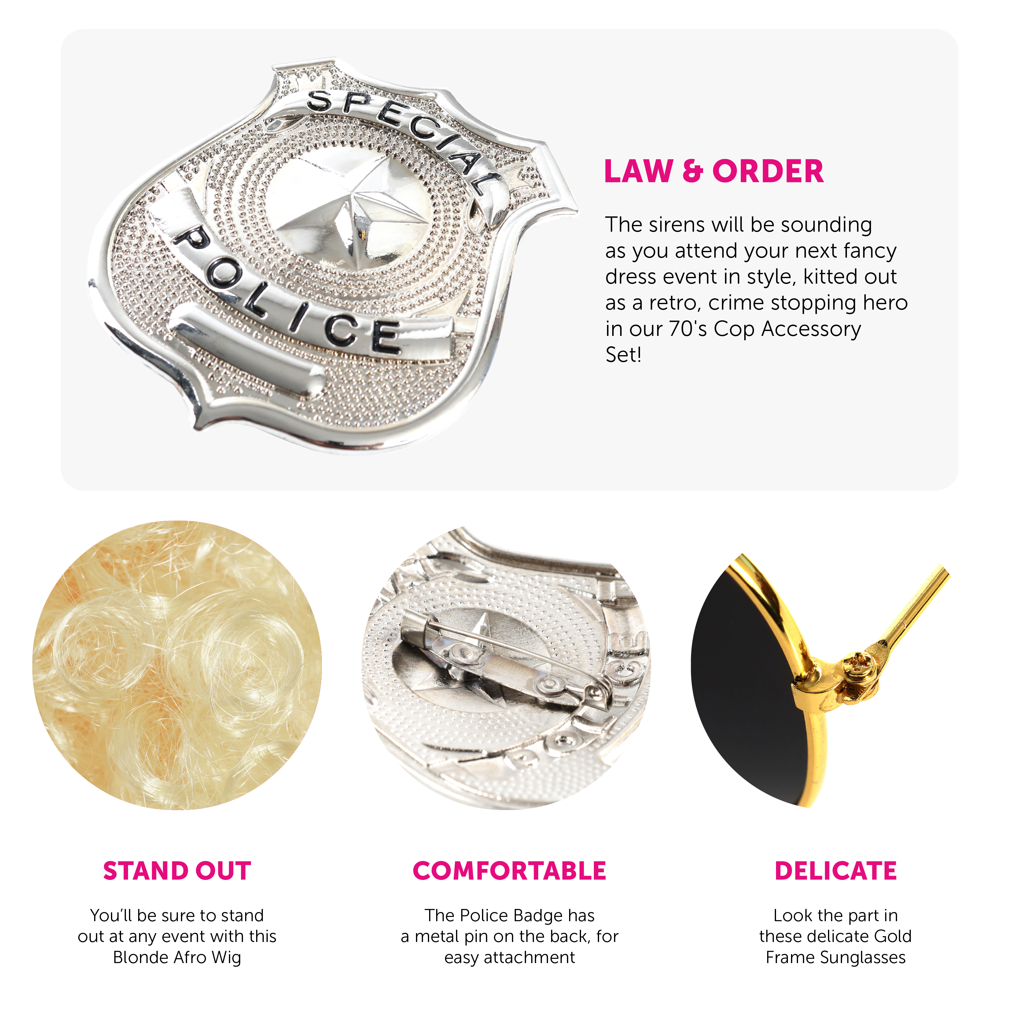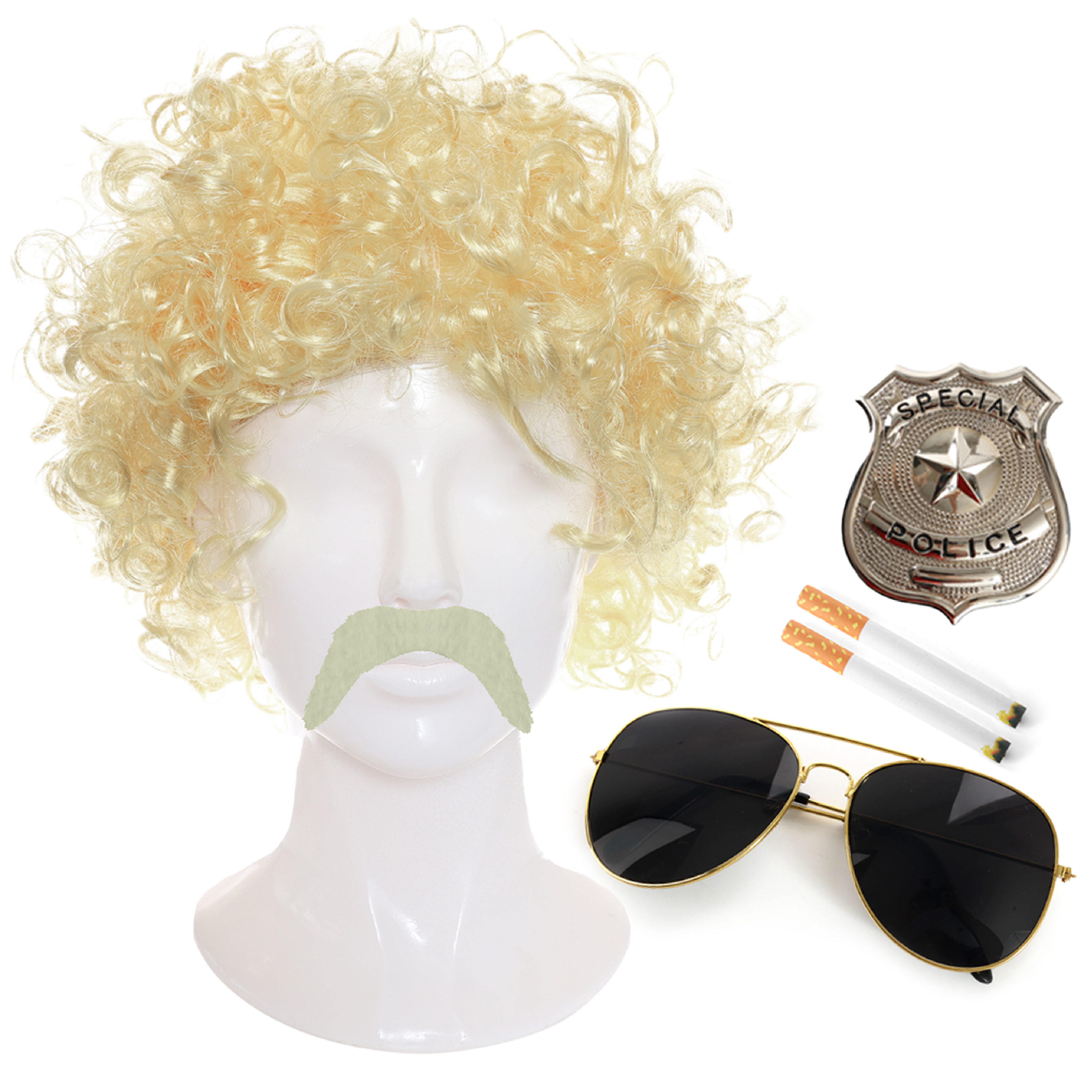 COP SET INCLUDES: Your 70's Cop Accessory Set includes a Blonde Afro Wig, an Adhesive Blonde Moustache, Sunglasses, 2x Fake Cigarettes, and a Silver Metal Police Badge with a pin for easy attachment, the perfect accessory set to add to your Fancy Dress Costume!